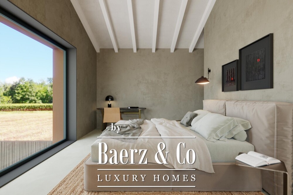 يصعد الدرج الخشبي إلى الطابق العلوي حيث توجد غرفتا نوم مشرقان، كل واحدة بحمام داخلي وتطل من خلال نوافذ بانورامية على المساحات الخضراء المحيطة، بينما تفتح إحدى الغرف على شرفة خاصة تطل على المشهد الطبيعي الأخضر. يوفر نظام تدفئة أرضية يُدار بمضخة حرارية هواء-ماء مع منظمات حرارة متعددة المناطق راحة مثالية، إلى جانب أربعة أجهزة تكييف مخفية بعناية. تتوسط الحديقة الهادئة بركة سباحة بمساحة 37 مترًا مربعًا، تحدها نباتات محلية تعكس رقي المنزل الهادئ.