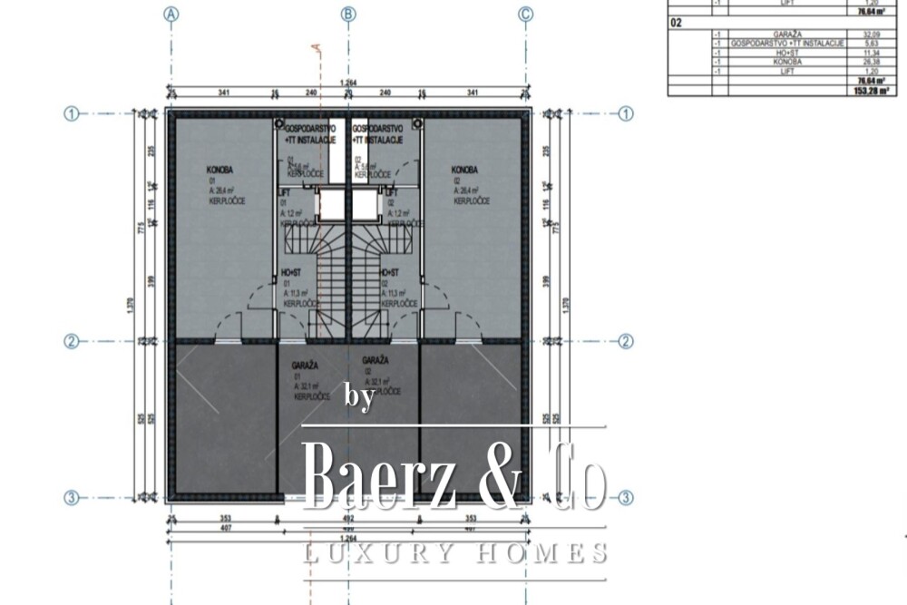 يمتد العقار على ثلاثة مستويات متصلة بسلاسة بواسطة مصعد خاص. يحتوي القبو على مرآب بمساحة 32 م² وغرفة طعام تقليدية (تافرنا) بمساحة 26 م² بالإضافة إلى غرفة فنية، مما يلبي الاحتياجات العملية والترفيهية معًا. في الطابق الأرضي، تندمج المطبخ ومنطقة الطعام وغرفة المعيشة بانسيابية مع التراس الخارجي، حيث يبرز المسبح الخاص، ومنصة التشمس، والبرجولا لتأطير المنظر ودعم أسلوب الحياة المتوسطي الهادئ. كل واحدة من غرف النوم الأربع متصلة بحمام خاص، ويتميز الجناح الرئيسي بإمكانية الوصول المباشر إلى الشرفة وإطلالة مفتوحة على كوسترينا والبحر.