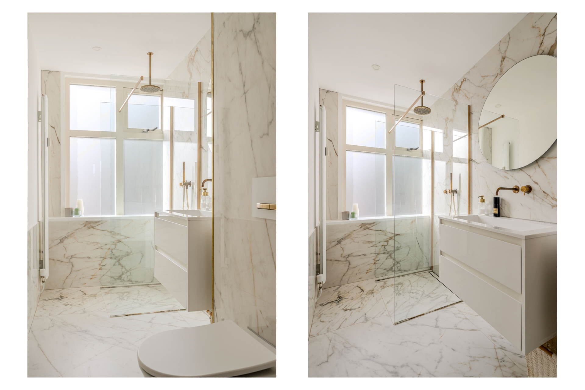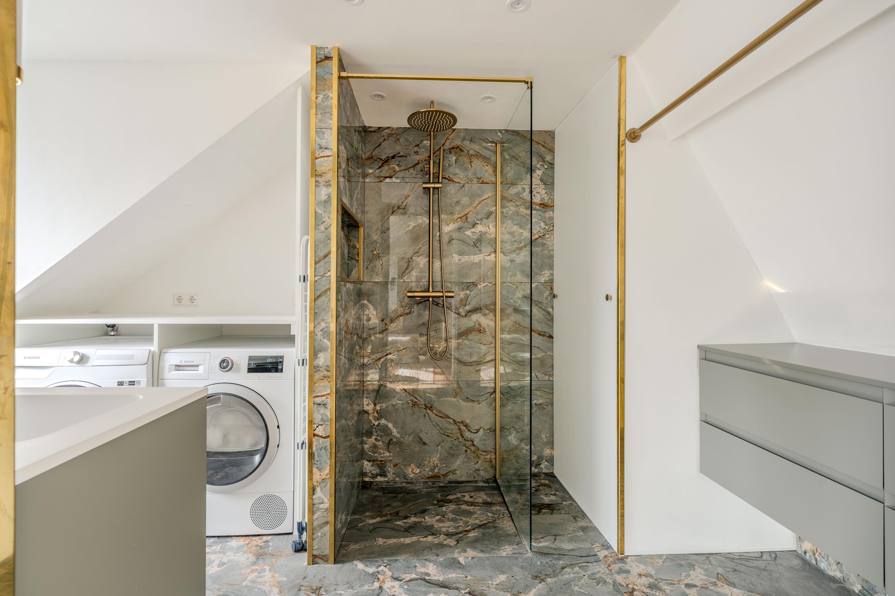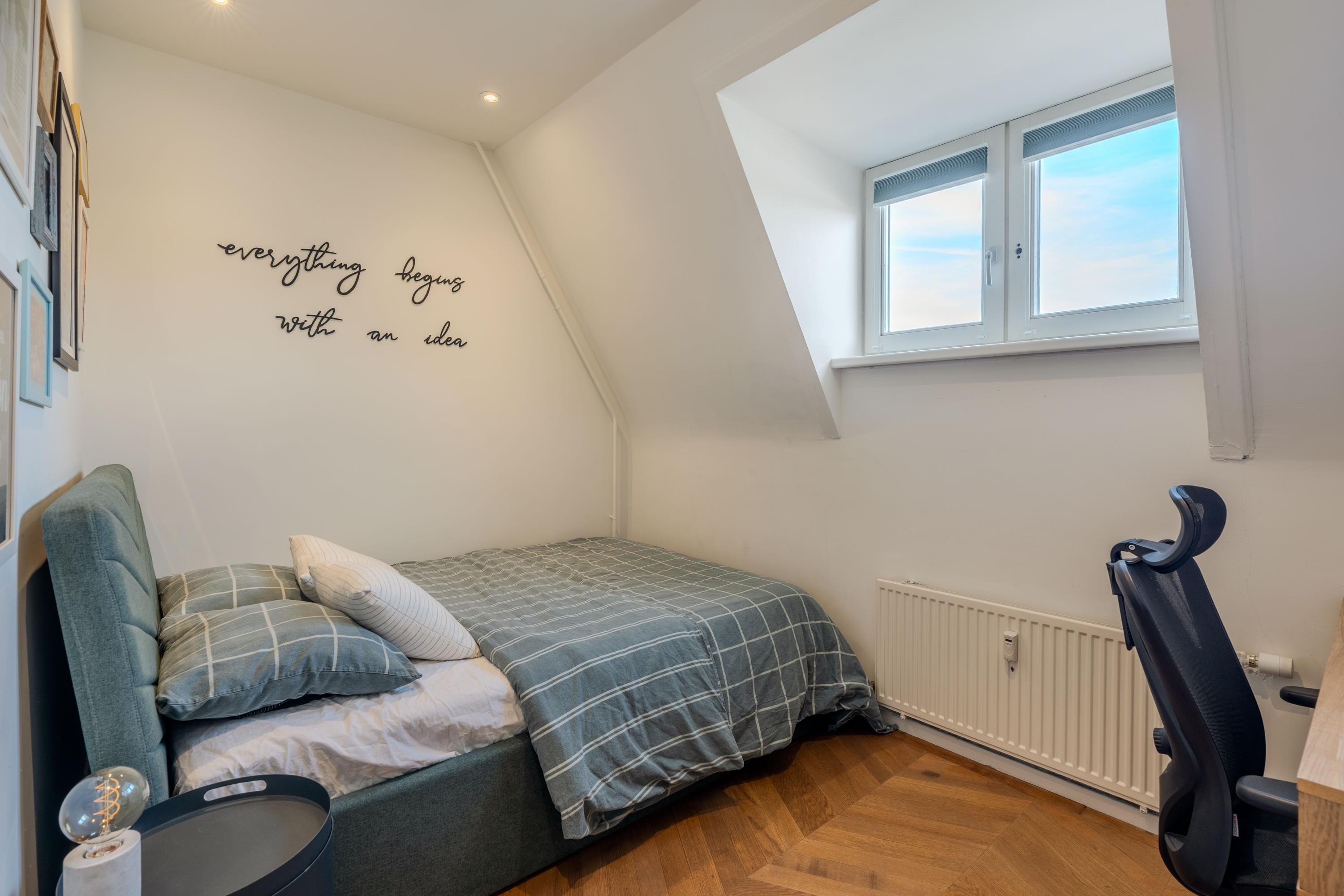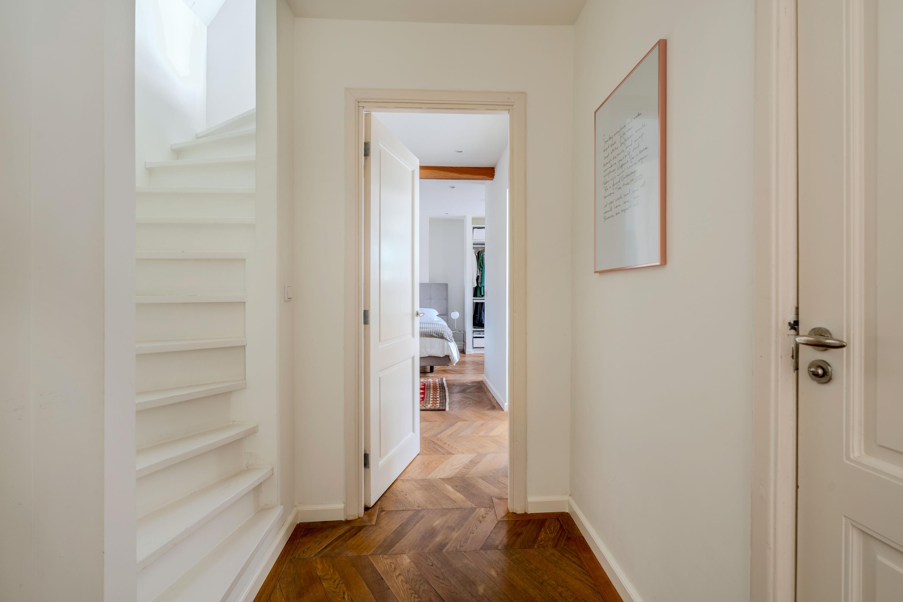 Das Hauptwohngeschoss betreten Sie über einen privaten Eingang mit Treppenhaus und gelangen in ein weitläufiges Wohnzimmer mit Erker, originalem Kamin und maßgefertigten Einbauschränken. Im hinteren Bereich befindet sich eine großzügige Wohnküche, die um eine Kücheninsel angeordnet ist und über moderne Geräte wie Induktionskochfeld, Kombi-Ofen, Kühlschrank, Gefrierschrank und Geschirrspüler verfügt. Eine stilvolle Bar mit klimatisierten Weinschränken sorgt für ein gehobenes Ambiente bei Empfängen, während Schiebetüren auf einen ruhigen Balkon führen. Mit vier Schlafzimmern und drei Bädern bietet das Apartment Komfort und Flexibilität für Familie oder Gäste. Das oberste Stockwerk beeindruckt mit einem neu eingebauten Dachgaubenfenster, das viel Tageslicht und vielseitigen Raum für Schlafzimmer oder Studio schafft. Das Highlight des Hauses ist die 43 m² große Dachterrasse, auf der der Rhythmus der Stadt in einen freien Ausblick übergeht.