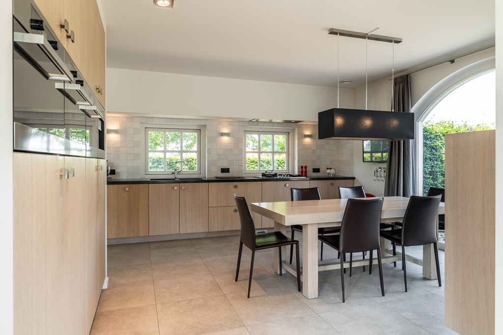 De woonkeuken is uitgevoerd in een rechte opstelling met een wand vol met apparatuur van Miele. De keuken is voorzien van een inbouwkoffiemachine, stoomoven, bakoven, magnetron, vaatwasser, koelkast, vriezer, 4-pits gaskookplaat met wok brander, afzuigkap en een dubbele gootsteen met Quooker. Door het gebruik van natuursteen en hout heeft deze keuken een landelijk karakter.