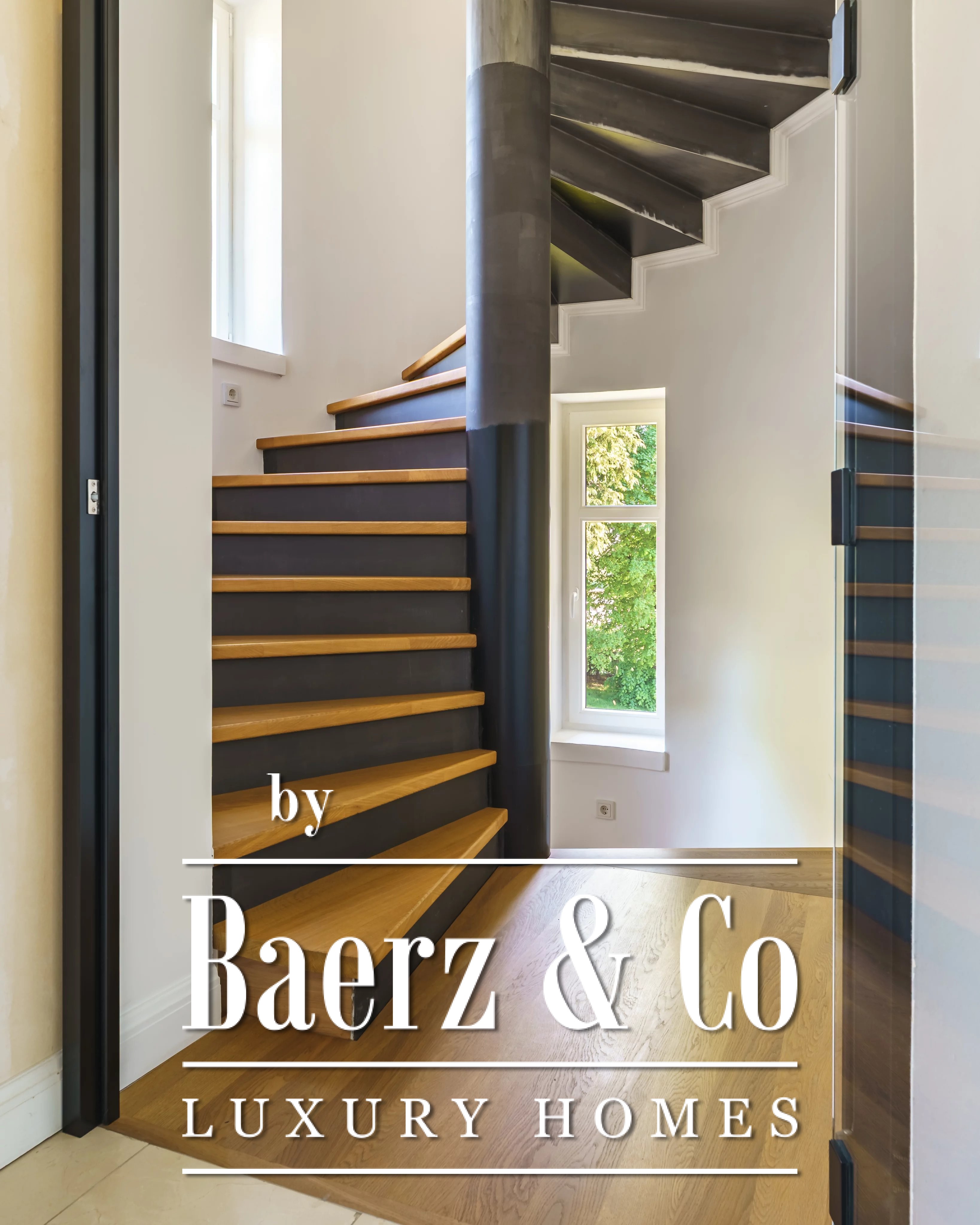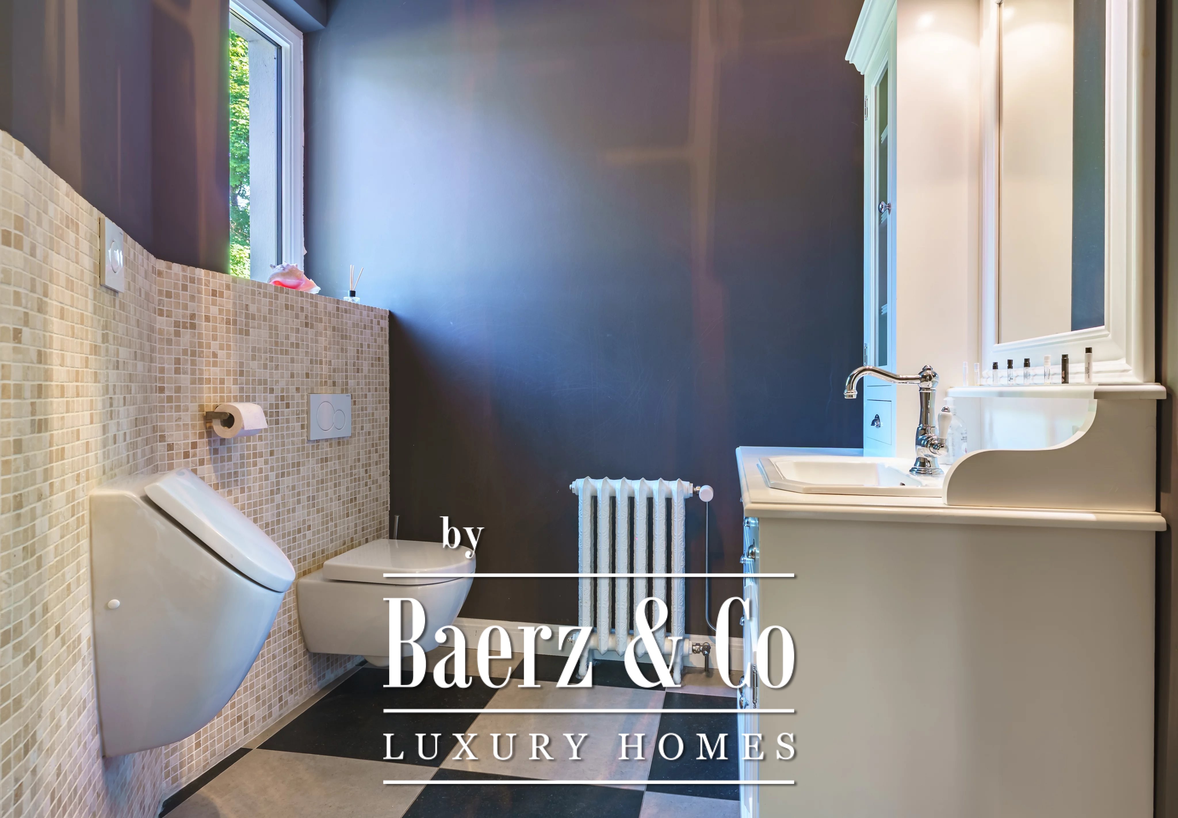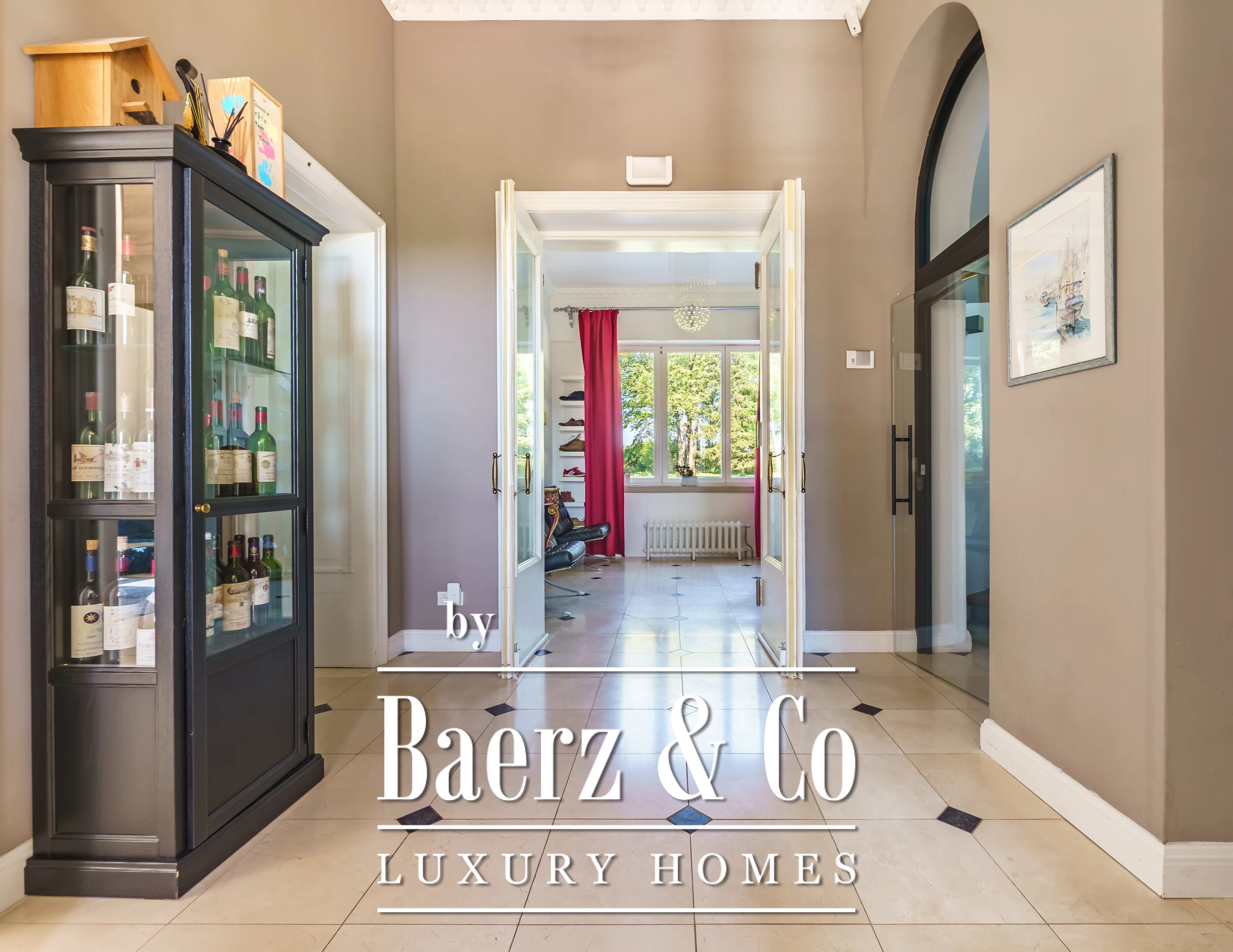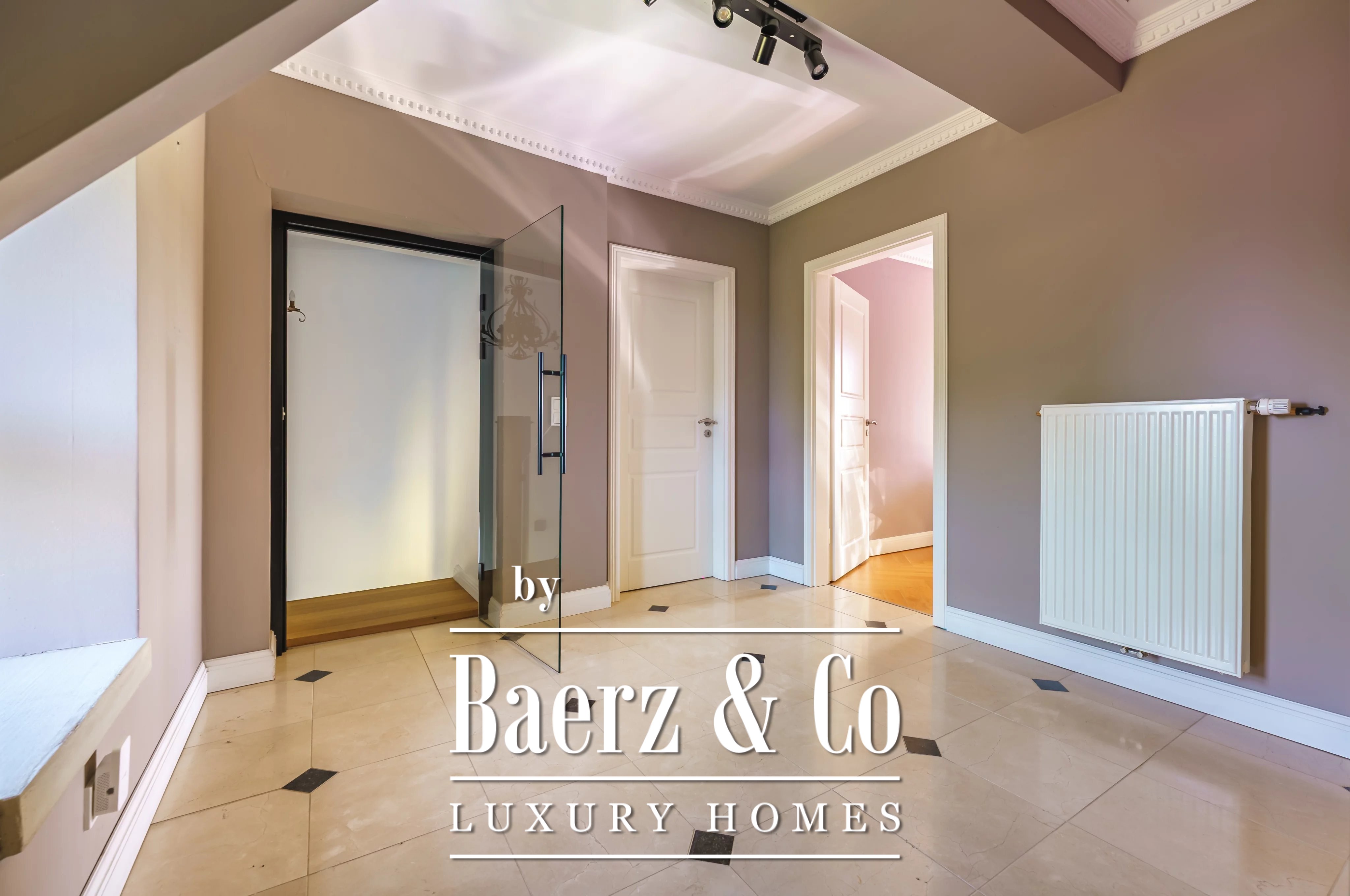 Fünf Schlafzimmer und drei Bäder verteilen sich harmonisch auf zwei obere Etagen, darunter eine exklusive Master Suite mit Ankleidezimmer und eigenem Bad. Im Untergeschoss vereinen sich funktionale Räume: Holzlager, Weinkeller, Werkstatt, Waschküche und eine Einzelgarage.