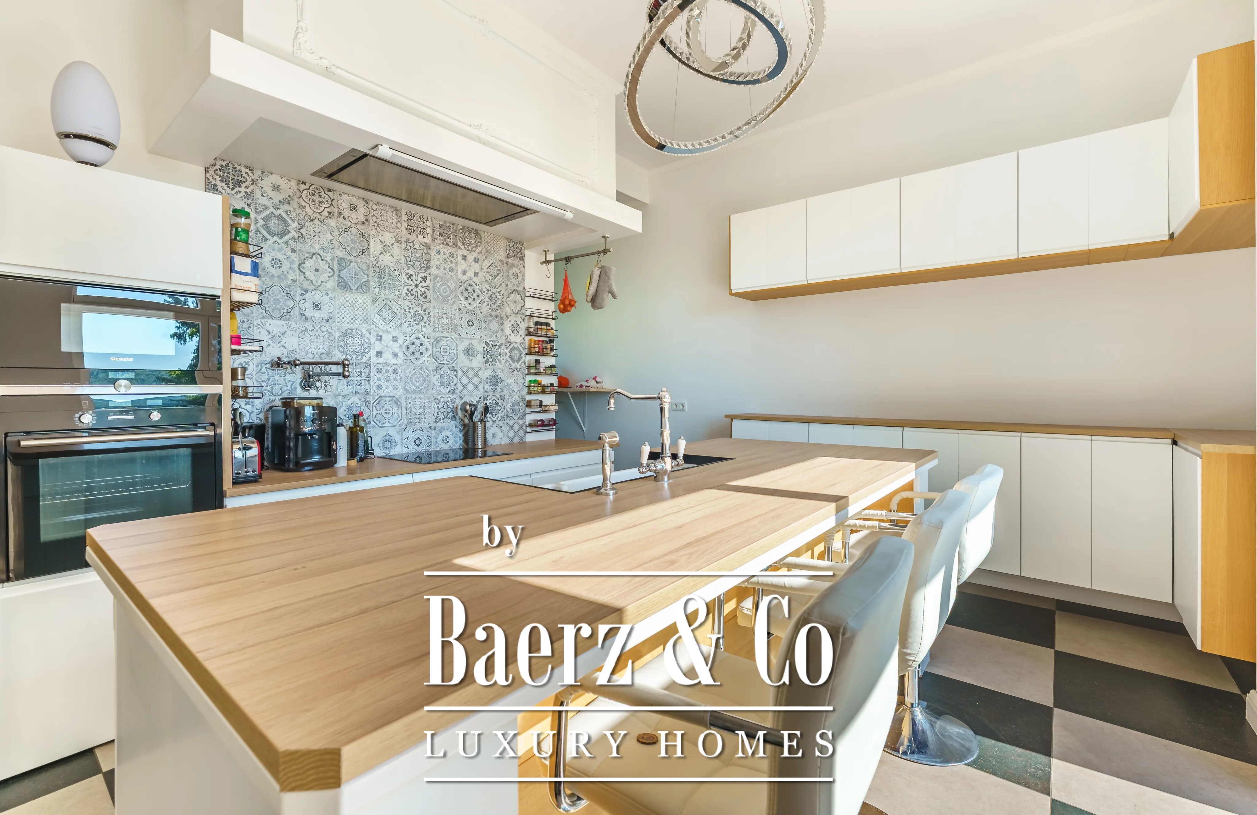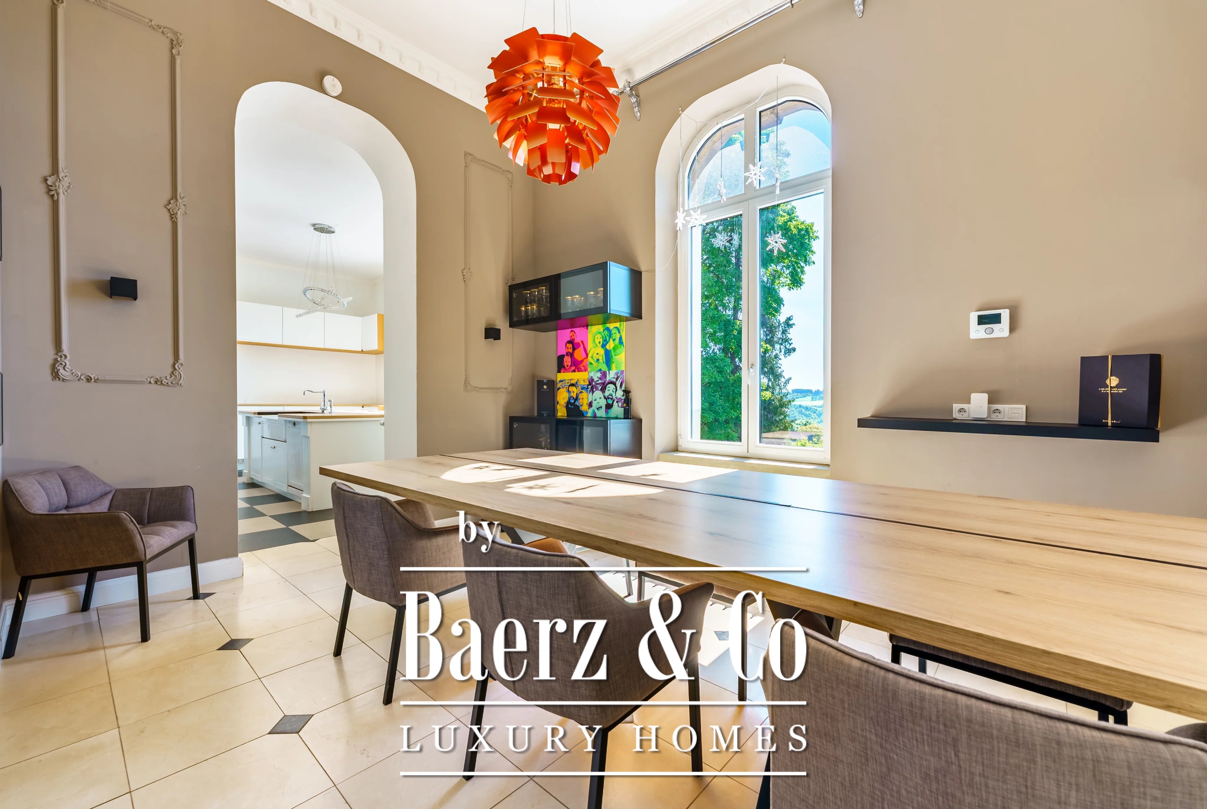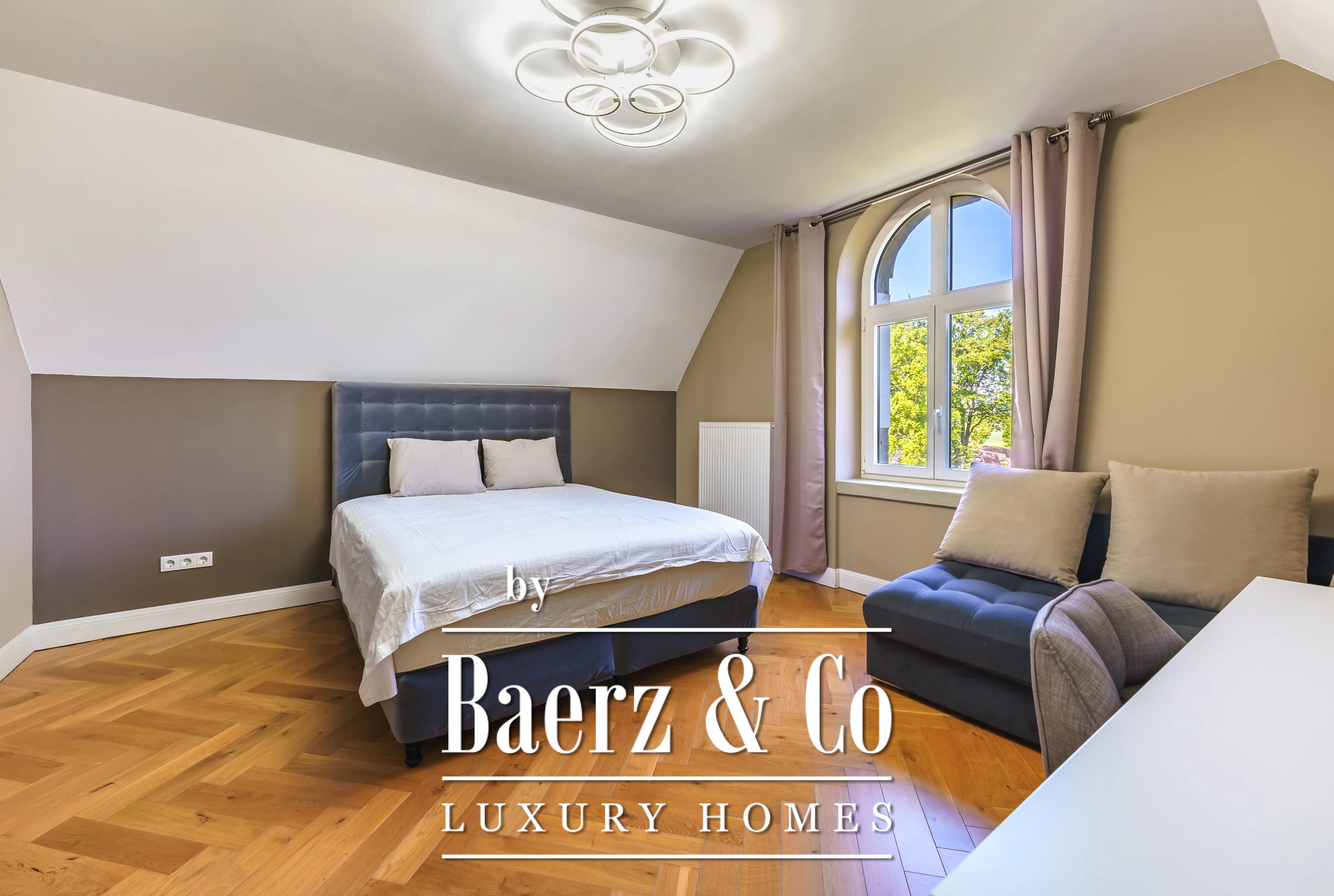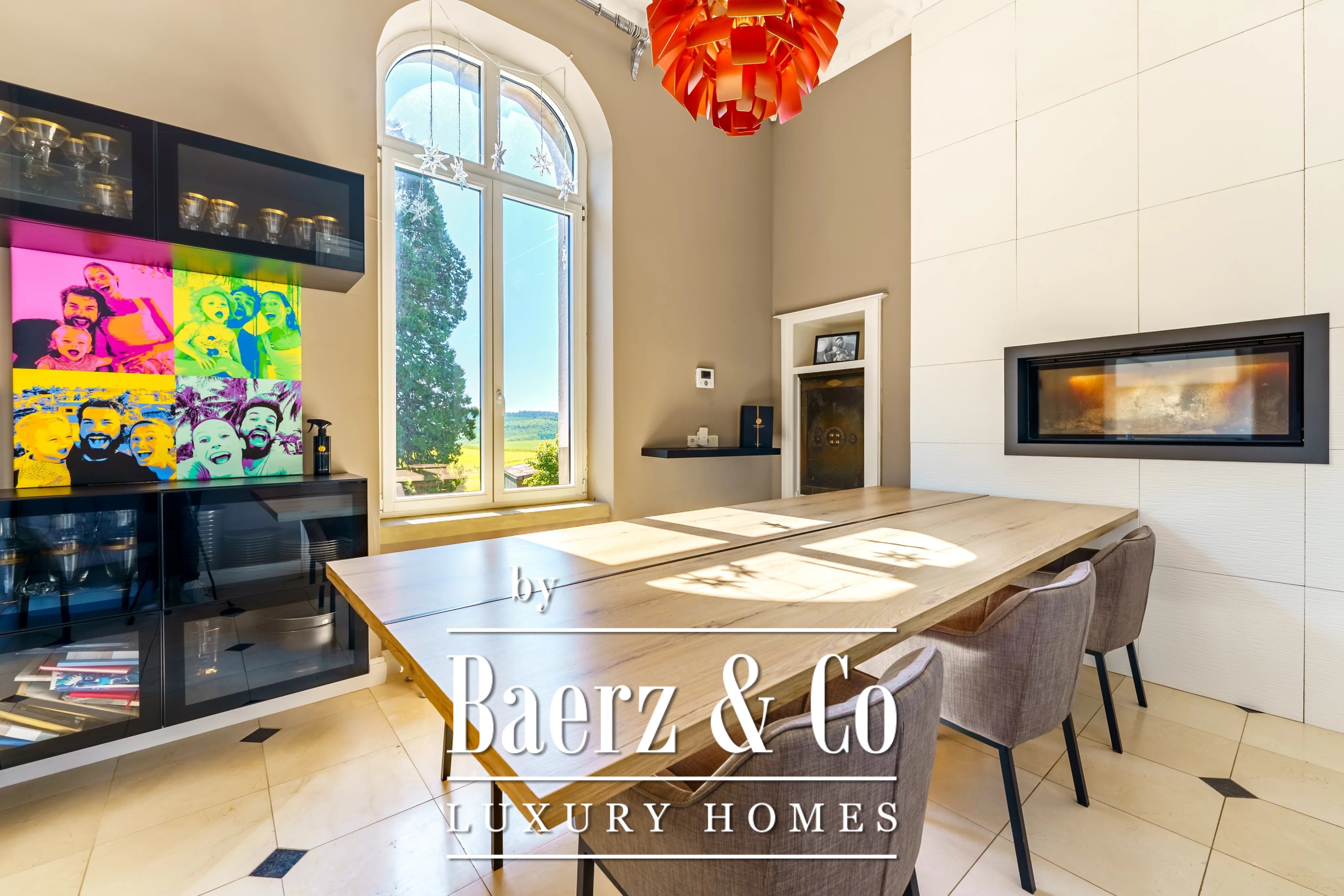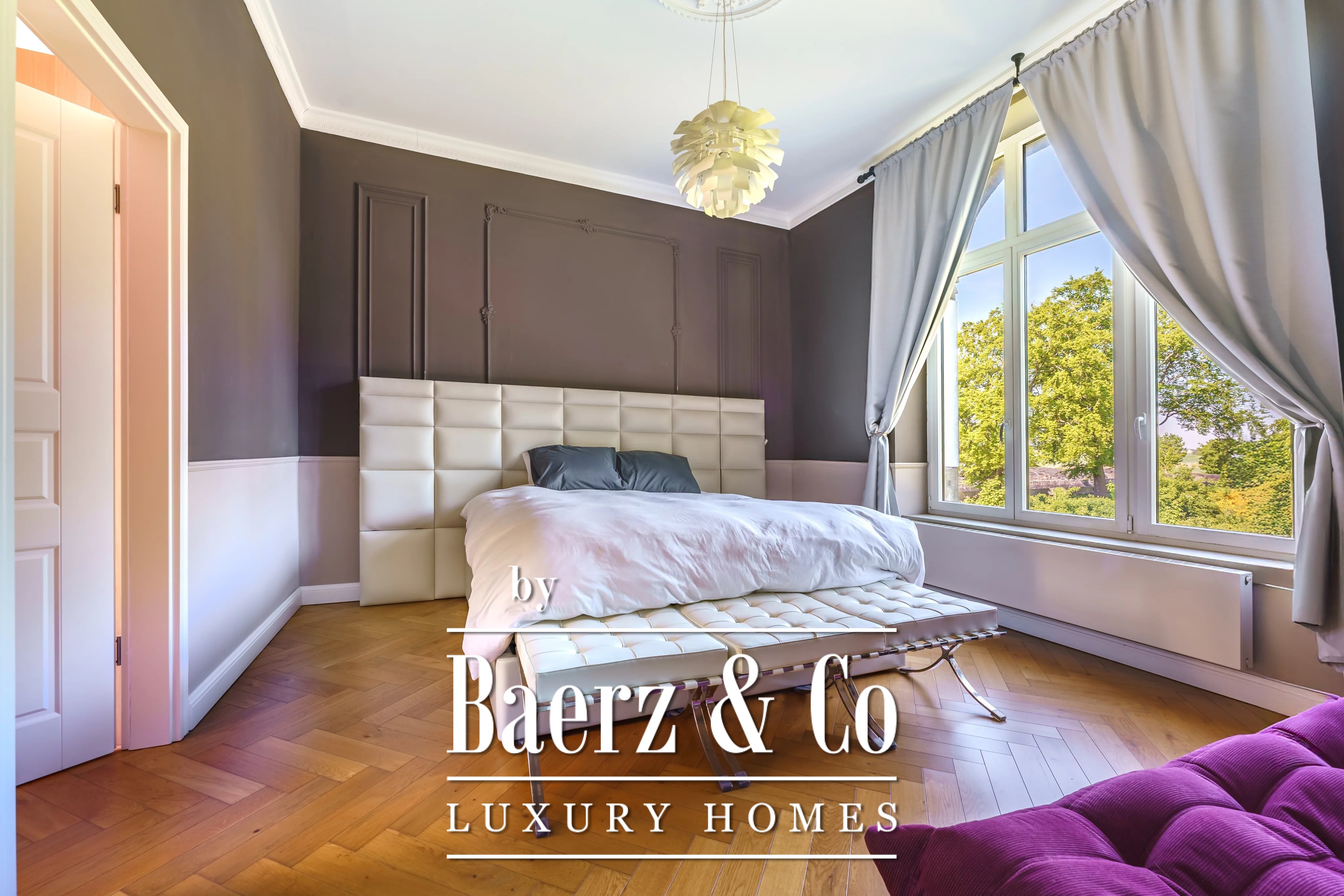 Fünf Schlafzimmer und drei Bäder verteilen sich harmonisch auf zwei obere Etagen, darunter eine exklusive Master Suite mit Ankleidezimmer und eigenem Bad. Im Untergeschoss vereinen sich funktionale Räume: Holzlager, Weinkeller, Werkstatt, Waschküche und eine Einzelgarage.