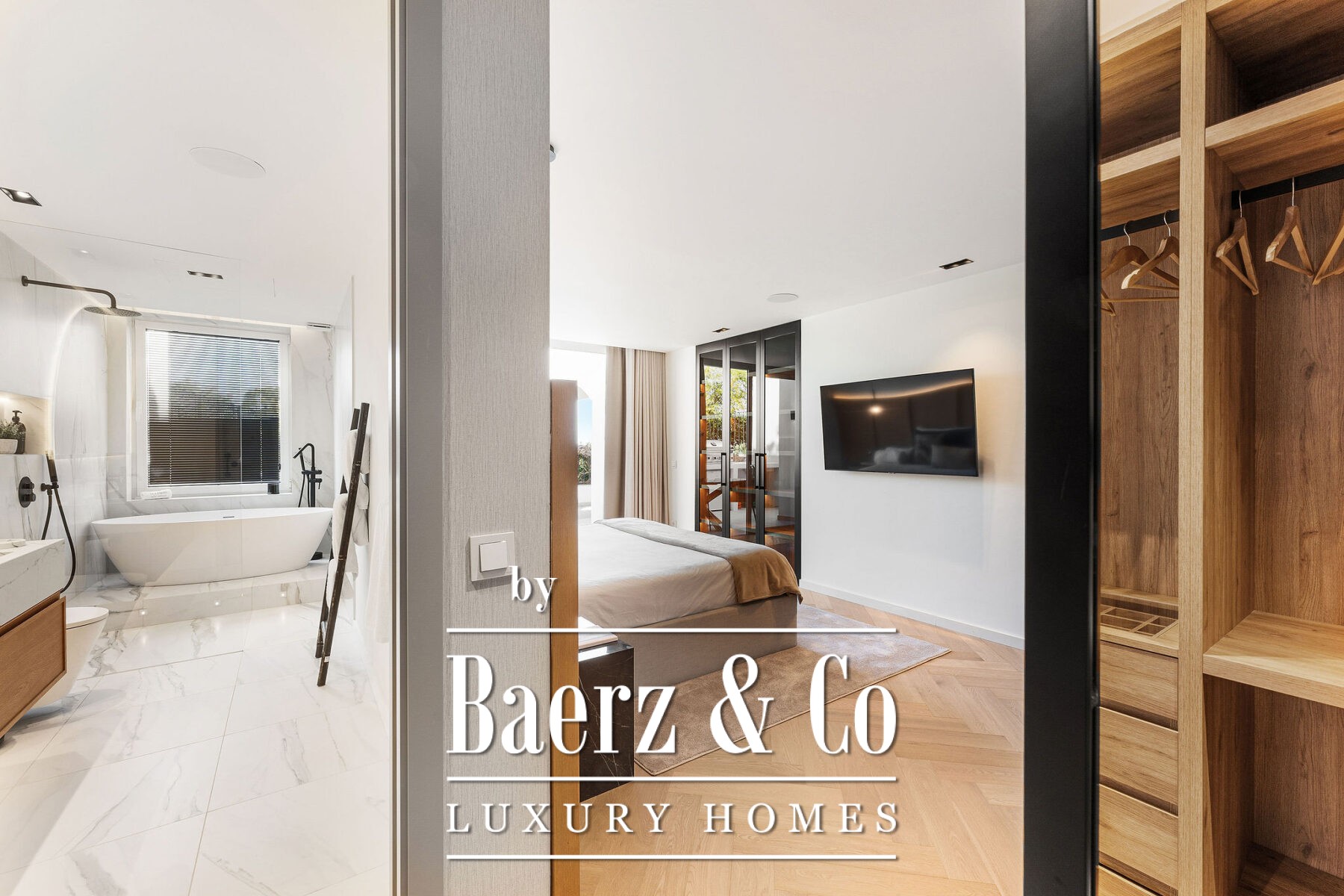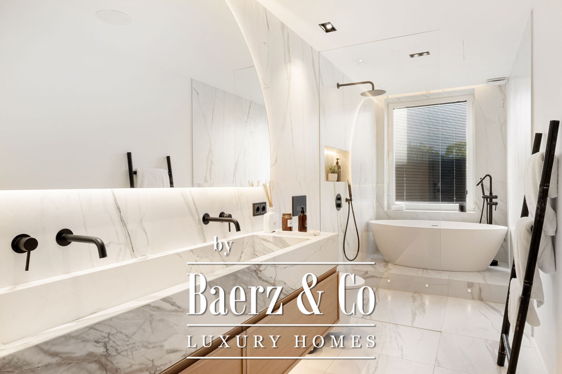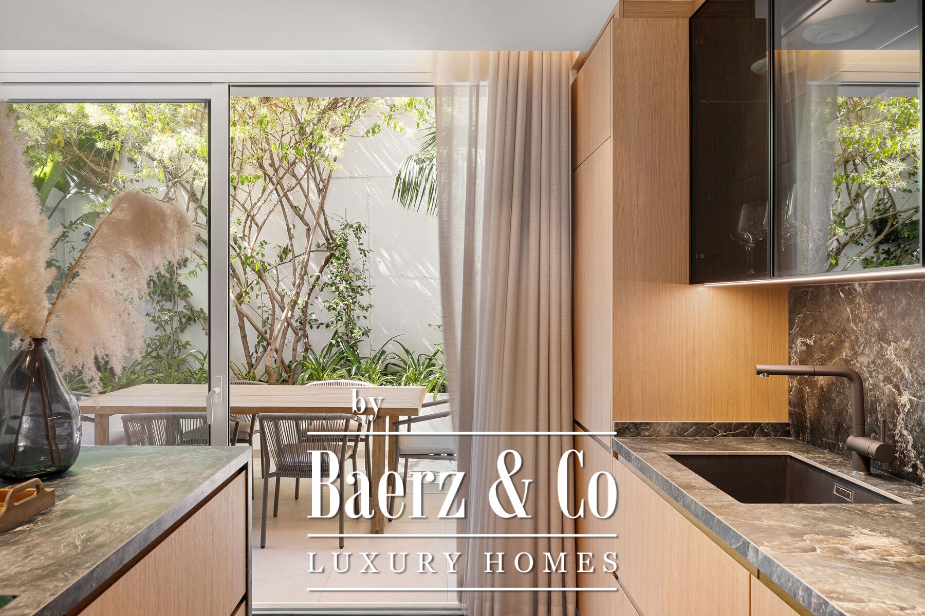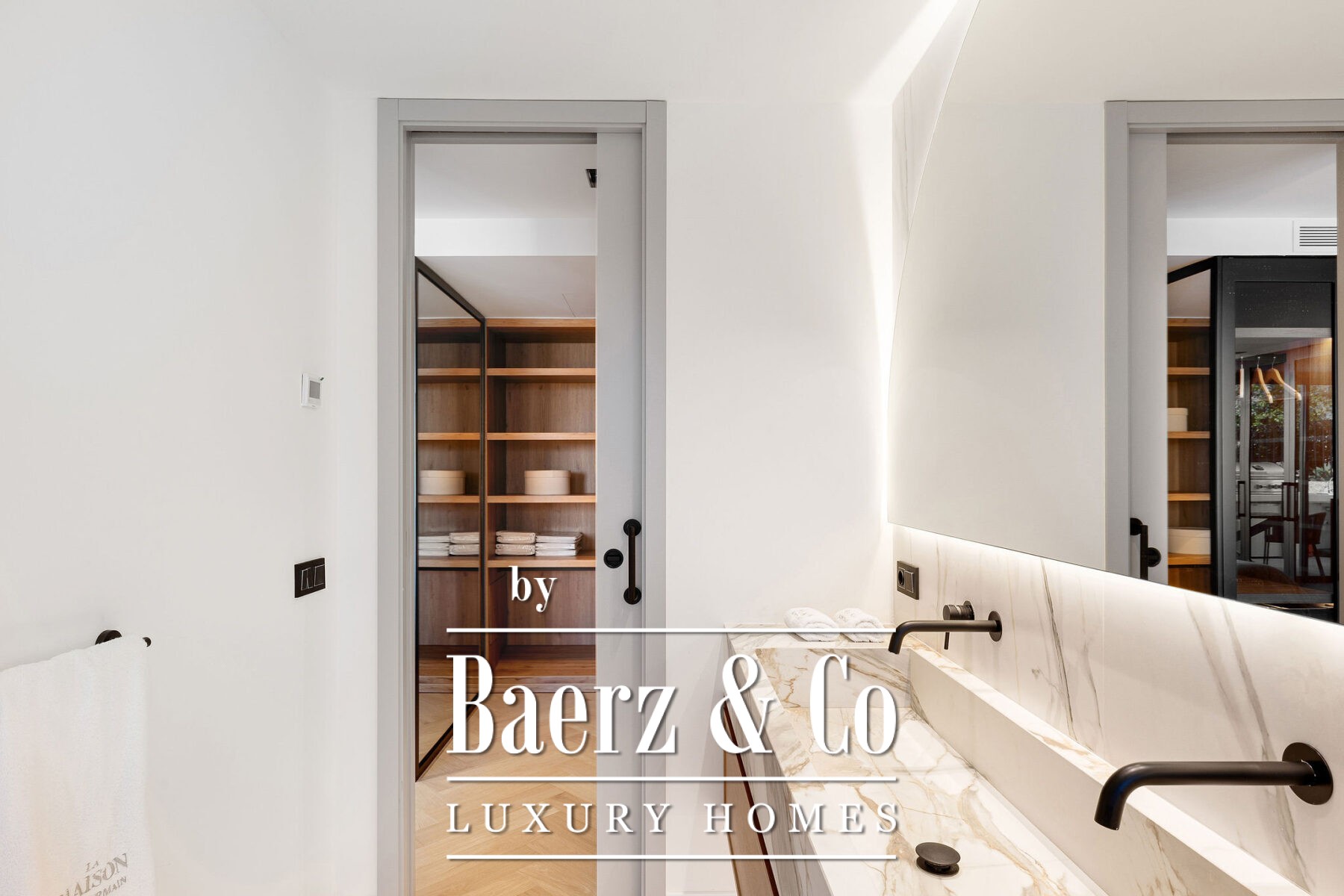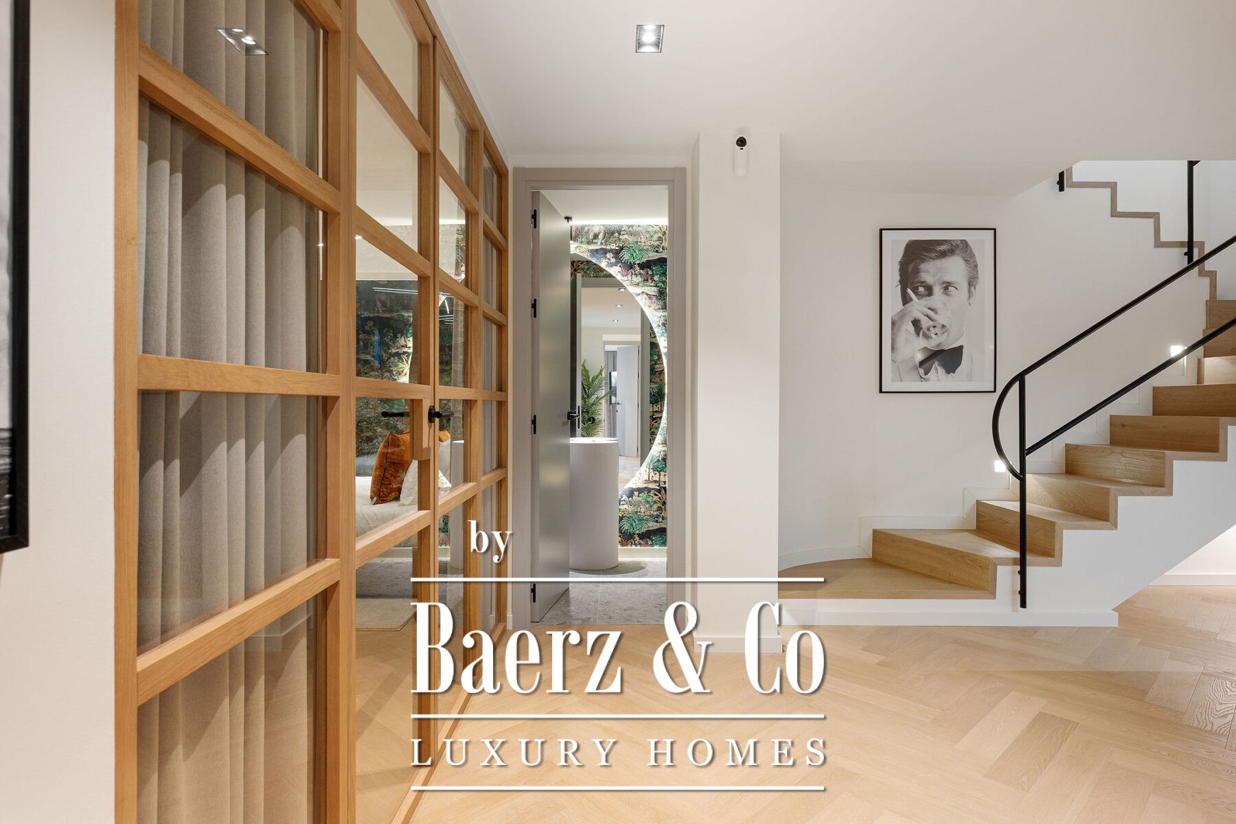 Im Erdgeschoss verstärkt Tageslicht den offenen Wohn- und Essbereich sowie die hochmoderne Gaggenau-Küche, die jeweils durch edle Holz- und Marmorausstattungen definiert werden. Fischgrät-Parkett und eine neutrale Farbpalette verleihen Wärme und dezente Eleganz. Vom Wohnbereich aus öffnet sich eine private Terrasse, ideal für Mahlzeiten im Freien und entspannte Momente. Die prächtige Hauptsuite bietet eine großzügige Ankleide, eine freistehende Badewanne mit Blick auf die Terrasse und ein eigenes Bad. Ein weiteres Schlafzimmer auf dieser Ebene sorgt für flexible Nutzungsmöglichkeiten für Familie oder Gäste.