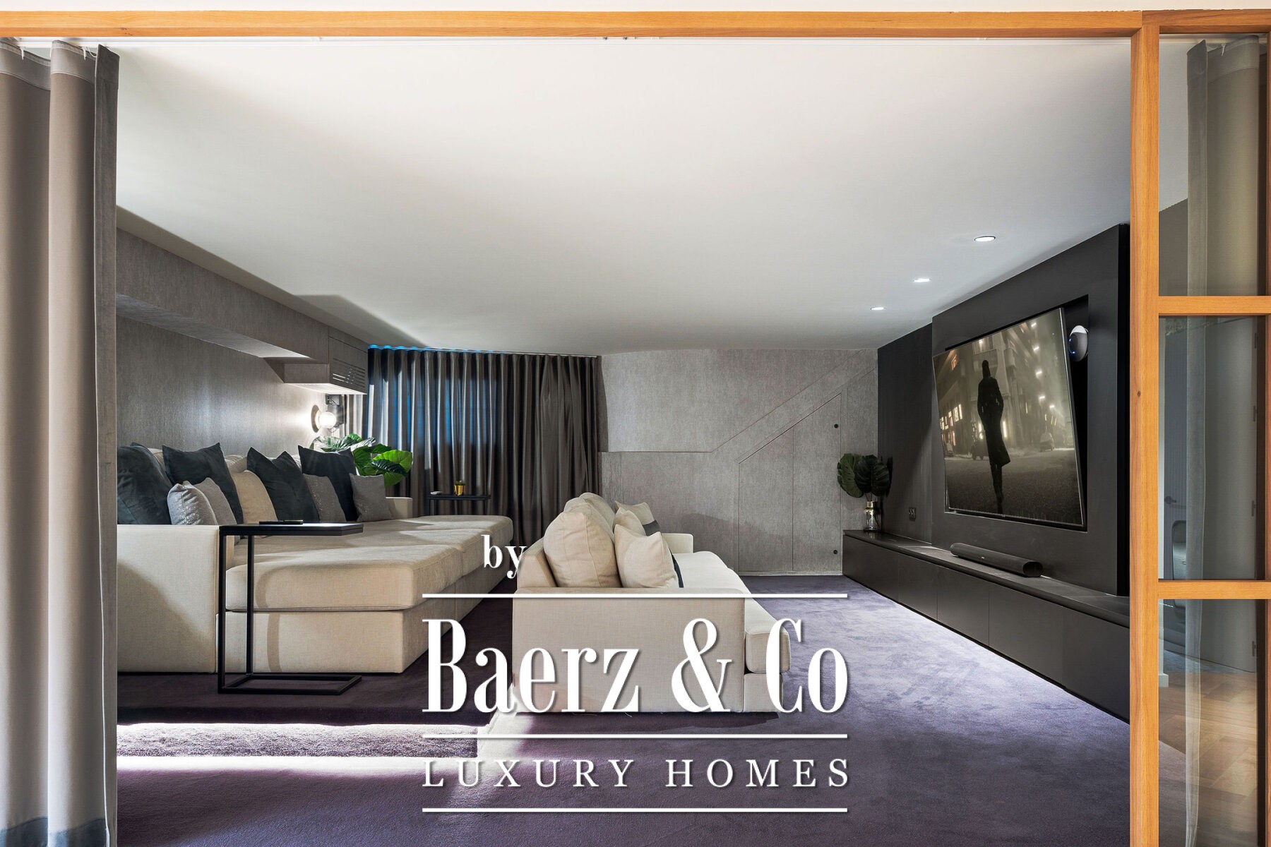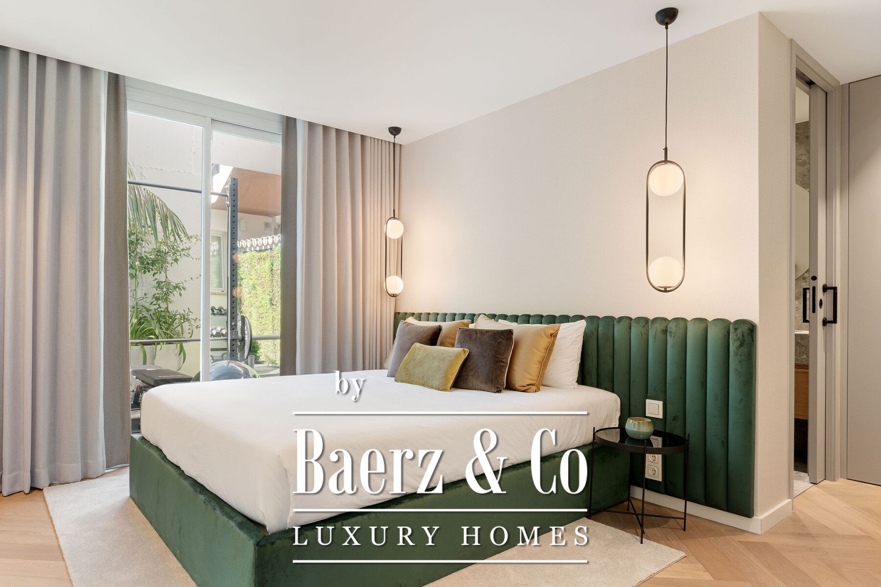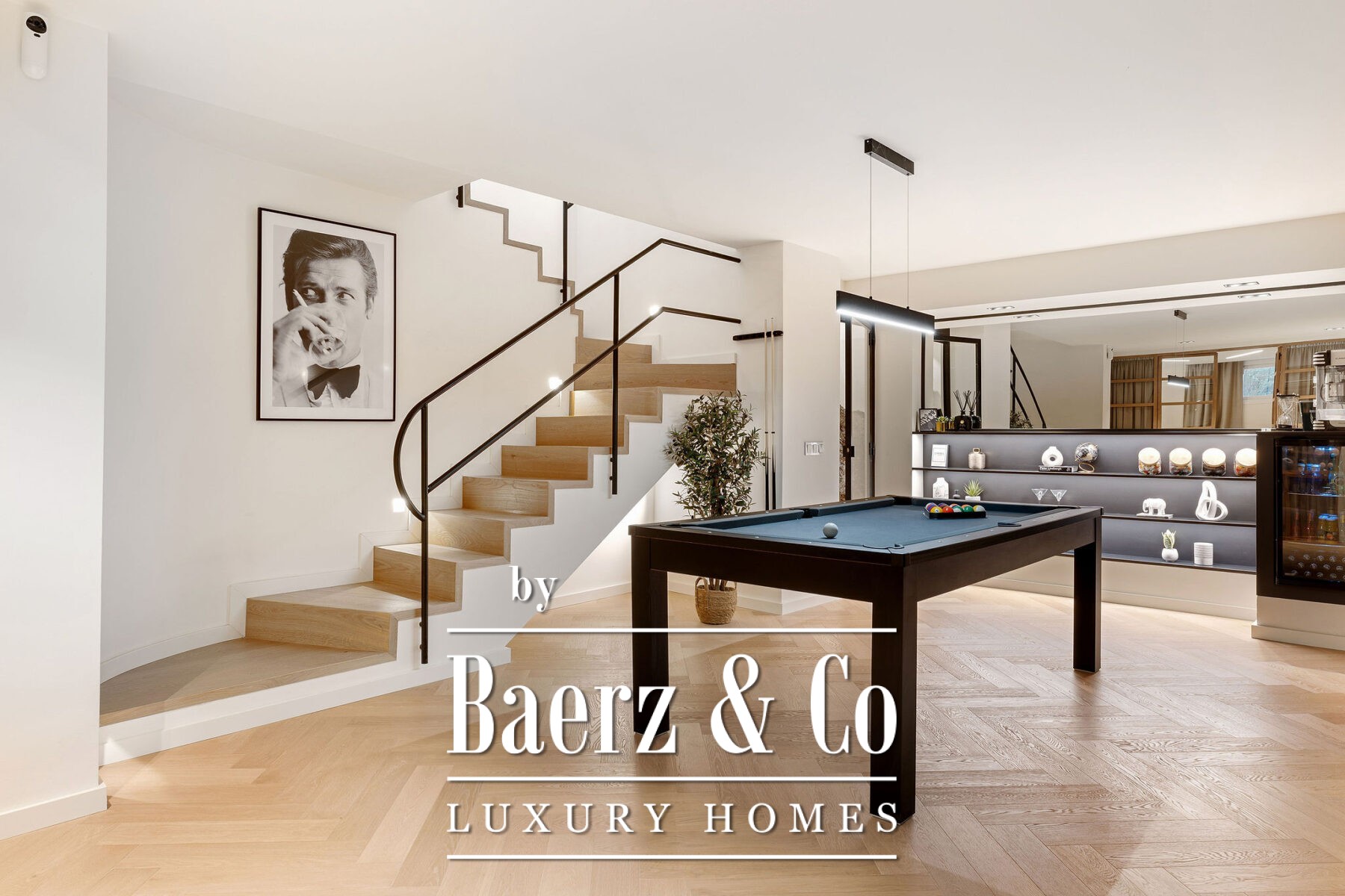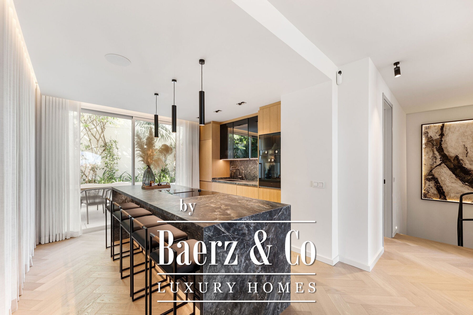 Im Erdgeschoss verstärkt Tageslicht den offenen Wohn- und Essbereich sowie die hochmoderne Gaggenau-Küche, die jeweils durch edle Holz- und Marmorausstattungen definiert werden. Fischgrät-Parkett und eine neutrale Farbpalette verleihen Wärme und dezente Eleganz. Vom Wohnbereich aus öffnet sich eine private Terrasse, ideal für Mahlzeiten im Freien und entspannte Momente. Die prächtige Hauptsuite bietet eine großzügige Ankleide, eine freistehende Badewanne mit Blick auf die Terrasse und ein eigenes Bad. Ein weiteres Schlafzimmer auf dieser Ebene sorgt für flexible Nutzungsmöglichkeiten für Familie oder Gäste.