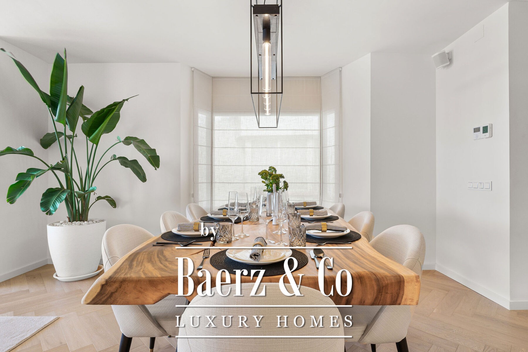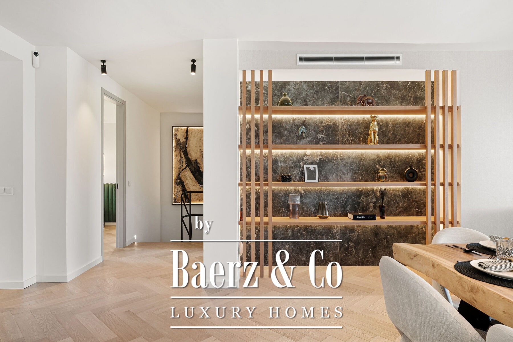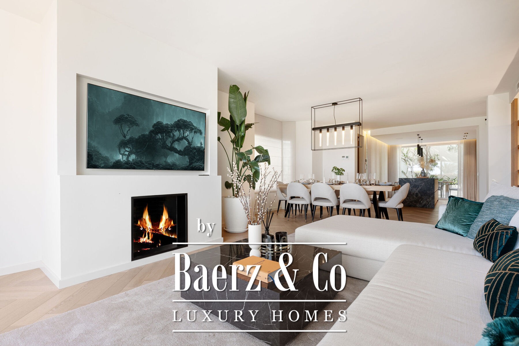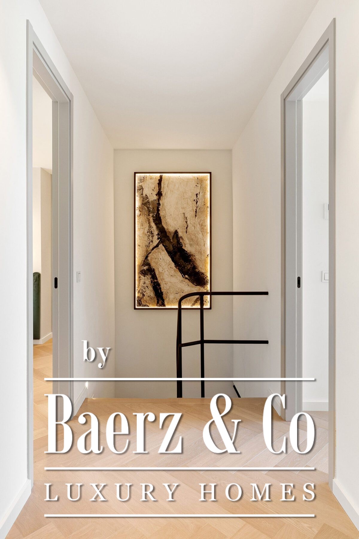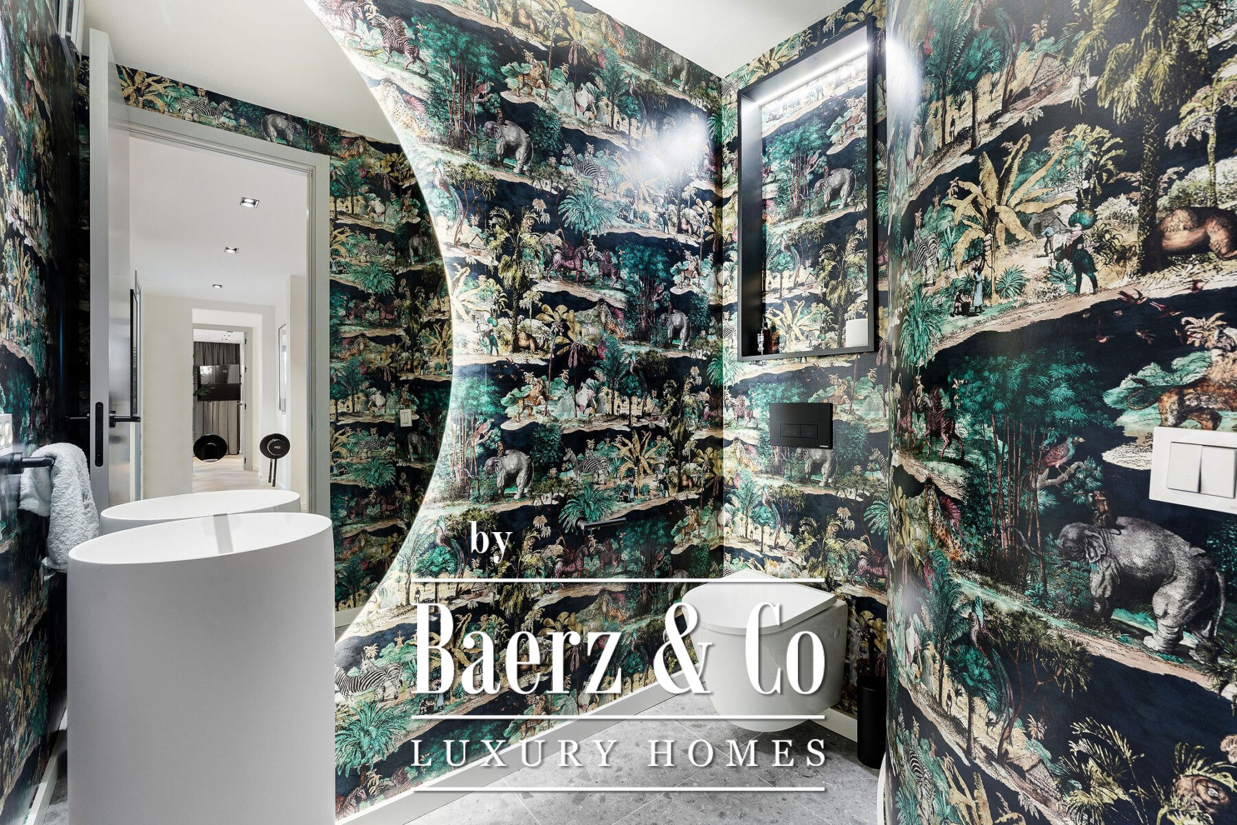 Im Erdgeschoss verstärkt Tageslicht den offenen Wohn- und Essbereich sowie die hochmoderne Gaggenau-Küche, die jeweils durch edle Holz- und Marmorausstattungen definiert werden. Fischgrät-Parkett und eine neutrale Farbpalette verleihen Wärme und dezente Eleganz. Vom Wohnbereich aus öffnet sich eine private Terrasse, ideal für Mahlzeiten im Freien und entspannte Momente. Die prächtige Hauptsuite bietet eine großzügige Ankleide, eine freistehende Badewanne mit Blick auf die Terrasse und ein eigenes Bad. Ein weiteres Schlafzimmer auf dieser Ebene sorgt für flexible Nutzungsmöglichkeiten für Familie oder Gäste.