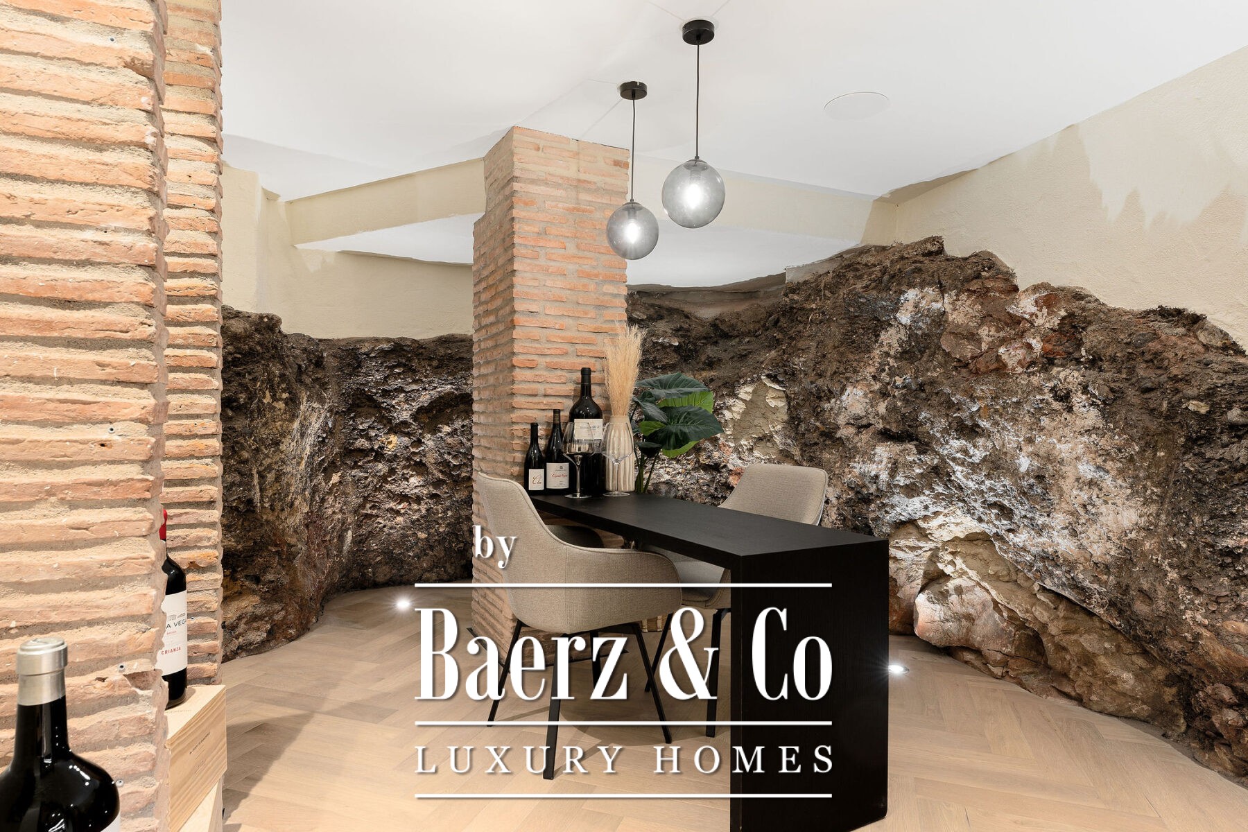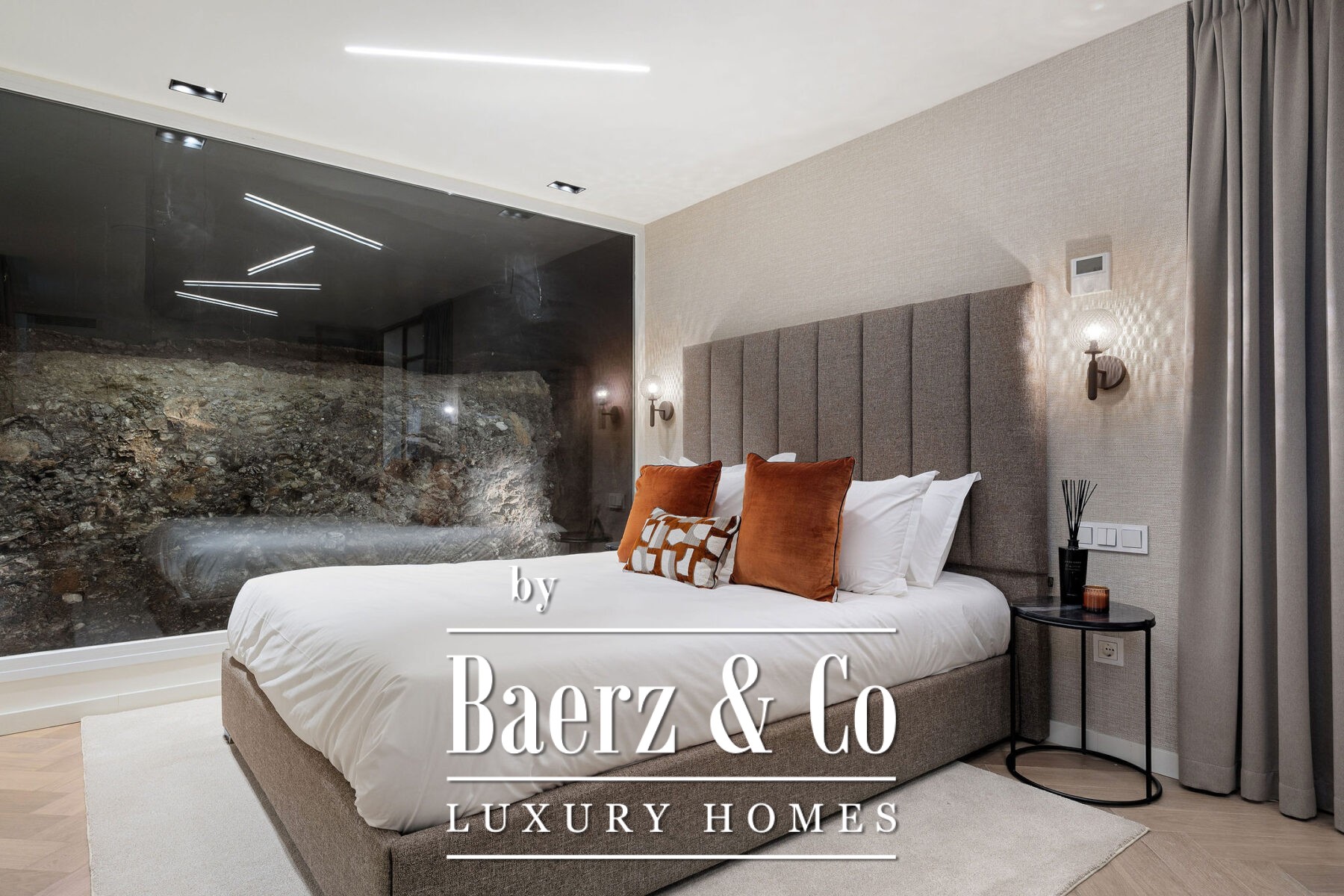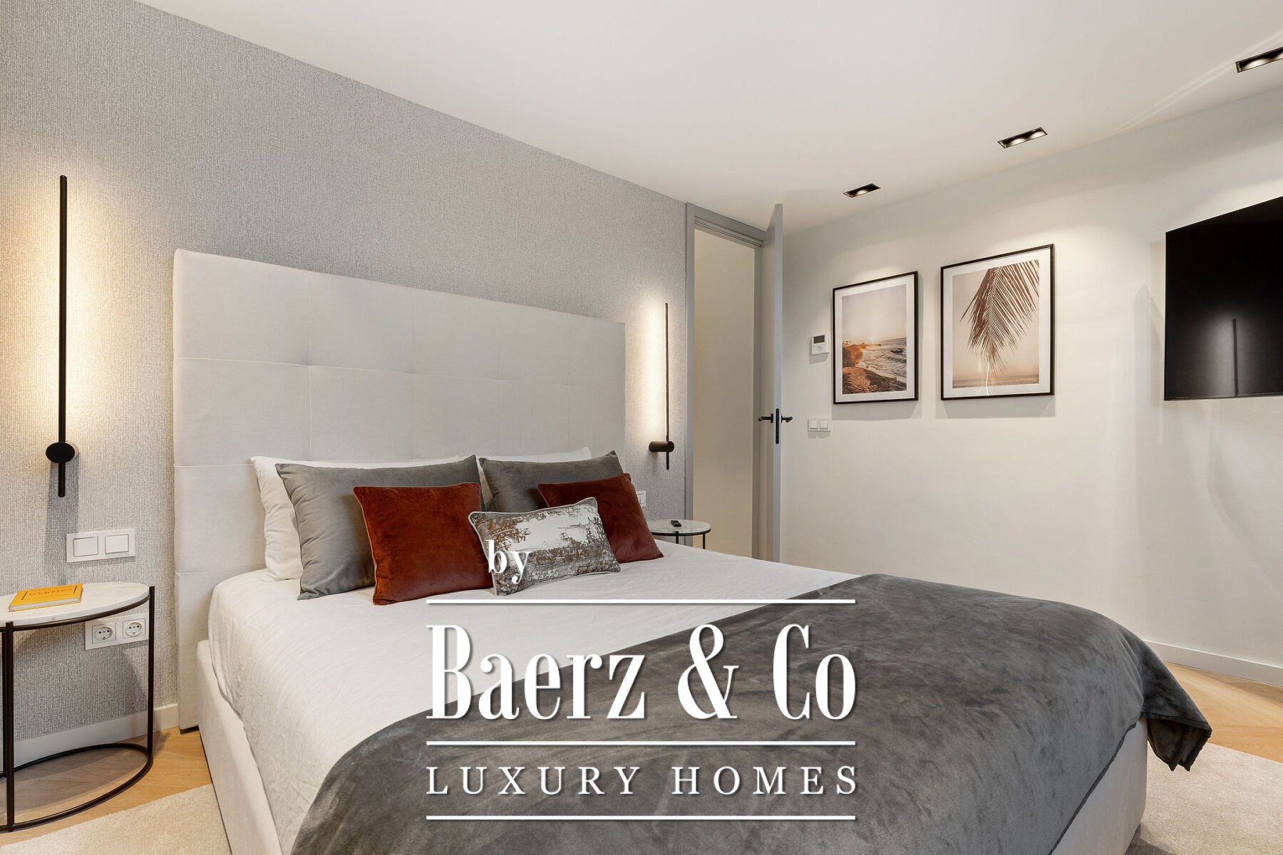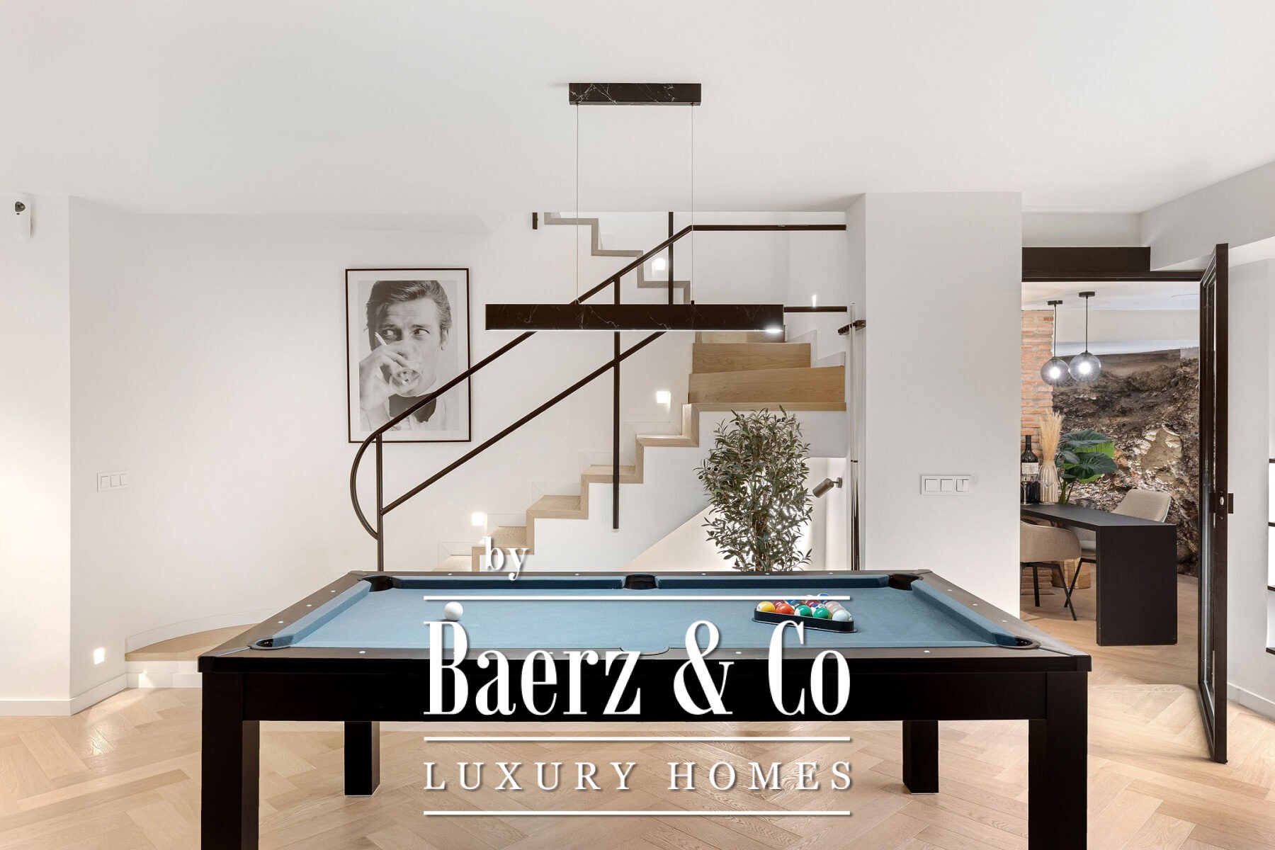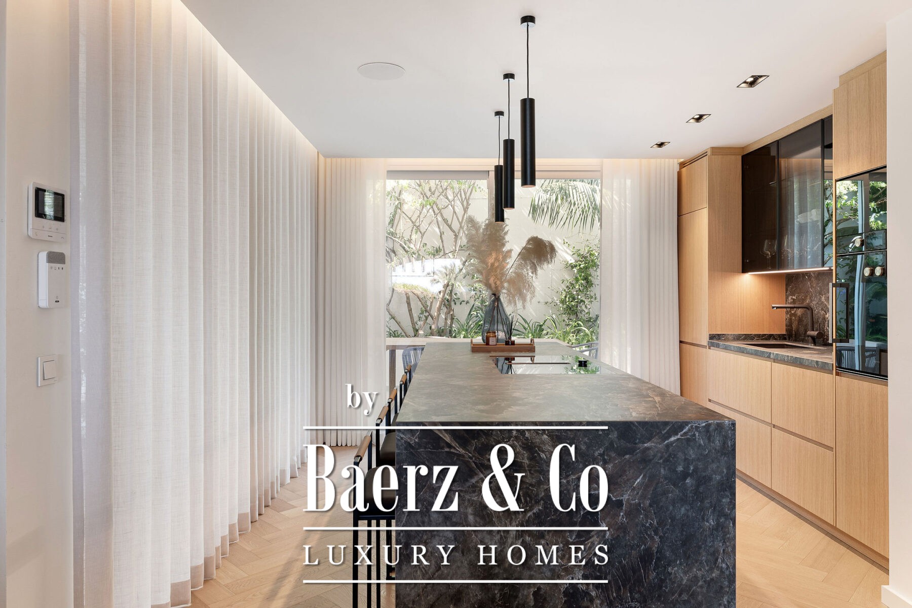 Im Erdgeschoss verstärkt Tageslicht den offenen Wohn- und Essbereich sowie die hochmoderne Gaggenau-Küche, die jeweils durch edle Holz- und Marmorausstattungen definiert werden. Fischgrät-Parkett und eine neutrale Farbpalette verleihen Wärme und dezente Eleganz. Vom Wohnbereich aus öffnet sich eine private Terrasse, ideal für Mahlzeiten im Freien und entspannte Momente. Die prächtige Hauptsuite bietet eine großzügige Ankleide, eine freistehende Badewanne mit Blick auf die Terrasse und ein eigenes Bad. Ein weiteres Schlafzimmer auf dieser Ebene sorgt für flexible Nutzungsmöglichkeiten für Familie oder Gäste.