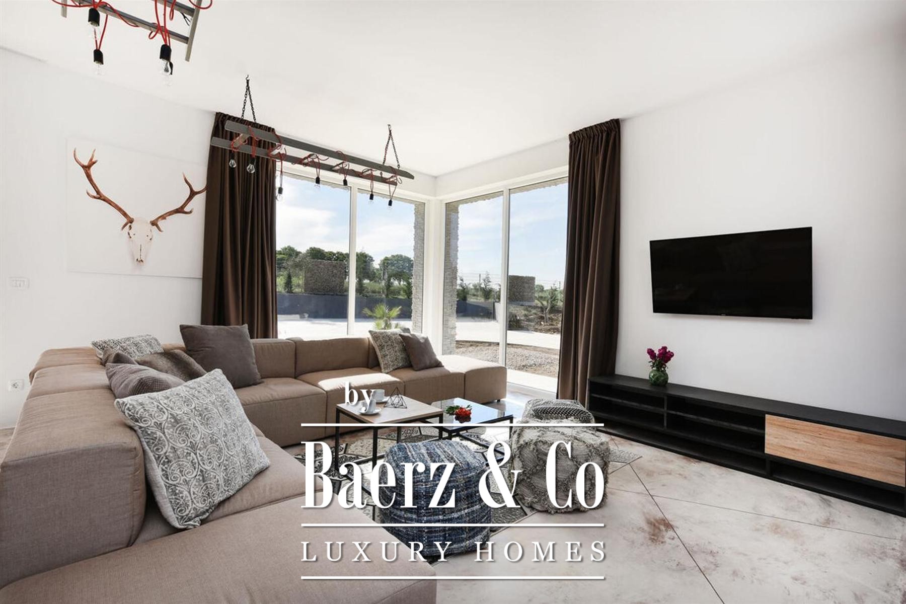 Im Außenbereich bildet ein beheizter Swimmingpool mit den Maßen 14 mal 5 Meter das Herzstück. Er ist von sorgsam gestalteten Zonen zum Entspannen und Genießen umgeben. Die beleuchtete Gartenlandschaft vereint Sonnenliegen, Lounge, Schaukeln und Grill und bietet so einen fließenden Übergang vom Tag- in den Abendbereich.