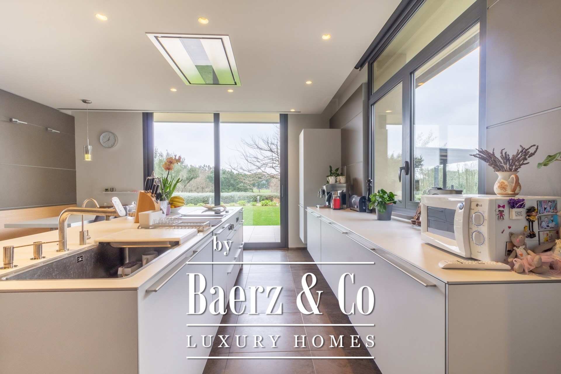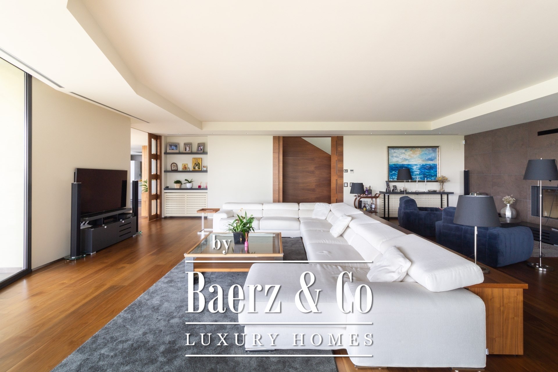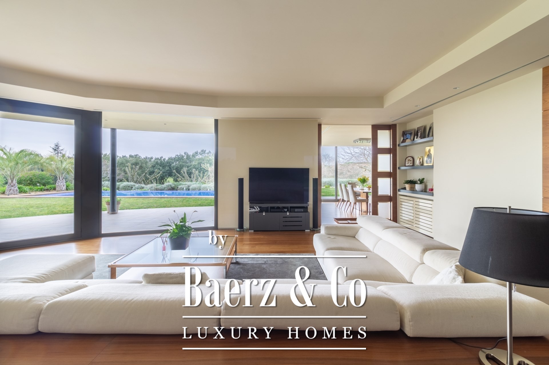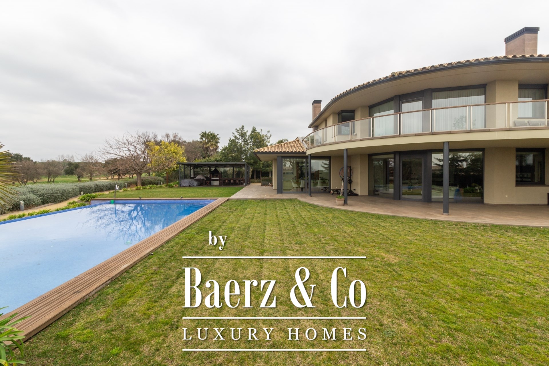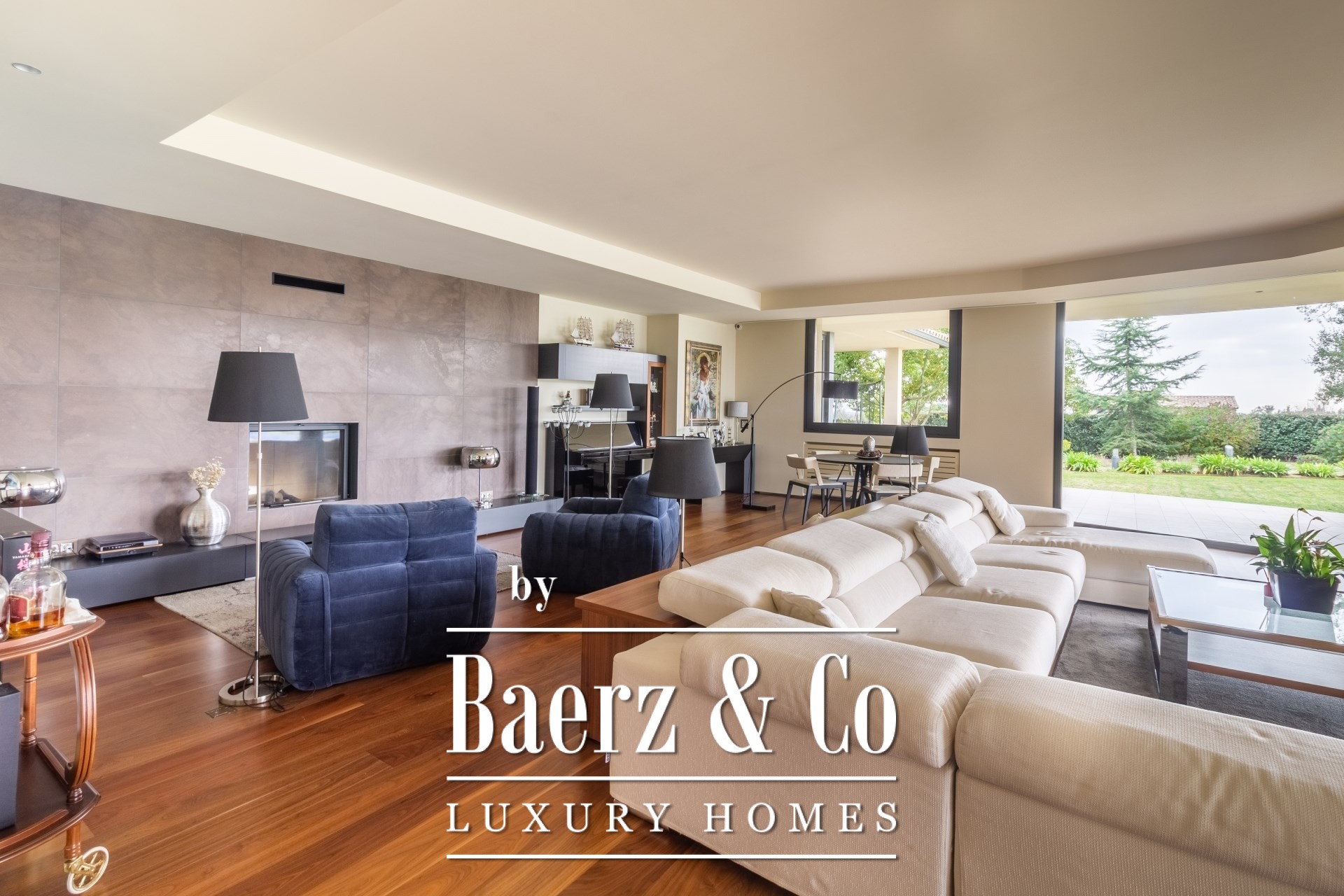 Im Außenbereich umgeben gepflegte Gärten den Pool mit Wasserfall, eine Barbecue- und Outdoor-Küche sowie großzügige Chill-out-Bereiche. Fußbodenheizung, zentrale Klimaanlage, elektrische Fenster, integriertes Audiosystem, vollständige Überwachungsanlage und ein Aufzug unterstreichen den Fokus auf Komfort und Sicherheit.