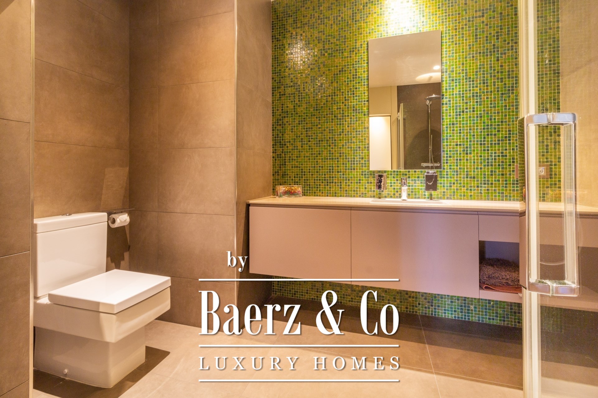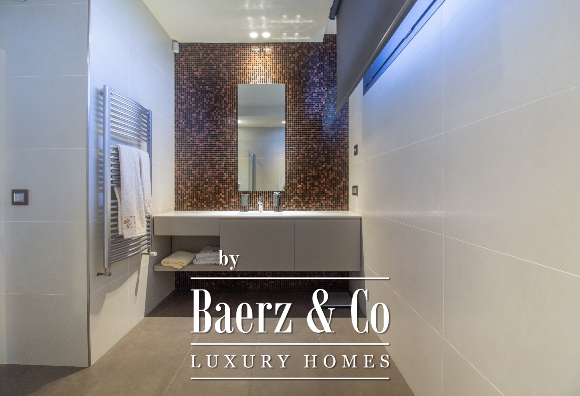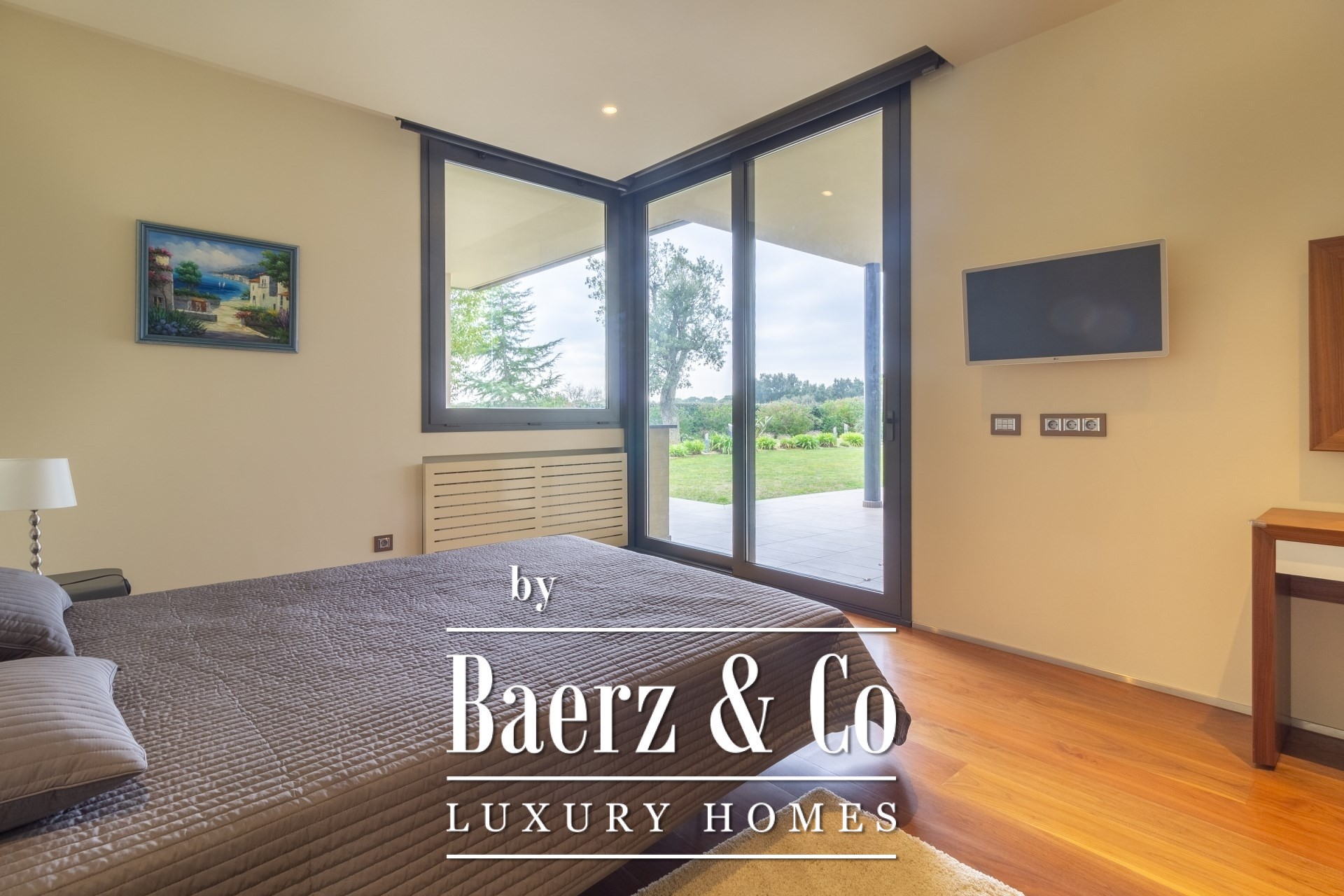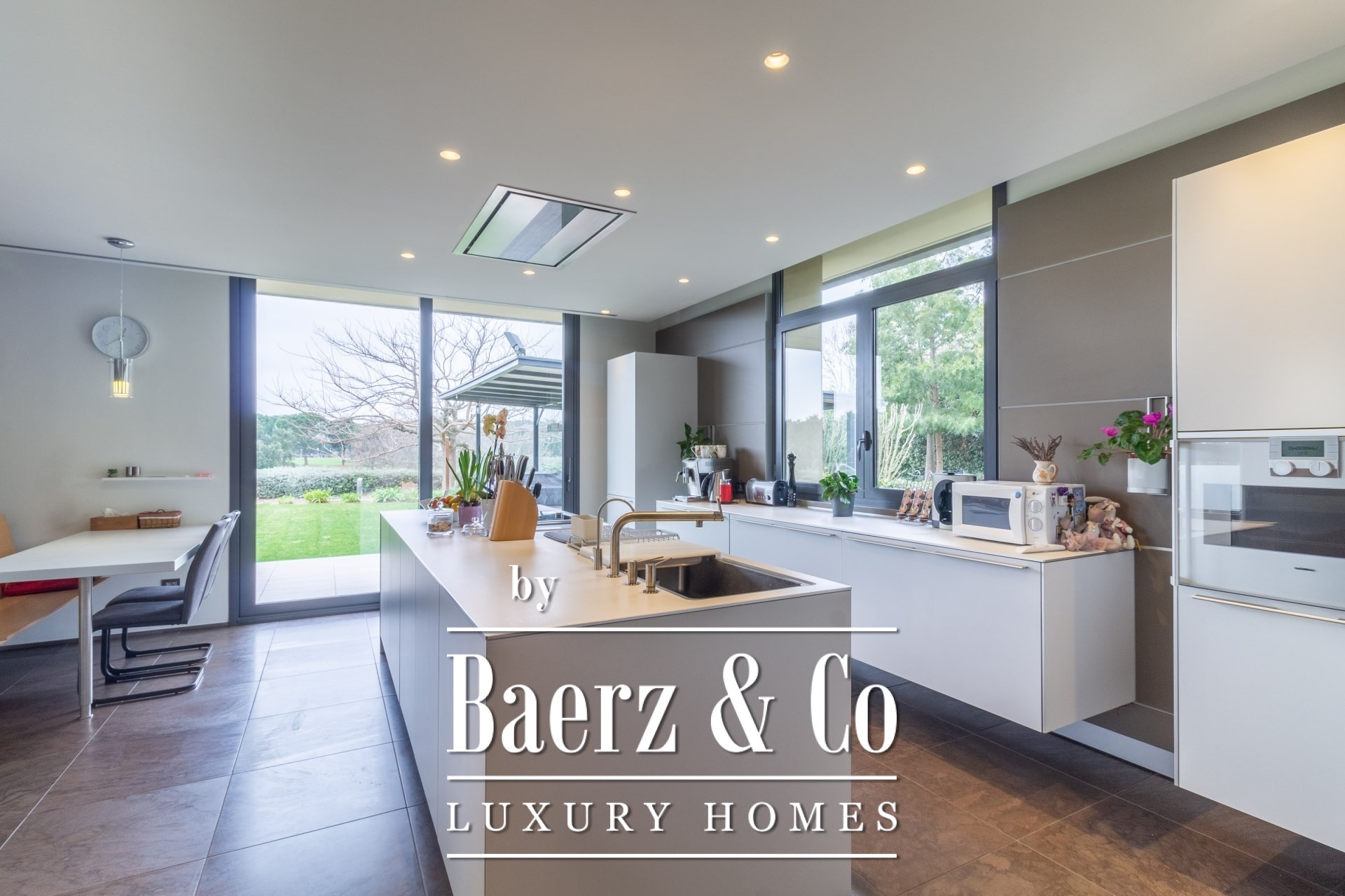 Im Außenbereich umgeben gepflegte Gärten den Pool mit Wasserfall, eine Barbecue- und Outdoor-Küche sowie großzügige Chill-out-Bereiche. Fußbodenheizung, zentrale Klimaanlage, elektrische Fenster, integriertes Audiosystem, vollständige Überwachungsanlage und ein Aufzug unterstreichen den Fokus auf Komfort und Sicherheit.