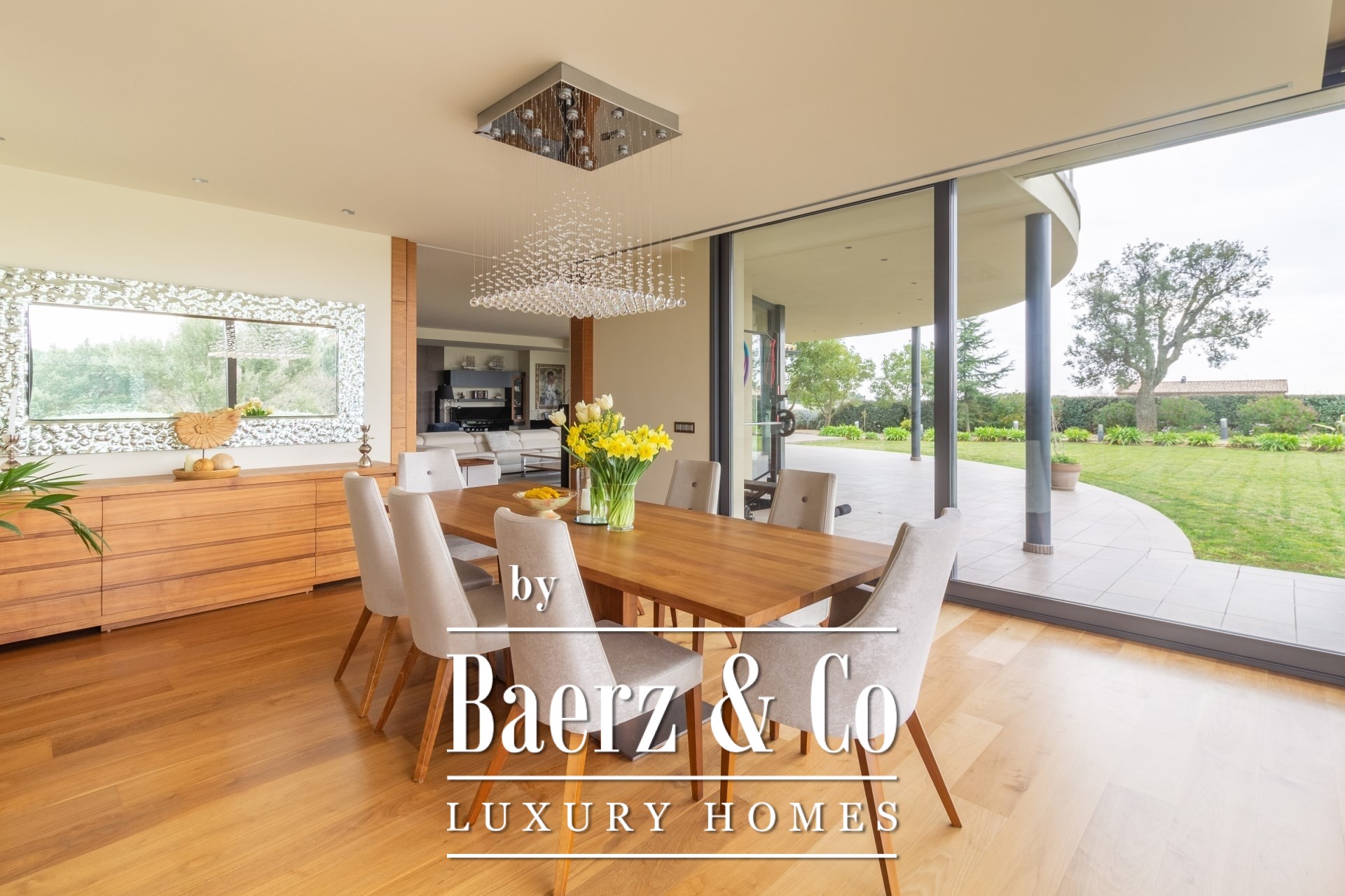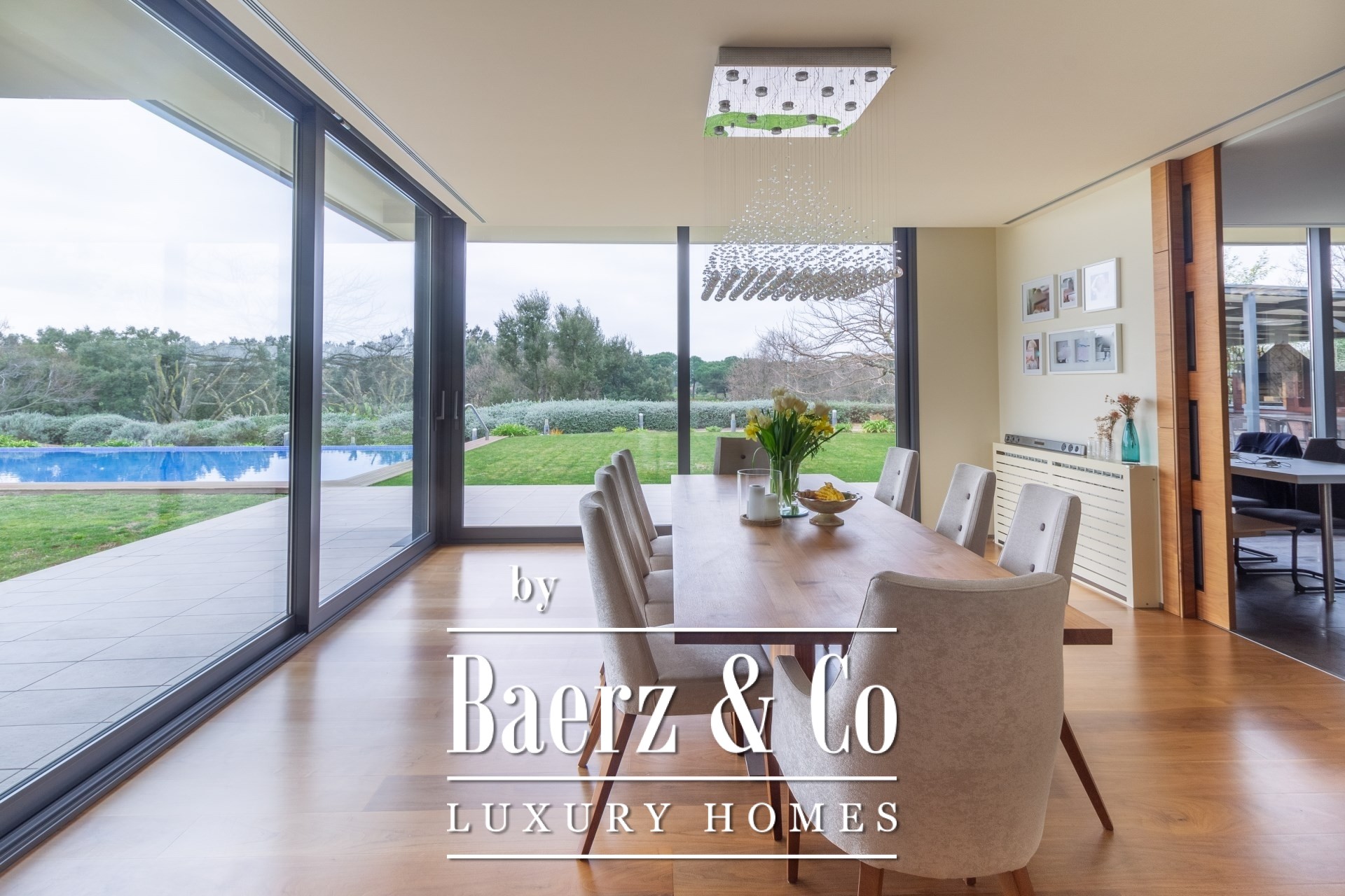 Nach dem Eintritt durch die großzügige Diele öffnet sich das Hauptgeschoss nahtlos zu einem weitläufigen Wohn- und Essbereich, durchflutet von natürlichem Licht und eingerahmt von Garten- und Poolblicken. Eine Leseecke mit Kamin lädt zur entspannten Muße ein. Die Küche beeindruckt mit High-End-Geräten und makellosen Oberflächen, gestaltet für höchste kulinarische Ansprüche. Zwei Schlafzimmer mit Bad en suite im Erdgeschoss bieten Privatsphäre und Komfort, ergänzt durch ein Gäste-WC sowie ein separates Arbeitszimmer.