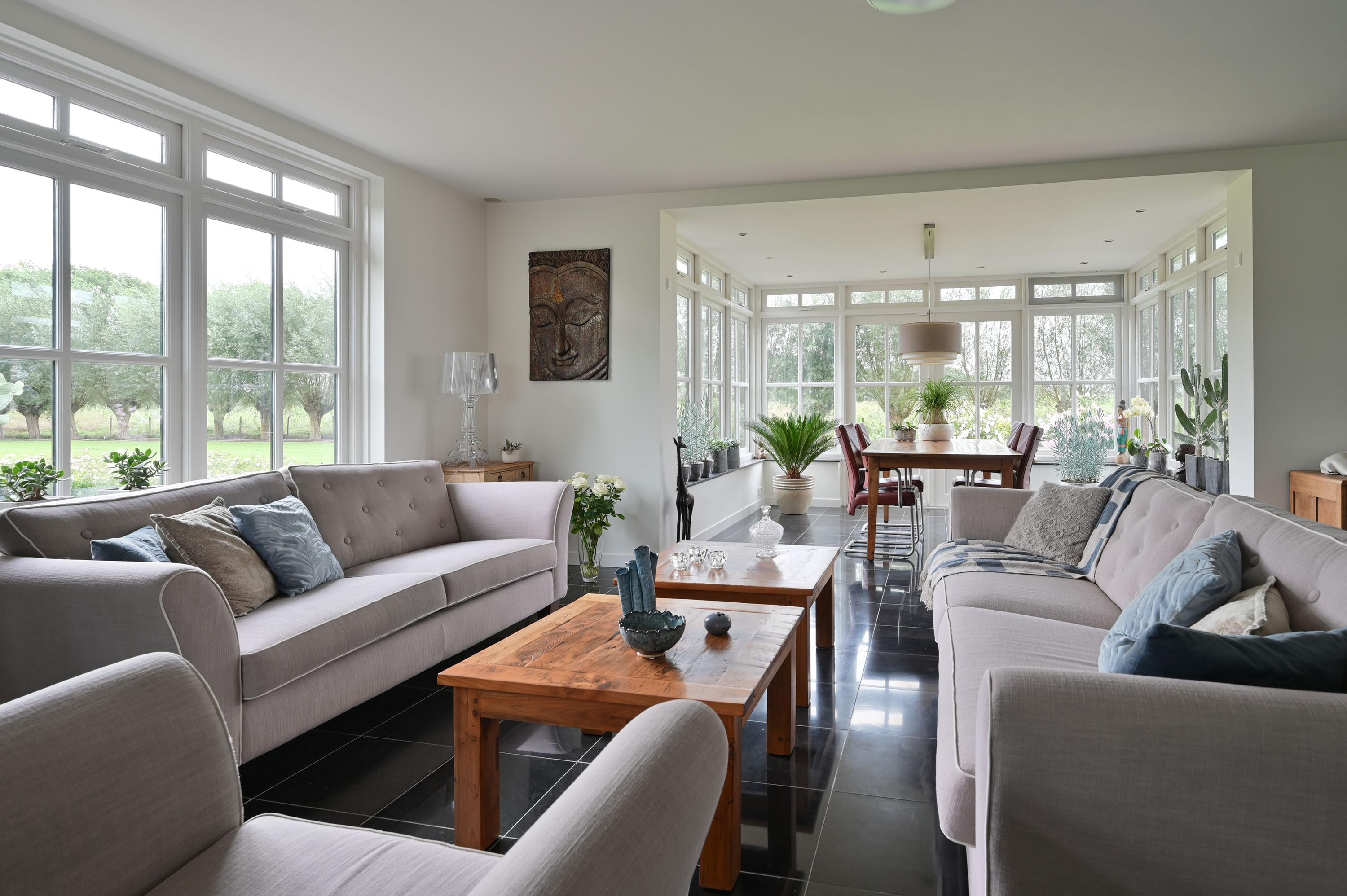 Die freistehende Villa Woerdense Verlaat liegt diskret im ländlichen Herzen der Niederlande und bietet 227 m² Wohnfläche auf einem weitläufigen Anwesen von 46.341 m². Über eine lange Auffahrt und ein elektrisches Tor erreichbar, eröffnet sich die Villa zu sorgfältig gestalteten Gärten und ruhigen Uferperspektiven – ein Refugium von Frieden und Abgeschiedenheit. Im Hauptgebäude begrüßt eine großzügige Eingangshalle mit skulpturaler Holztreppe die lichtdurchfluteten Innenräume. Das Wohnzimmer zeichnet sich durch helle Räume, Gartenblicke und die behagliche Wärme eines Holzofens aus. Französische Türen führen auf sonnige Terrassen, die das Wohngefühl nach außen erweitern. Die Küche – veredelt mit Granitoberflächen und modernen Geräten – begleitet sowohl den Alltag als auch gesellige Zusammenkünfte.