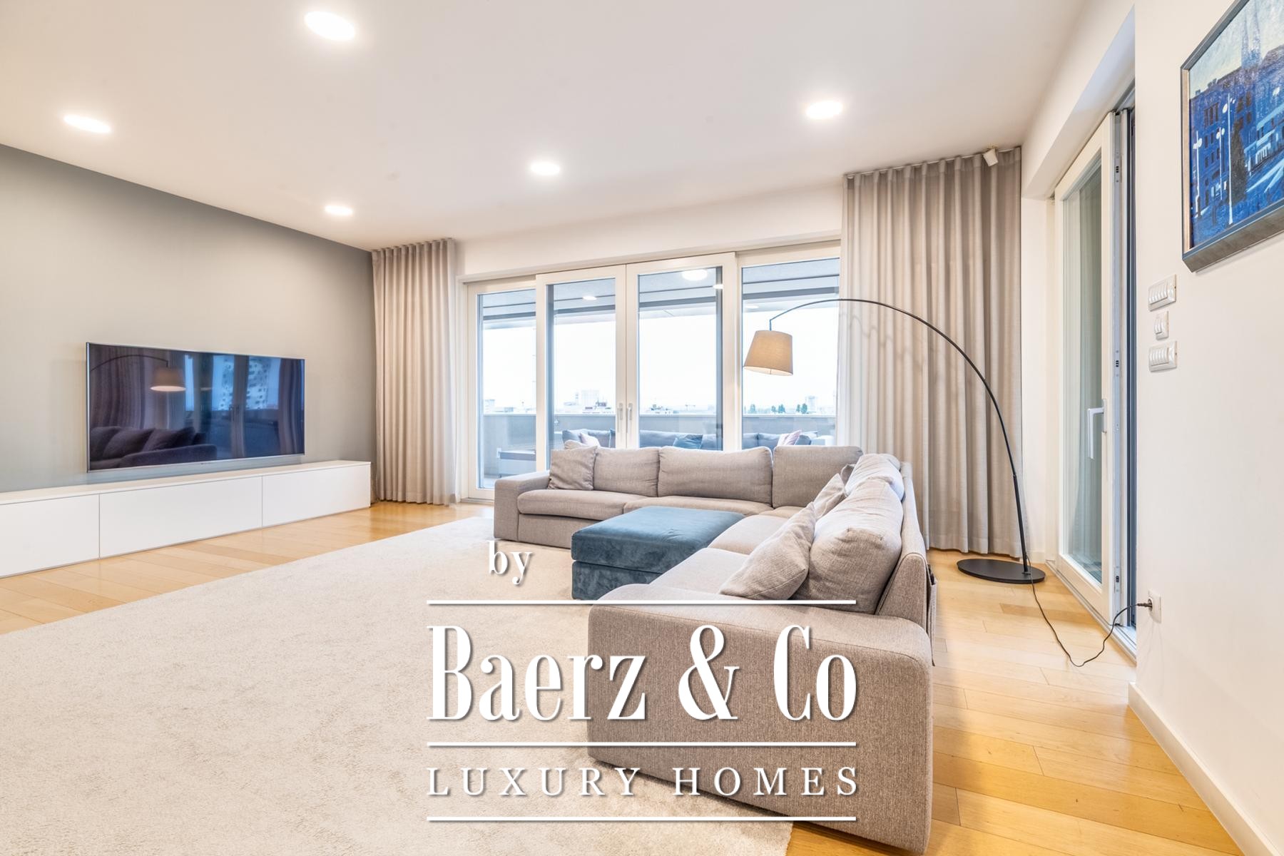 Zagreb, Črnomerec, VMD residential and business district in Kuniščak street, luxurious four-bedroom apartment in a modern and high-quality new building from 2017.It consists of an entrance hall, a spacious living room with kitchen and dining room of 48 m2, which opens onto a terrace, a master bedroom with a walk-in wardrobe and a bathroom with a shower, three children's bedrooms, another bathroom with a bathtub, a laundry room and a guest toilet.The living room with kitchen and dining room is oriented to the sunny south and west side with an open view of the city, while the bedrooms on the eastern, quiet side are separated from the living area.The closed area of the apartment is 142.40 m2, a covered terrace