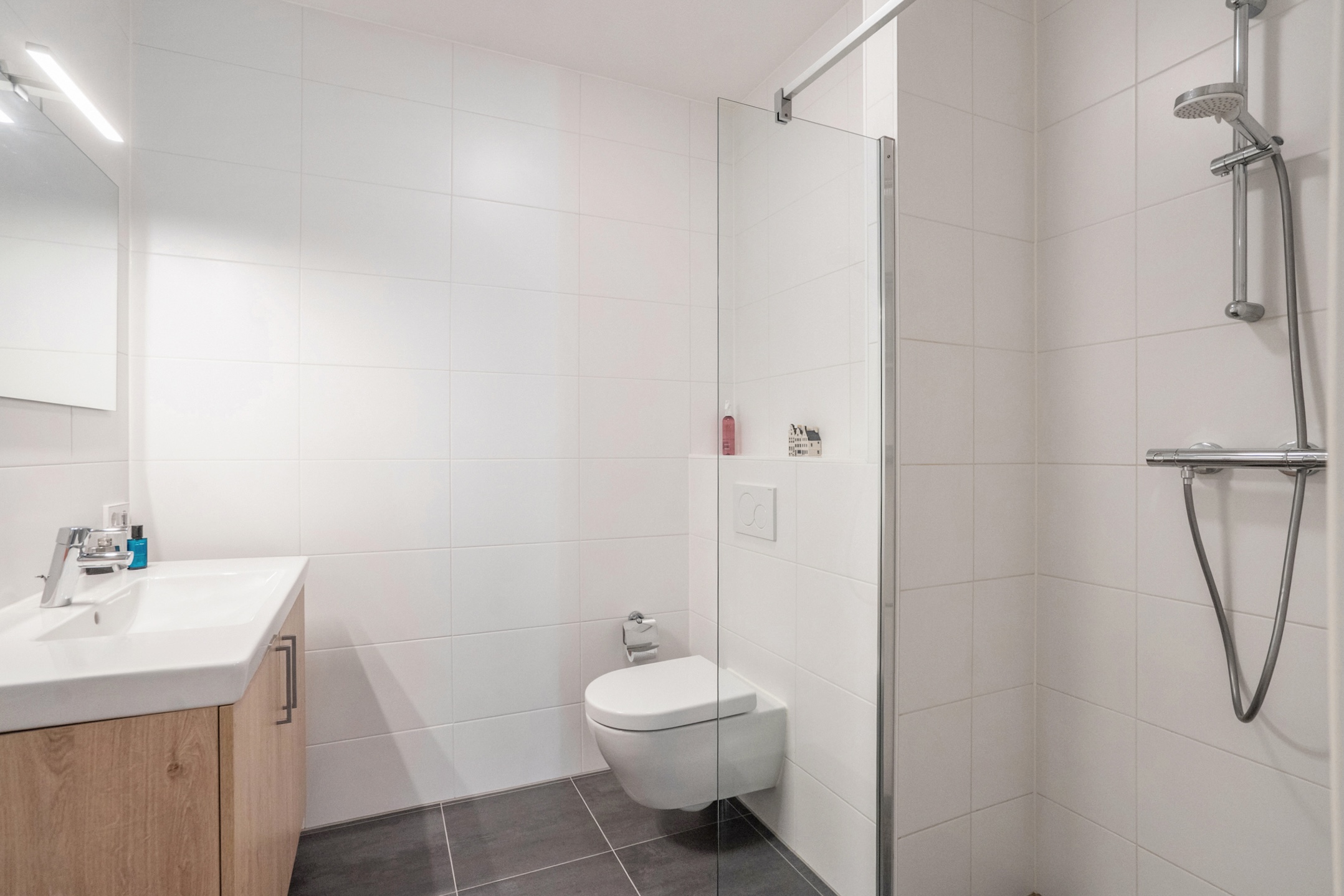 A door in the living room leads you to the hallway with a deep closet that offers plenty of storage space and houses the technical installations out of sight. A modern bathroom, the smaller of the two, with a tiled floor, deep walk-in shower, vanity unit, and toilet.