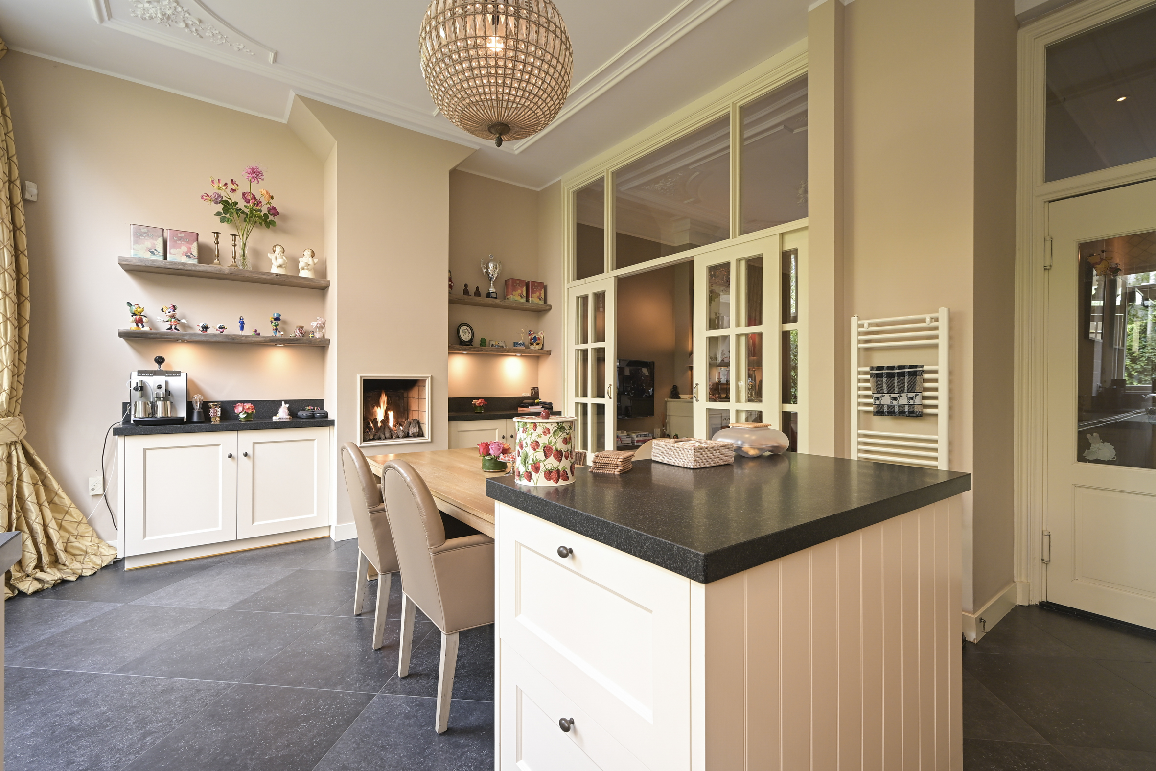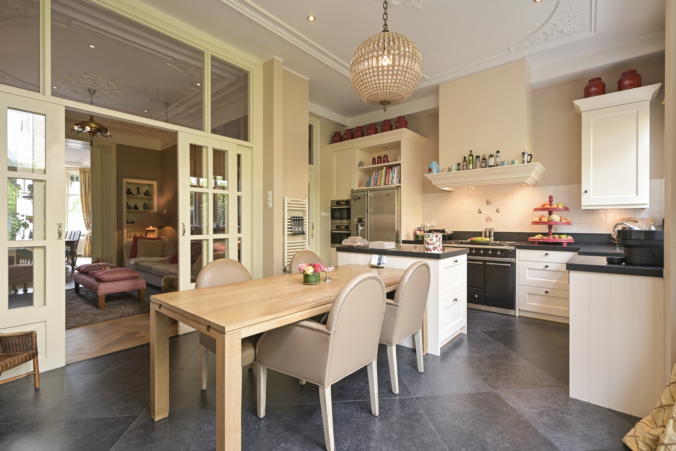 Layout: entrance, vestibule with built-in wardrobes and draft separation, hallway with storage space under the stairs, modern toilet with washbasin, and access to the cellar. Delightful, spacious living/dining room with suite separation featuring high sliding doors and built-in cupboards. Both rooms feature high ornate ceilings, beautiful oak parquet floors, and marble fireplaces with (gas) fires. The back room is connected to the full-width eat-in kitchen by a transparent partition, featuring built-in appliances, an island, and a gas fireplace. Double French doors lead to the delightfully private rear garden with a back entrance.