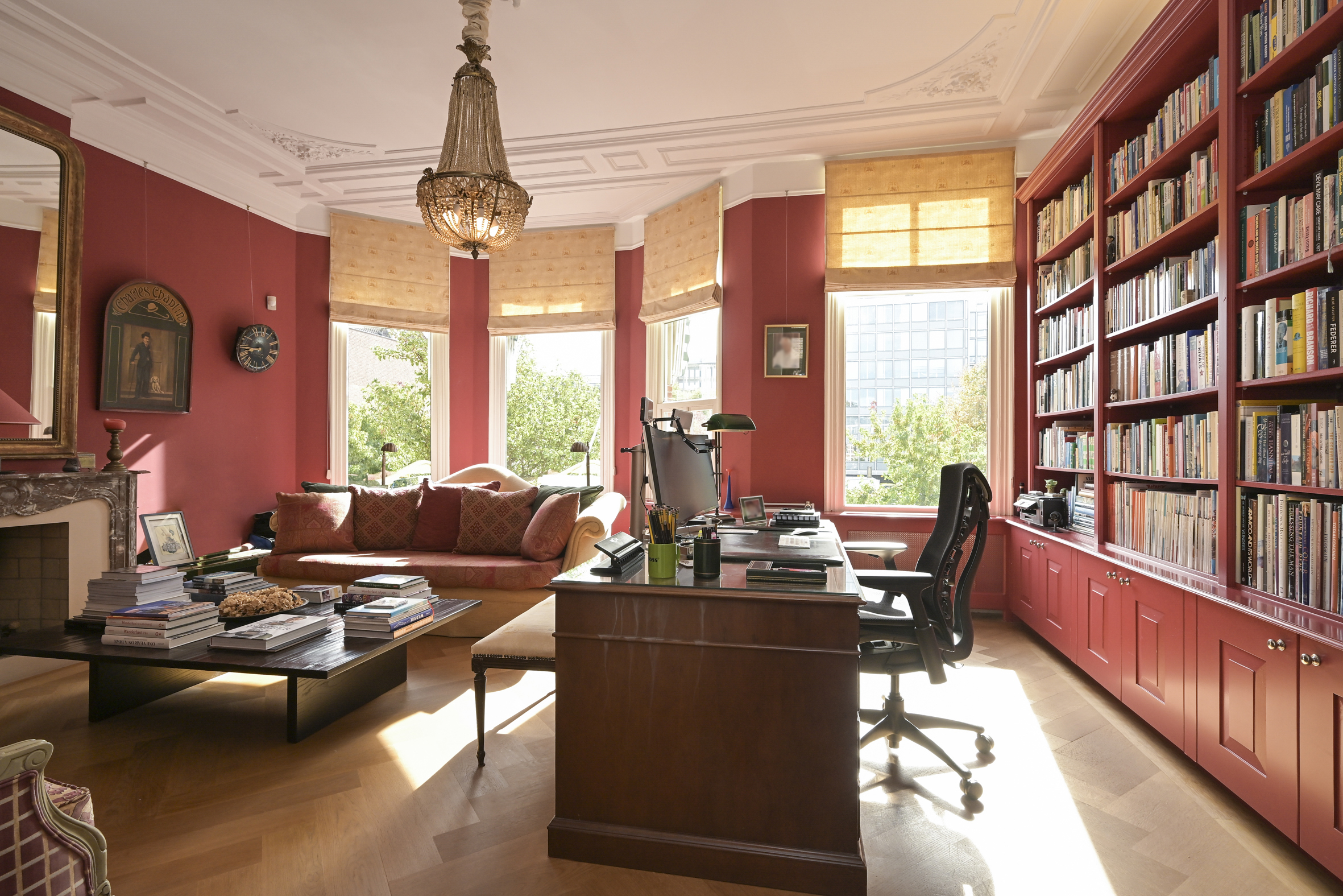 The beautiful staircase leads to the first floor, landing, modern toilet with washbasin, spacious rear bedroom with beautiful oak flooring, fireplace with gas fire, high ceilings, walk-in wardrobe, and an adjoining full bathroom with bathtub, separate walk-in shower, and double sinks with vanity units. At the front is the full-width classic study with high ceilings, fireplace with gas fire, oak floors, built-in bookcases, and an unobstructed view.