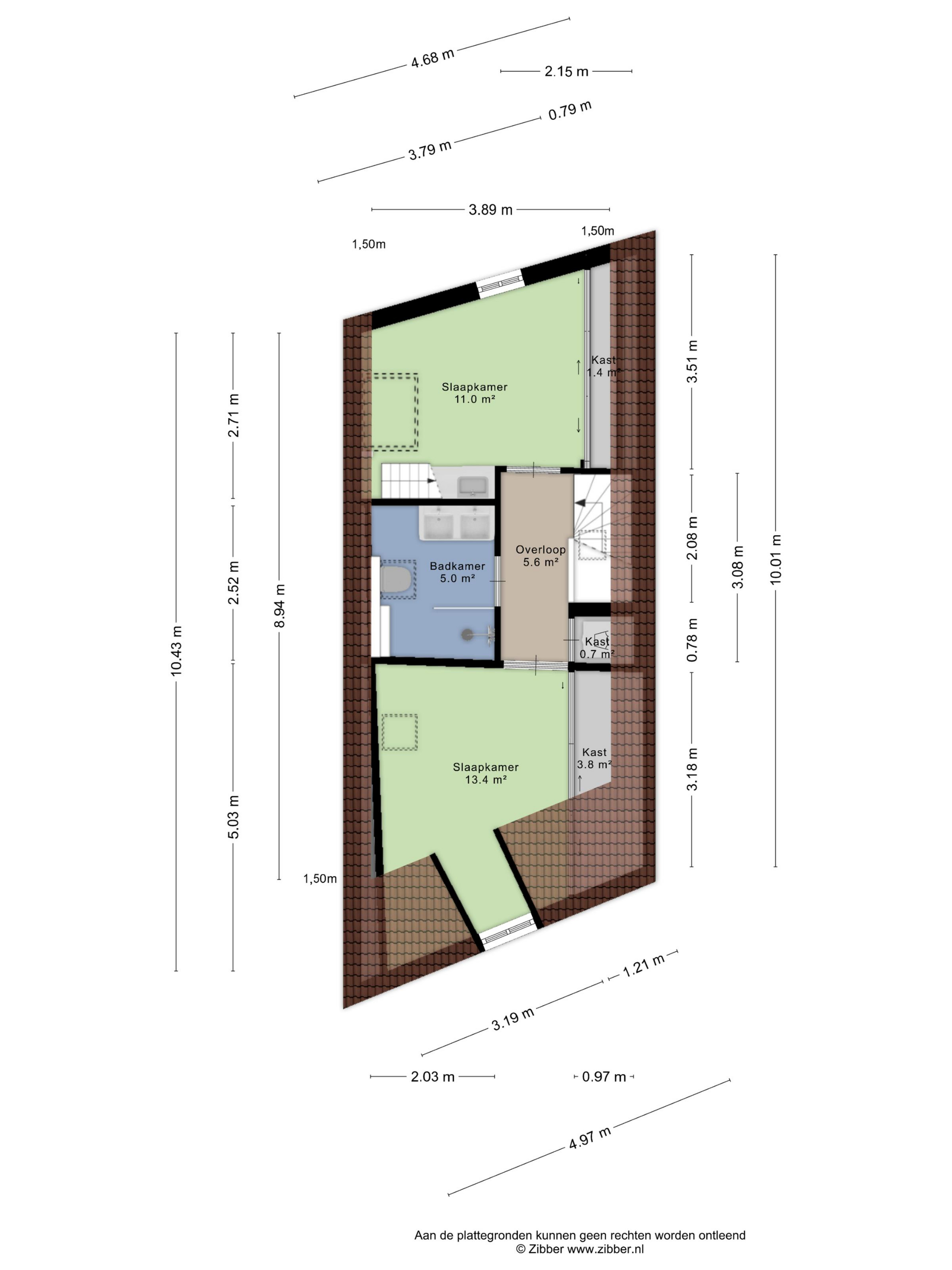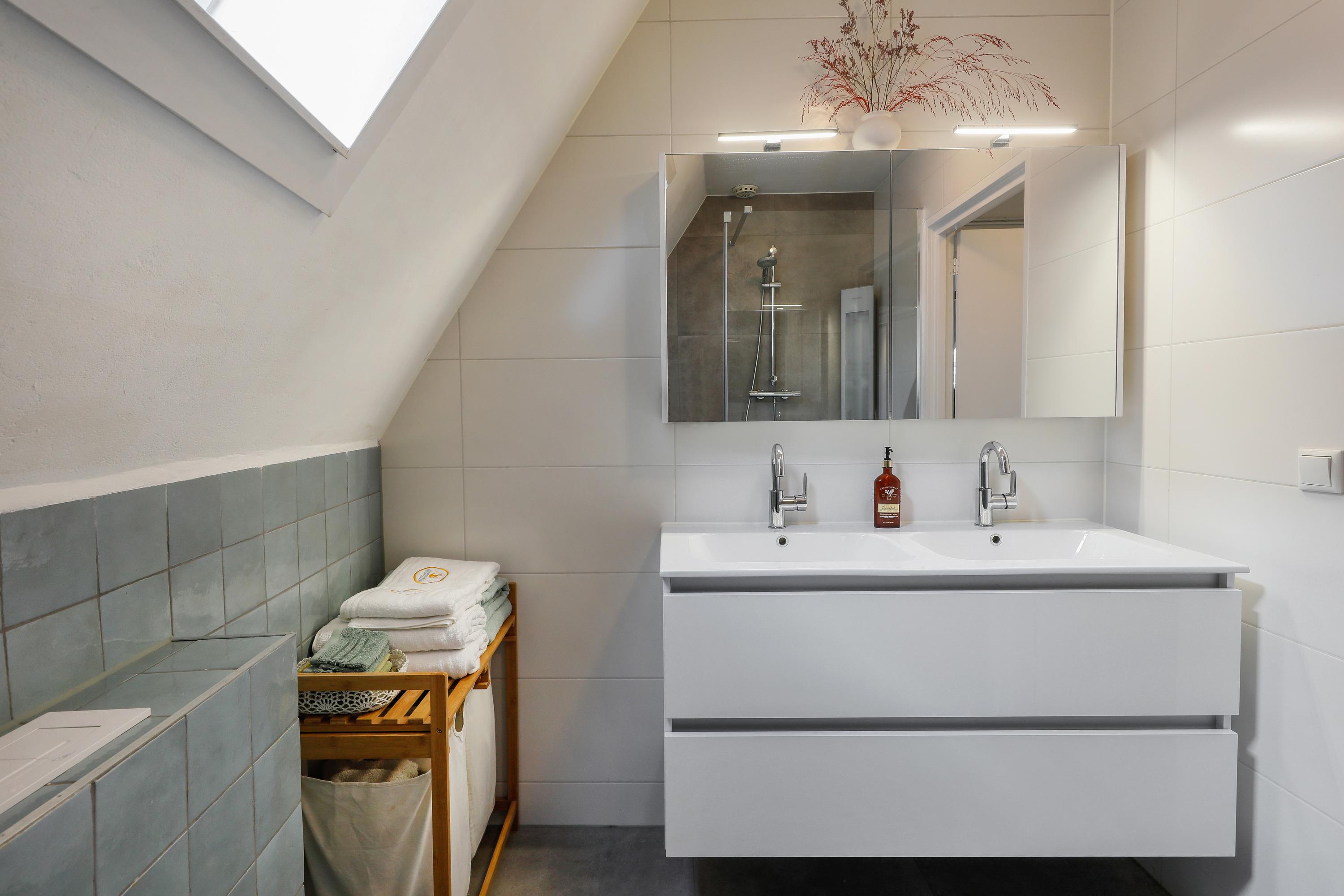 The upper floor features two bedrooms. The main bedroom is located at the front under the roof and has a charming atmosphere thanks to the high ceiling and dormer window. The second bedroom is also spacious and versatile.