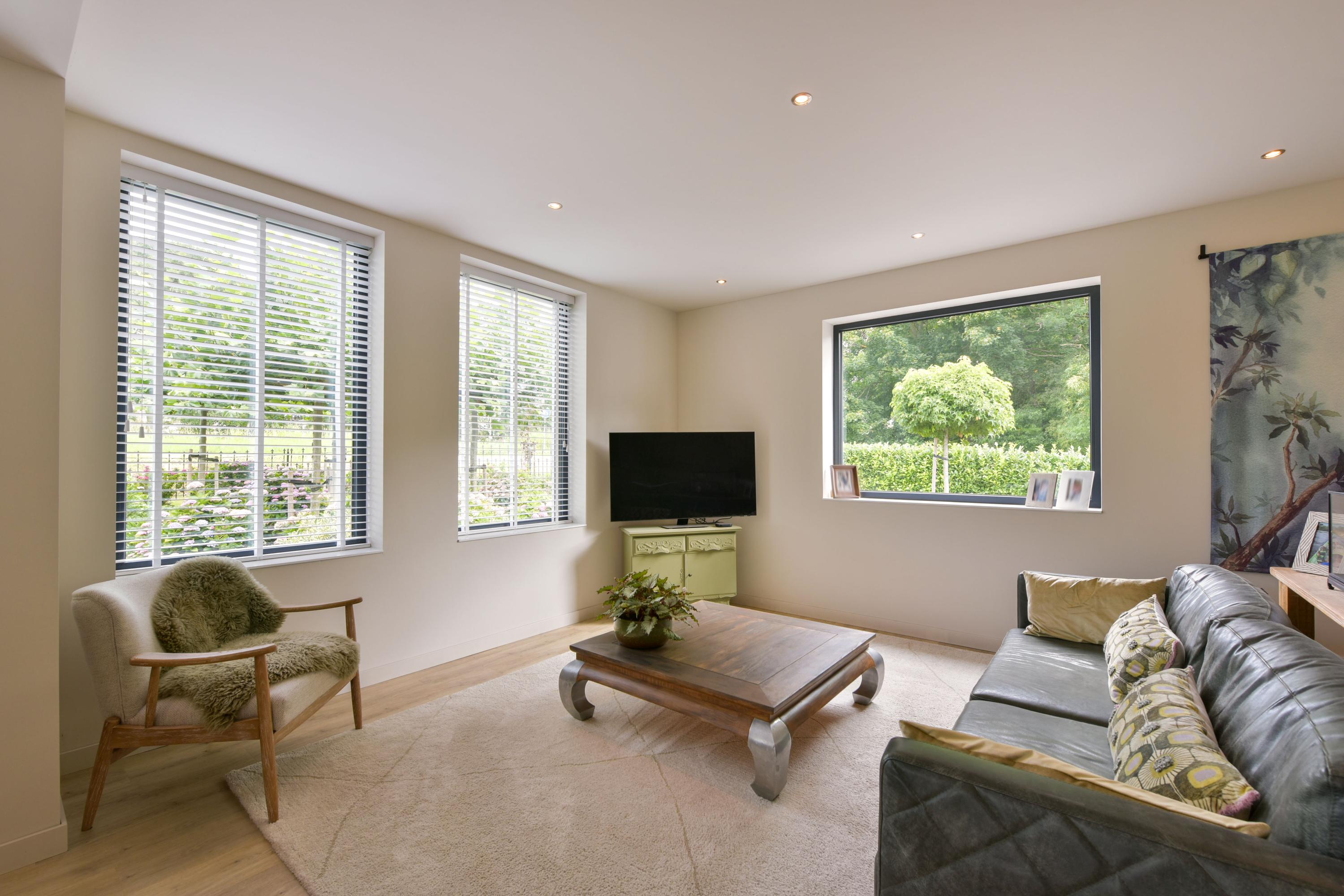 Thanks to large windows on all sides, the living room is a haven of light and space. Every corner of the room connects you to the outdoors. Double French doors lead straight into the garden — perfect for summer days or a refreshing morning start. The space feels open and simultaneously cosy, ideal for both relaxing and entertaining.