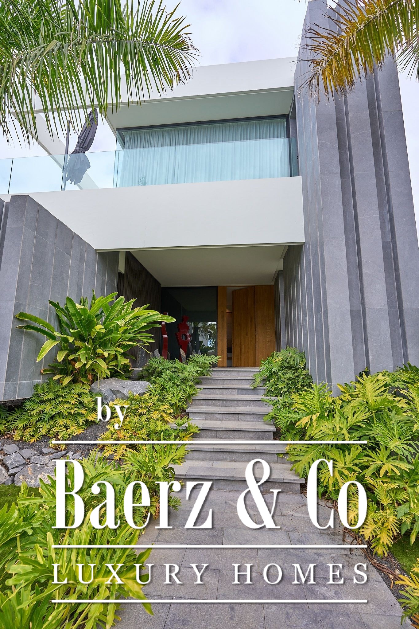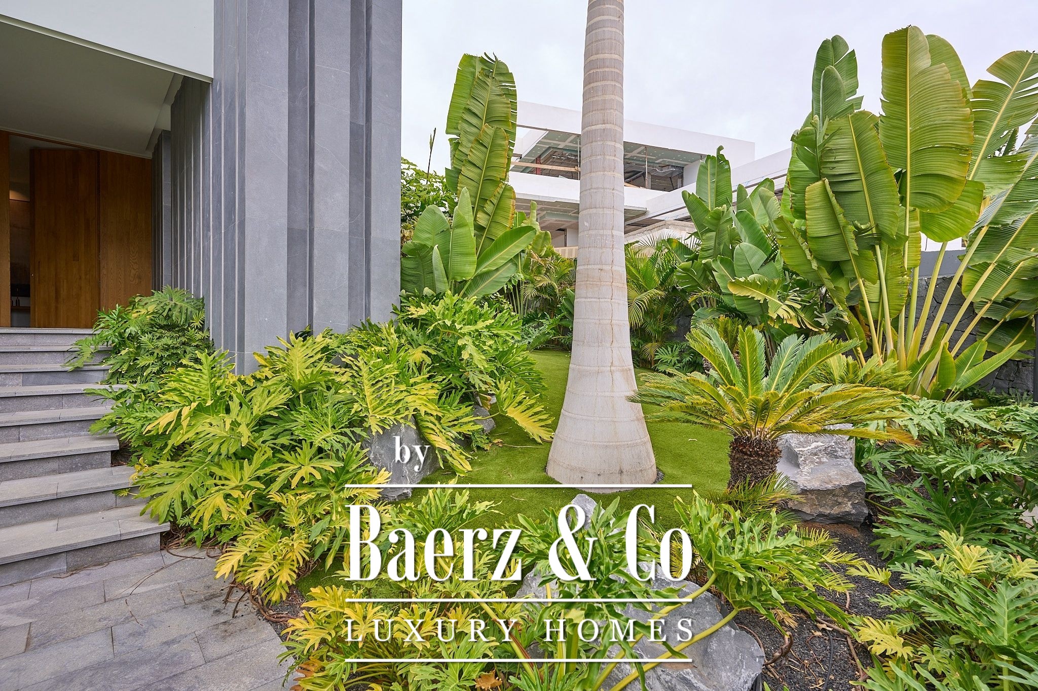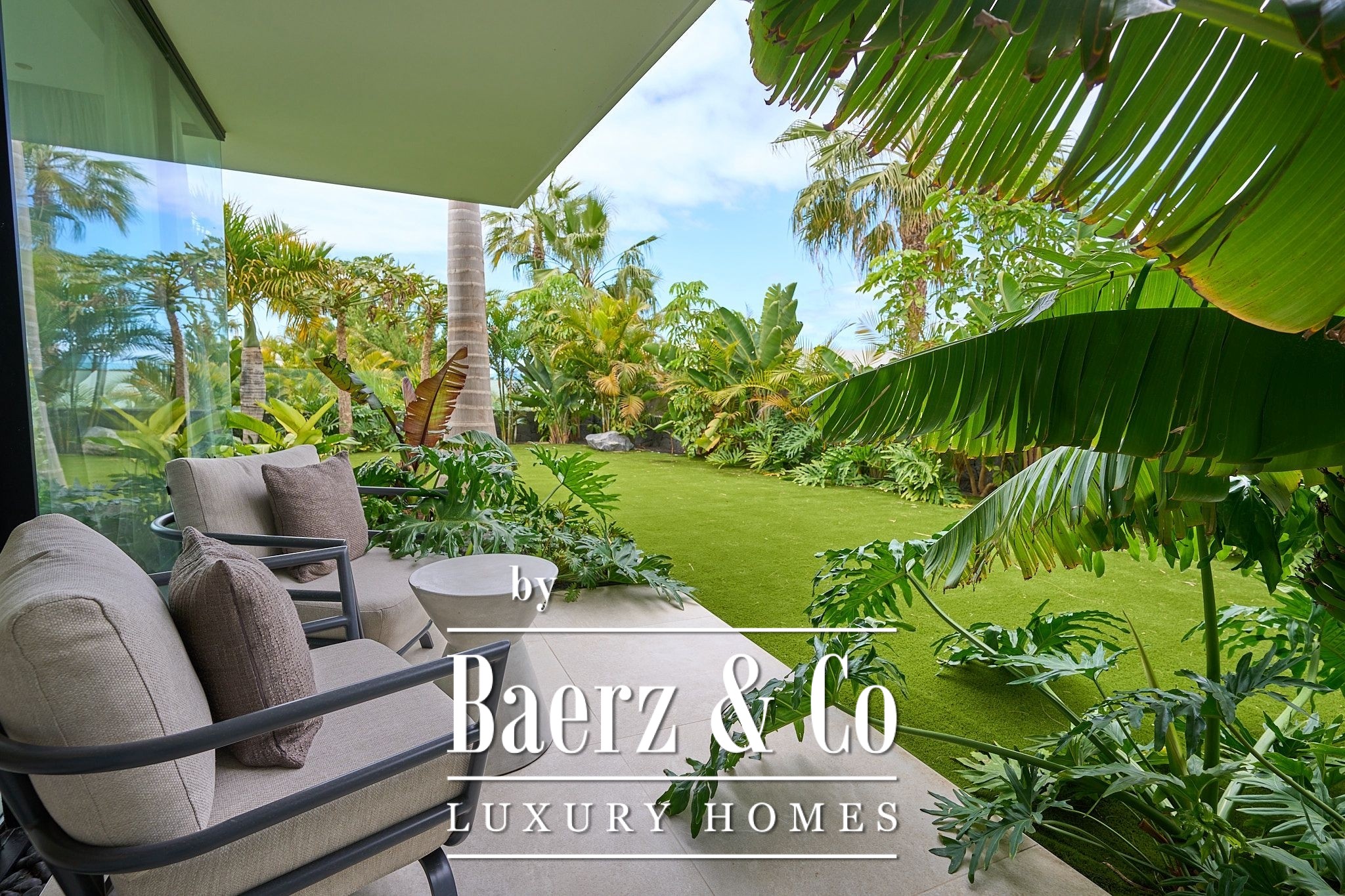 The villa features four en-suite bedrooms, each with built-in wardrobes and private access to lush tropical gardens that elevate the sense of space and tranquility. Upstairs, the spacious living and dining area flows naturally into a modern, fully equipped kitchen complemented by a climate-controlled wine cellar, while expansive windows amplify natural light and connect seamlessly to the exterior.