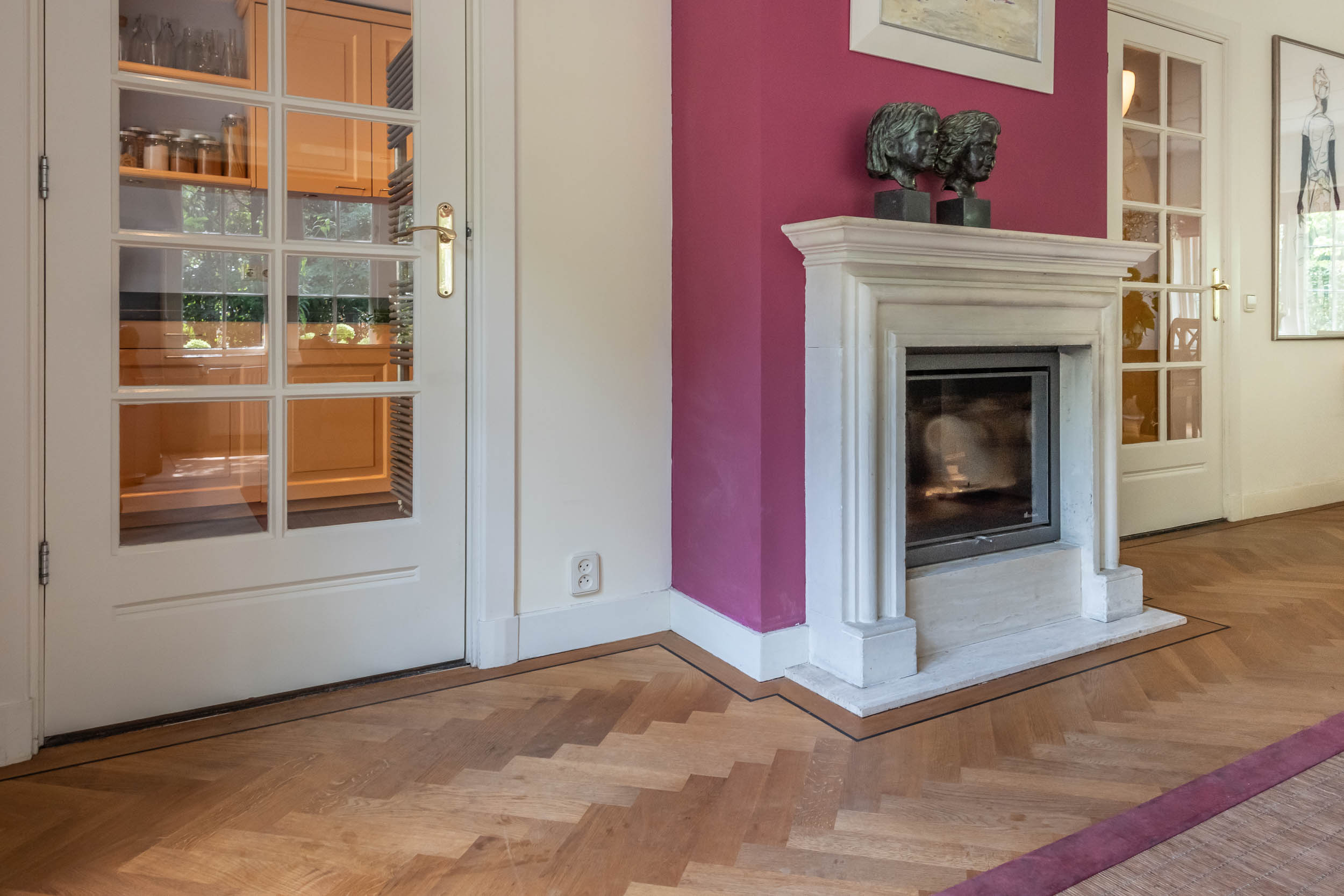 Entrance, vestibule with cupboard, L-shaped hall with toilet and access to basement with standing height, attractive and spacious living room with parquet floor (2022), two fireplaces (2024) and French doors to the rear terrace.  Glass doors provide access to the conservatory with underfloor heating. The open-plan kitchen has various built-in appliances and gives access to the cozy dining room with underfloor heating, French doors and a beautiful view of the garden.