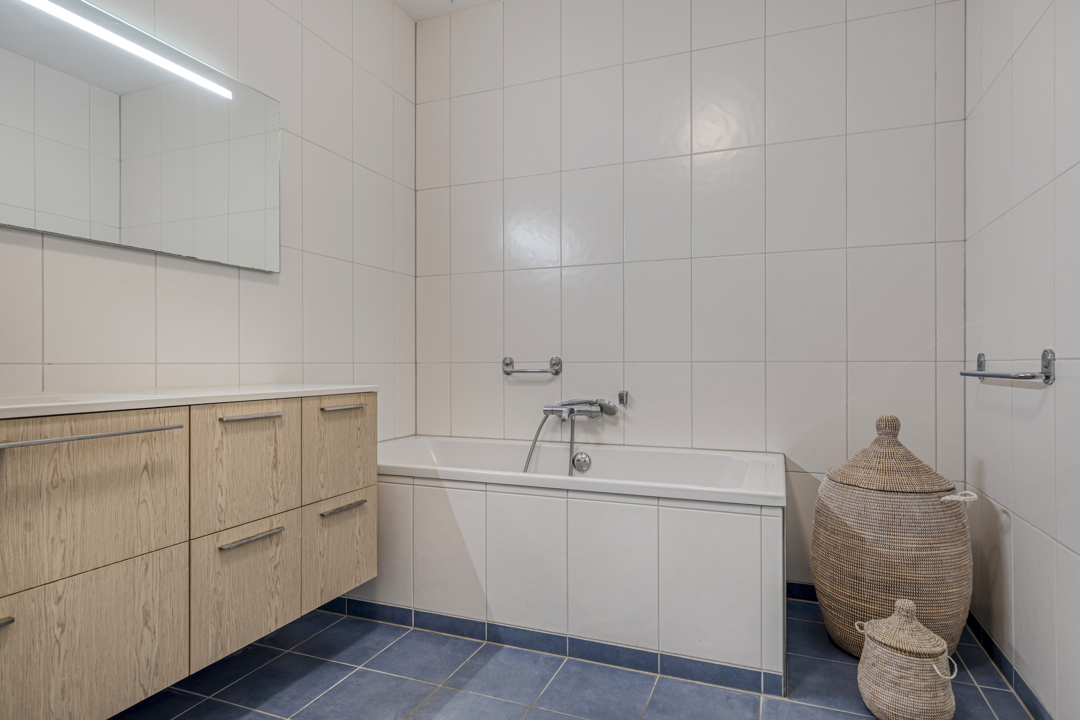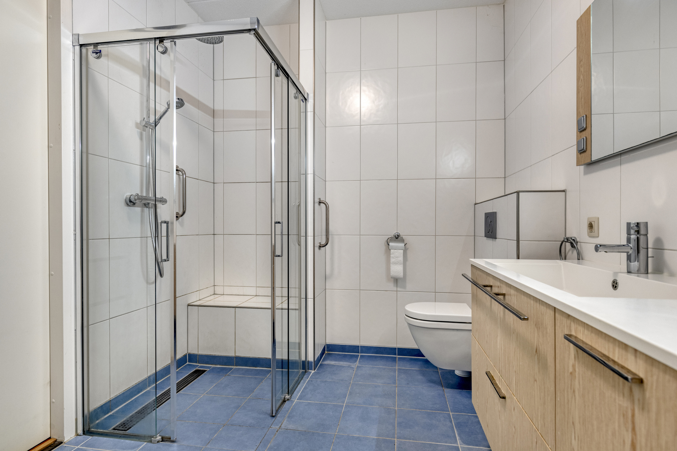 Next to the technical room is the spacious bathroom, fitted with a bathtub, walk-in shower, washbasin with vanity unit and a second toilet. The tiled floor is finished with an anti-slip coating, providing extra safety.
