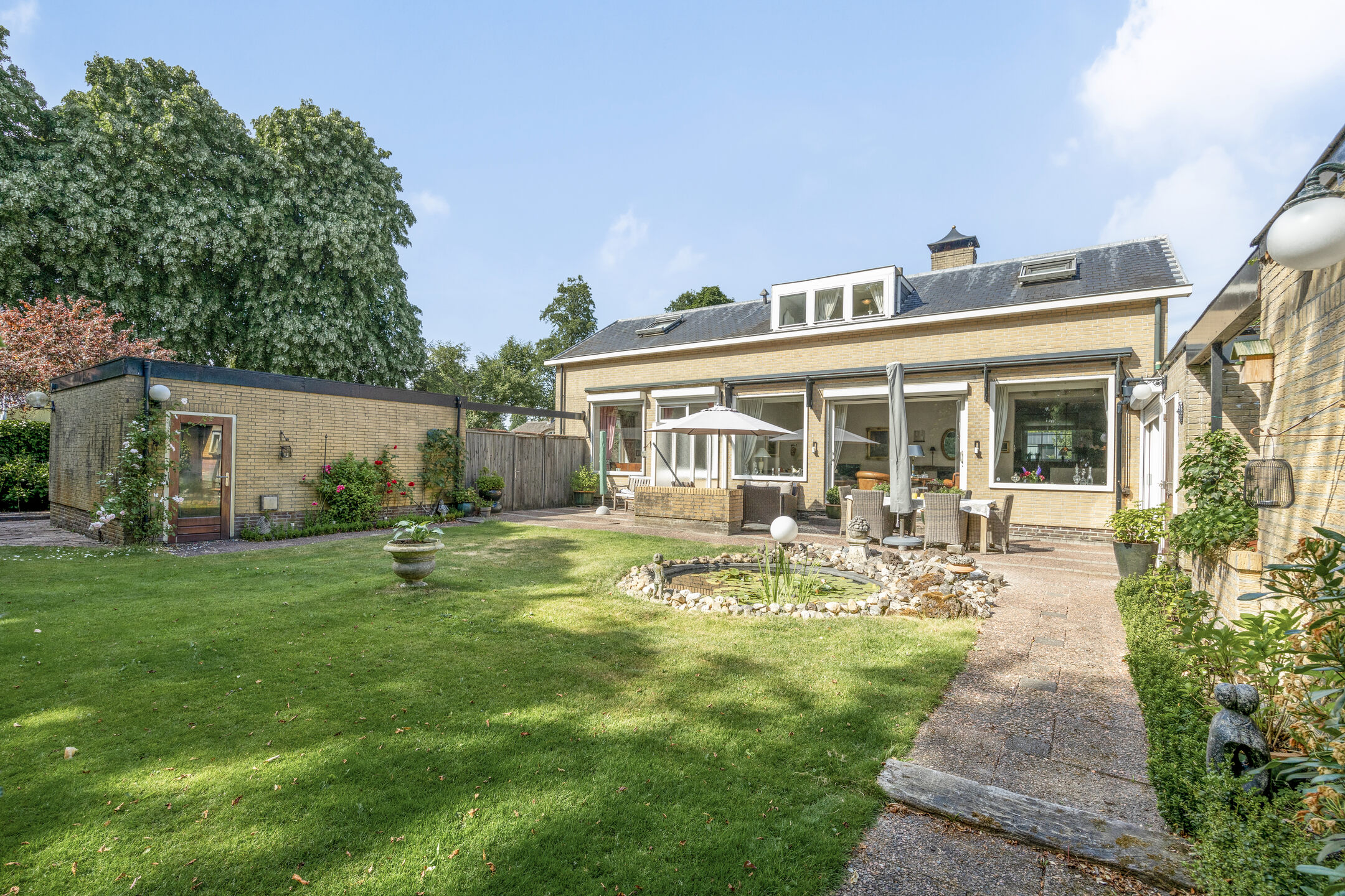 Upon entering a spacious living room with separate dining room, you are immediately embraced by the lightness brought by the numerous windows. The spacious sliding doors in the living room open onto a spacious panorama, where a lushly landscaped garden stretches out. The sun-drenched terrace, with garden lighting and a pond, offers a serene invitation to relax. The surrounding green oasis guarantees total privacy. The garden, with its spring drainage and sprinkler system, is lovingly maintained.