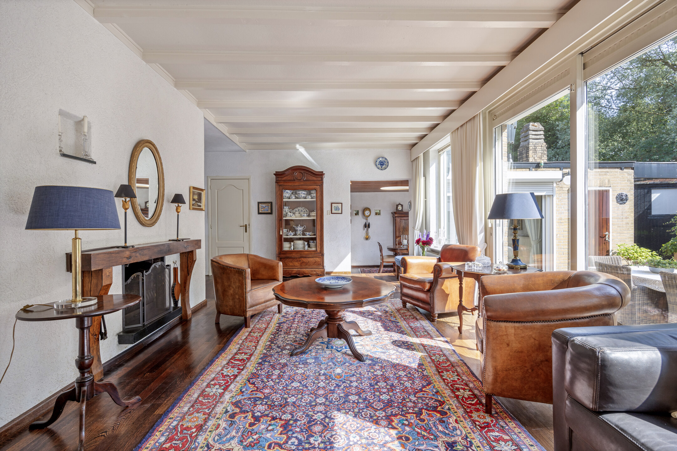 The living room has a beautiful panga-panga parquet floor, a fireplace and sliding doors to the large sun terrace facing south-west.