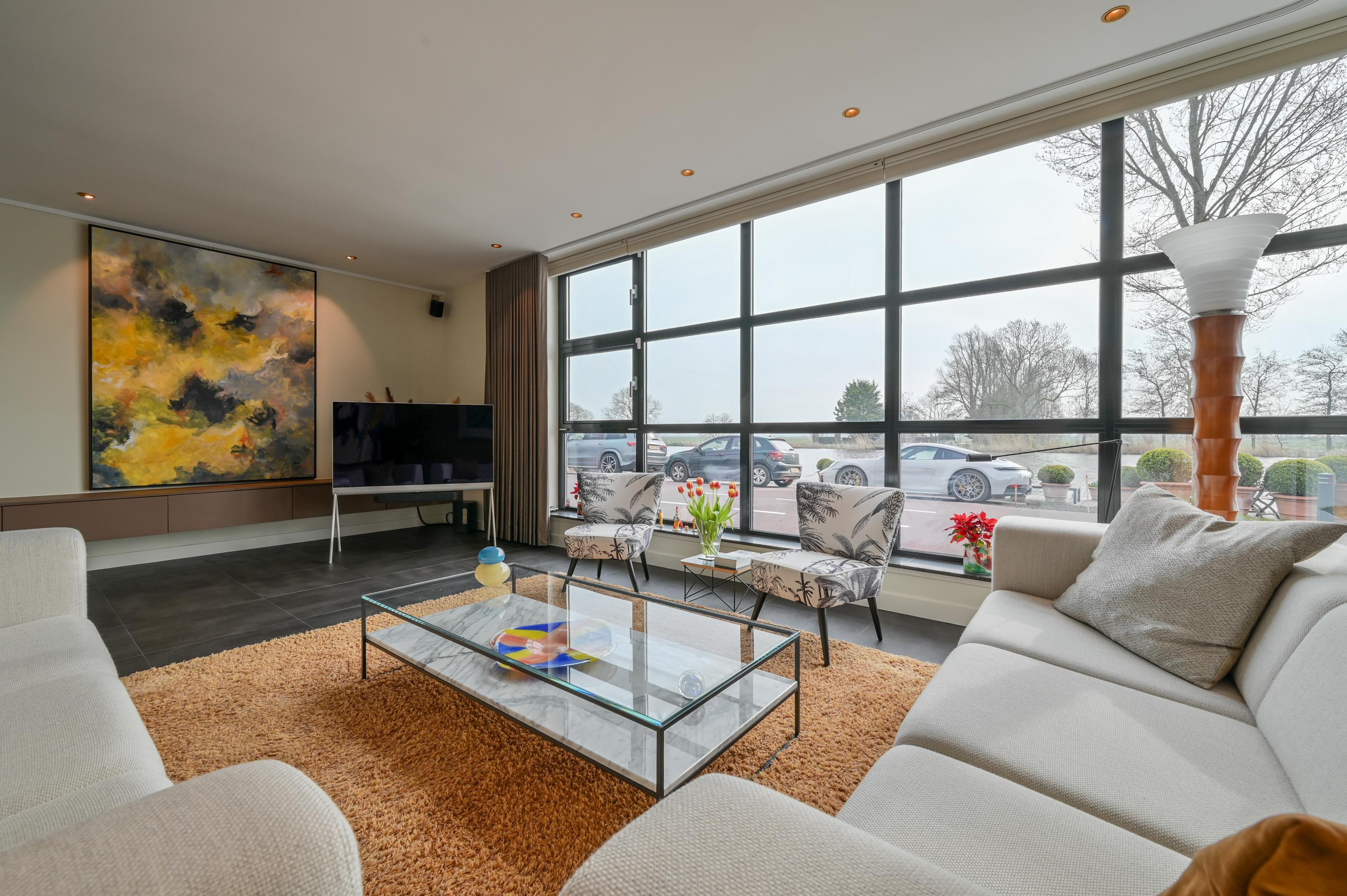 The second floor reveals a rooftop terrace with unobstructed views over the Amstel and polder, enriched by a pergola, integrated lighting, and water connection, creating an inviting setting for quiet reflection or hosting guests. Beneath the house, the garage is configured as a versatile studio, complete with kitchen, toilet, underfloor heating, and air conditioning, accessible via both the terrace and an electric entry.