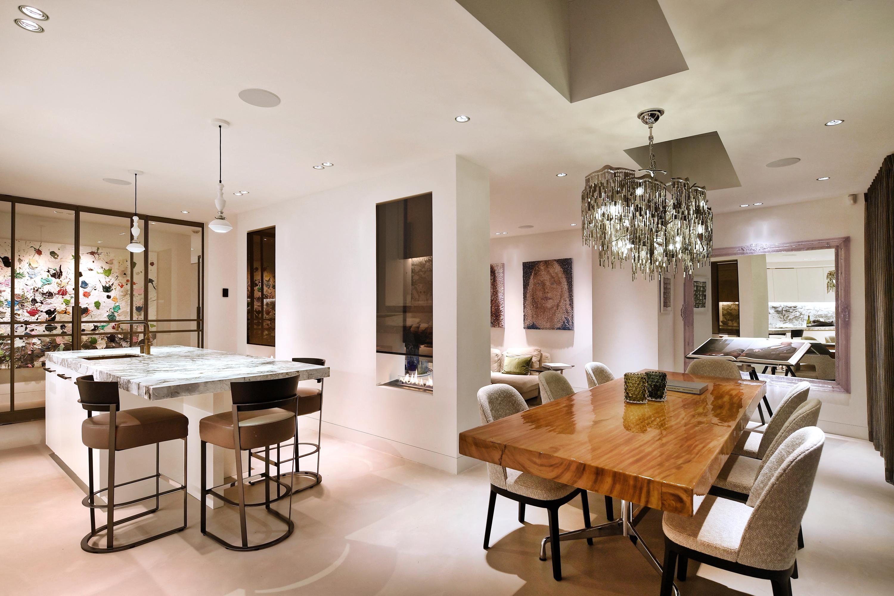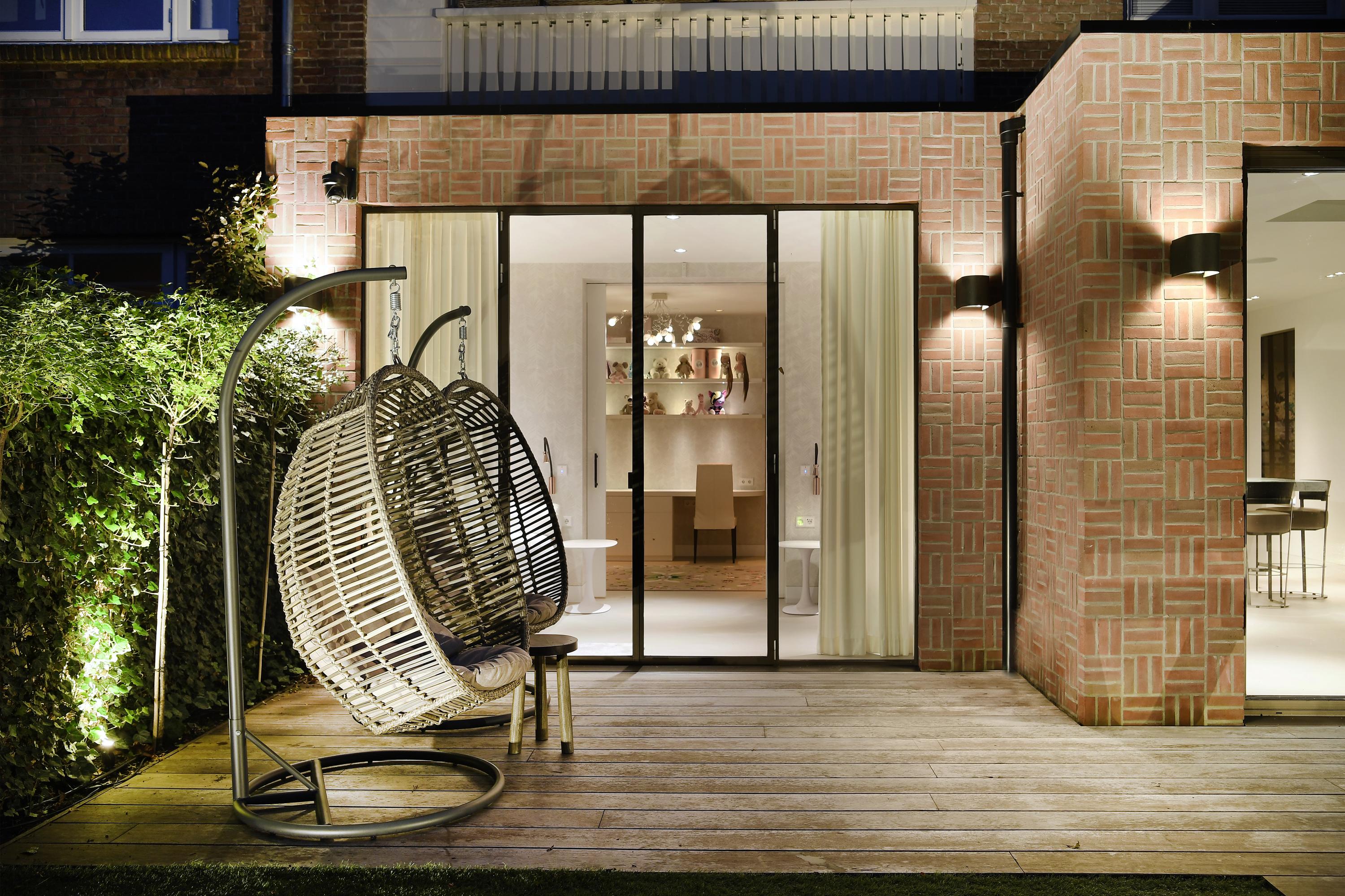 There is a bedroom at the back of this floor too, part of which extends into the extension; it opens out into the back garden via French doors. This large bedroom has a built-in desk and wall unit and sliding doors. A luxury bathroom on this floor is accessed from the hall and has a double, natural-stone washbasin vanity unit, a toilet and a large shower.