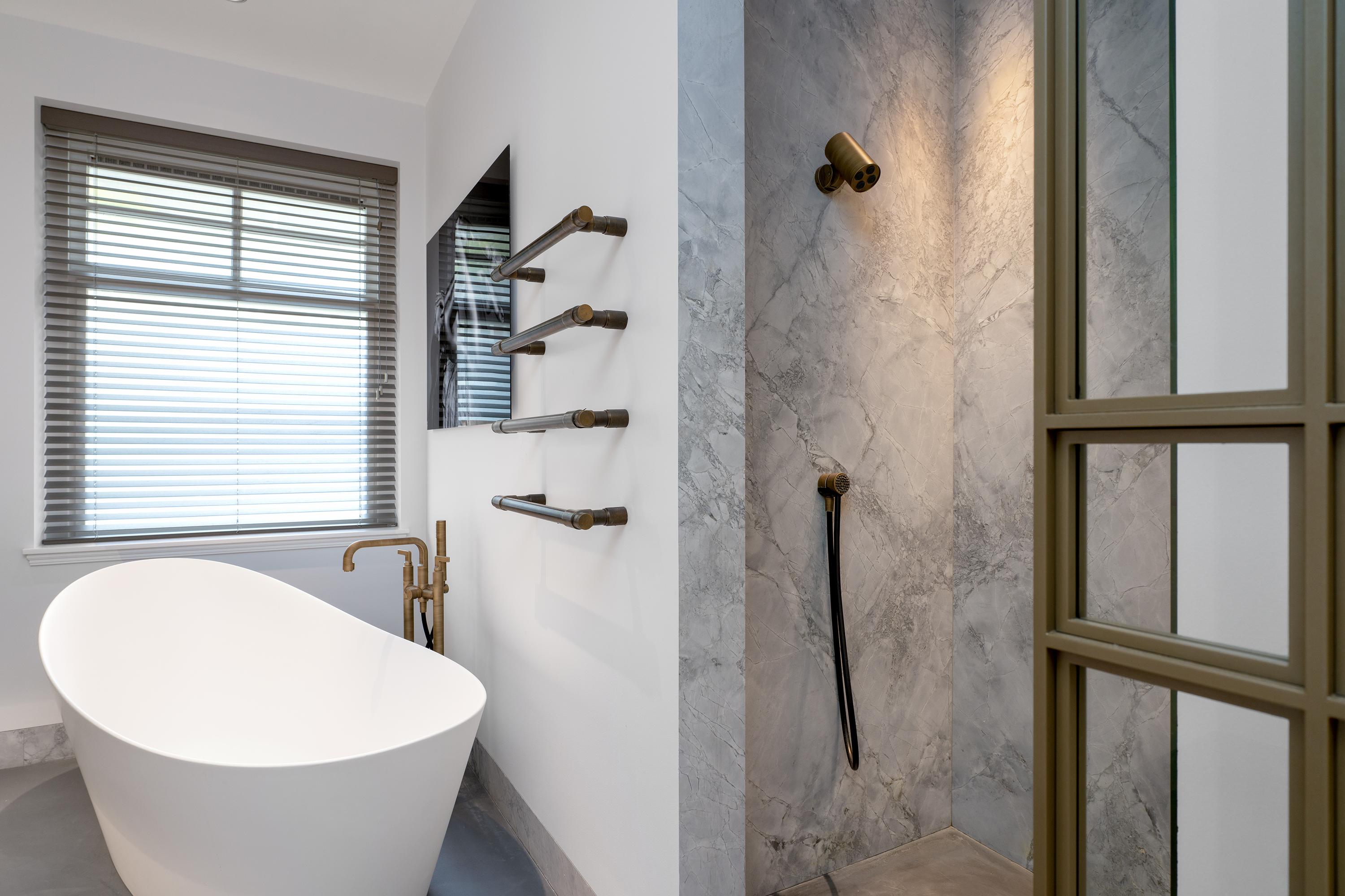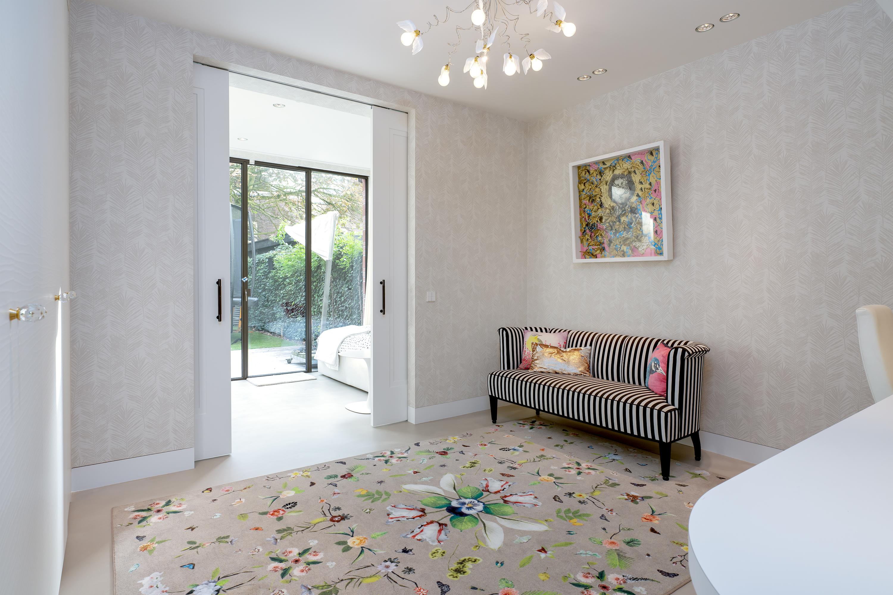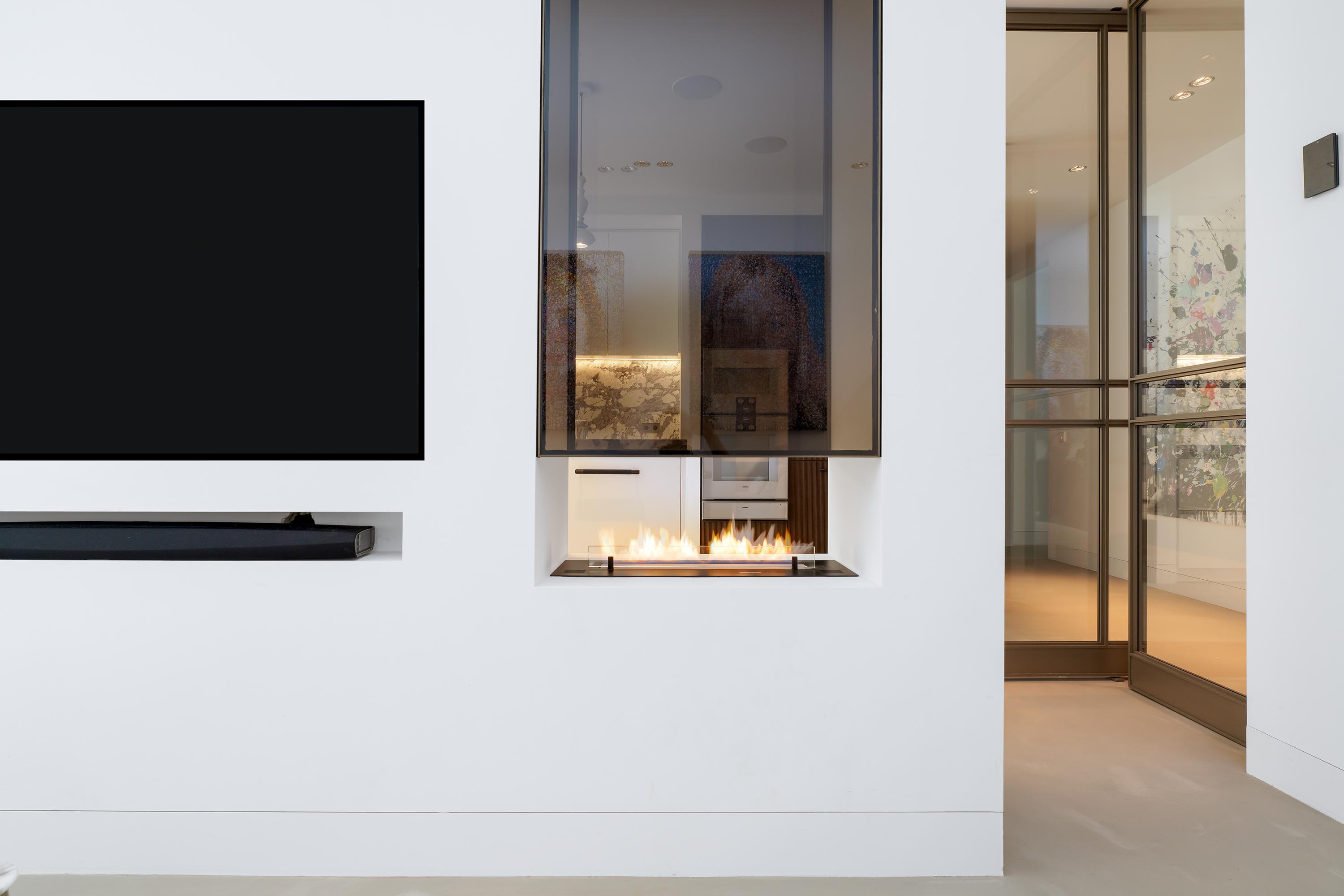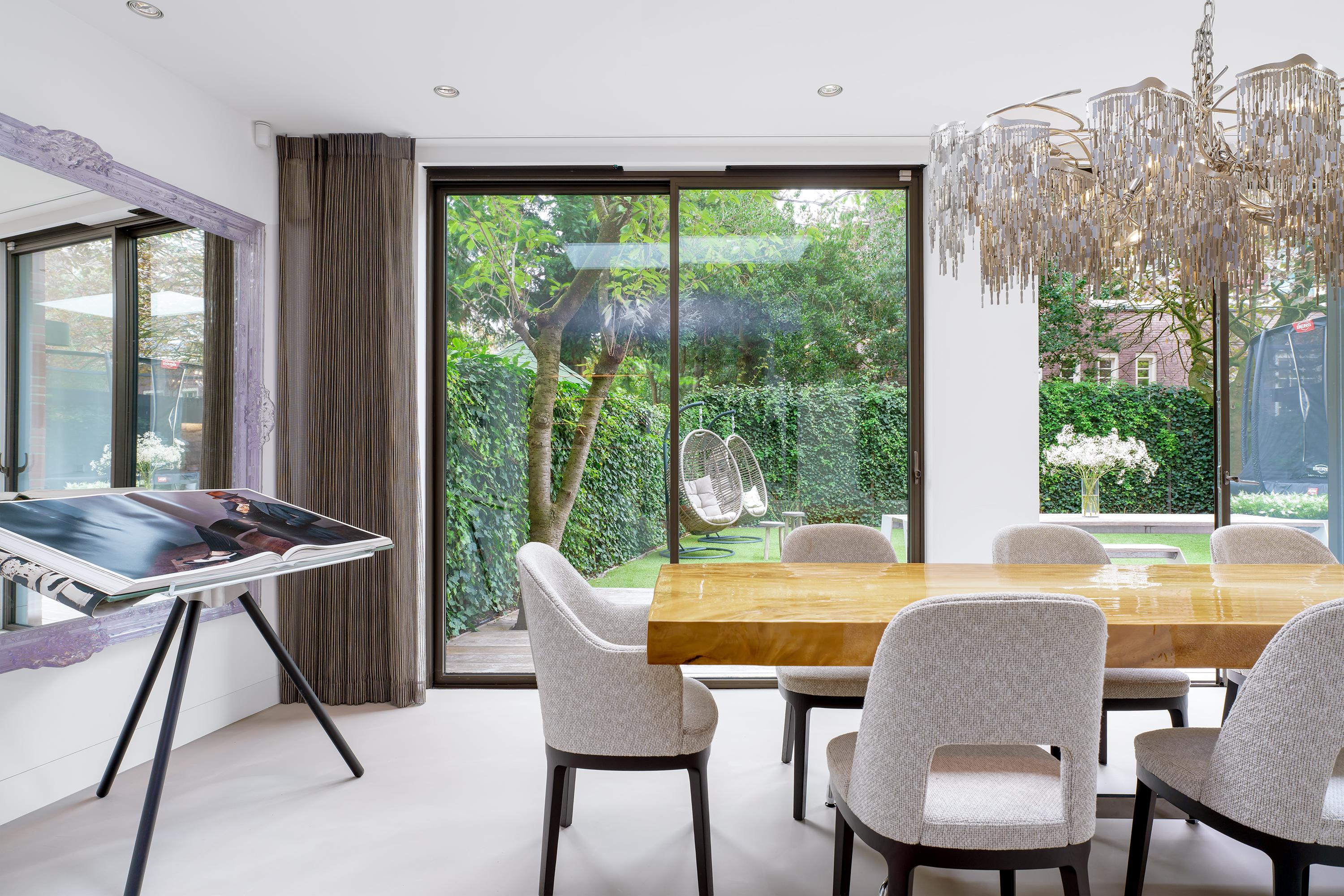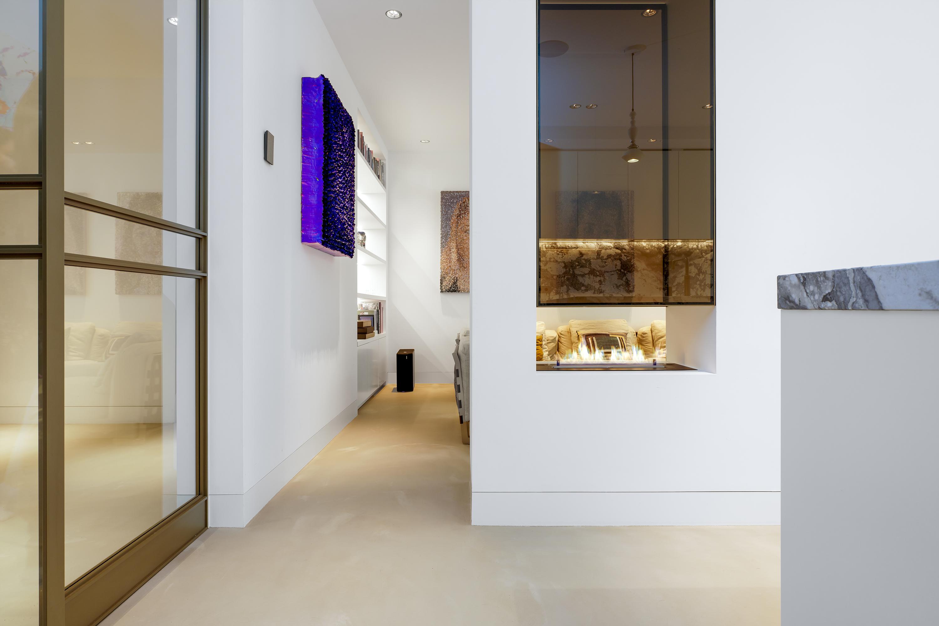 At the back of this floor, there is a large living space with a lovely, luxury kitchen, which really does come with everything you might expect: a sink island with a Quooker tap and also a cooler, oven, combi steam oven, hot plate, fridge, freezer, induction hob and built-in extractor unit. All the built-in appliances are by Gaggenau. The kitchen’s pièce de résistance is a special alcove with a pull-out unit for a coffee machine. Two attractive ethanol fireplaces separate the kitchen from the living-room area. The living space has been fitted with a number of built-in cupboards. The dining-room area, which is located in the extension, is next to the kitchen and the living-room area and comes complete with electric curtains. Skylights flood this space with light. A sliding door gives access to the large, south-east facing back garden.