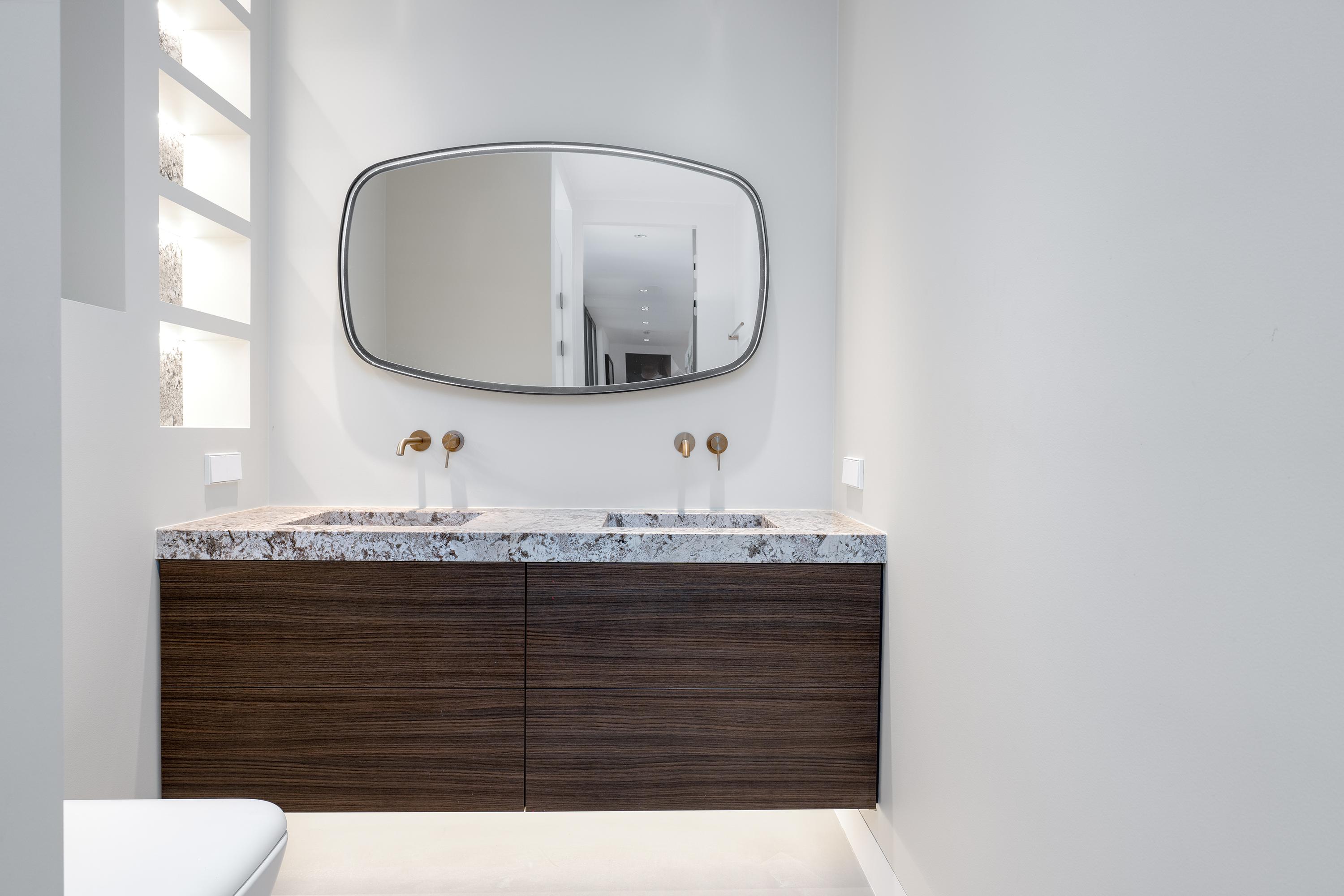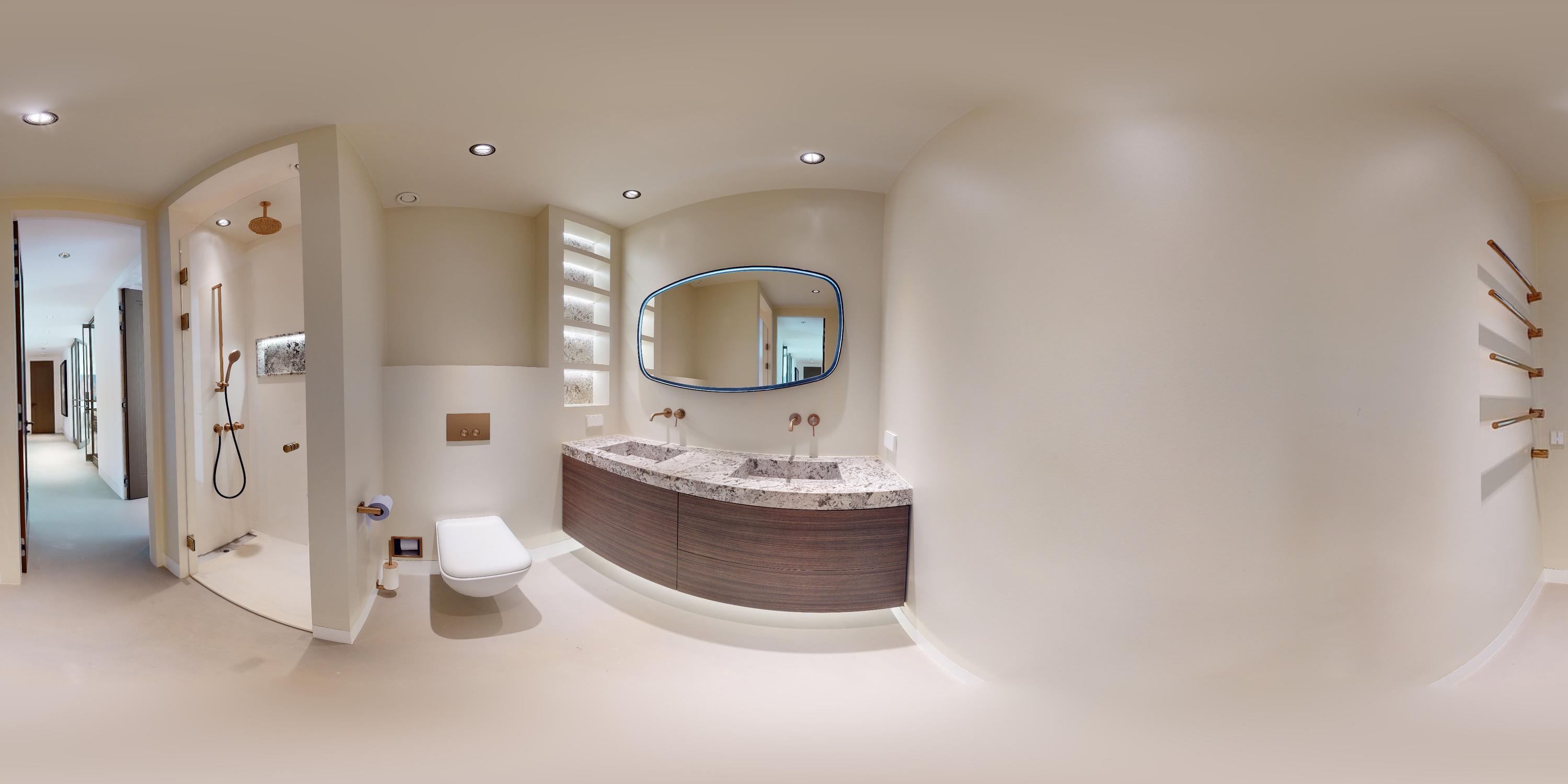 The master bedroom is situated at the front of the apartment on this floor. This spacious room has a large walk-in closet on both sides and a built-in dressing table. The master bedroom also has a luxury en-suite bathroom with a stand-alone bath, large rain shower, a double, natural-stone washbasin vanity unit and a shower-toilet.