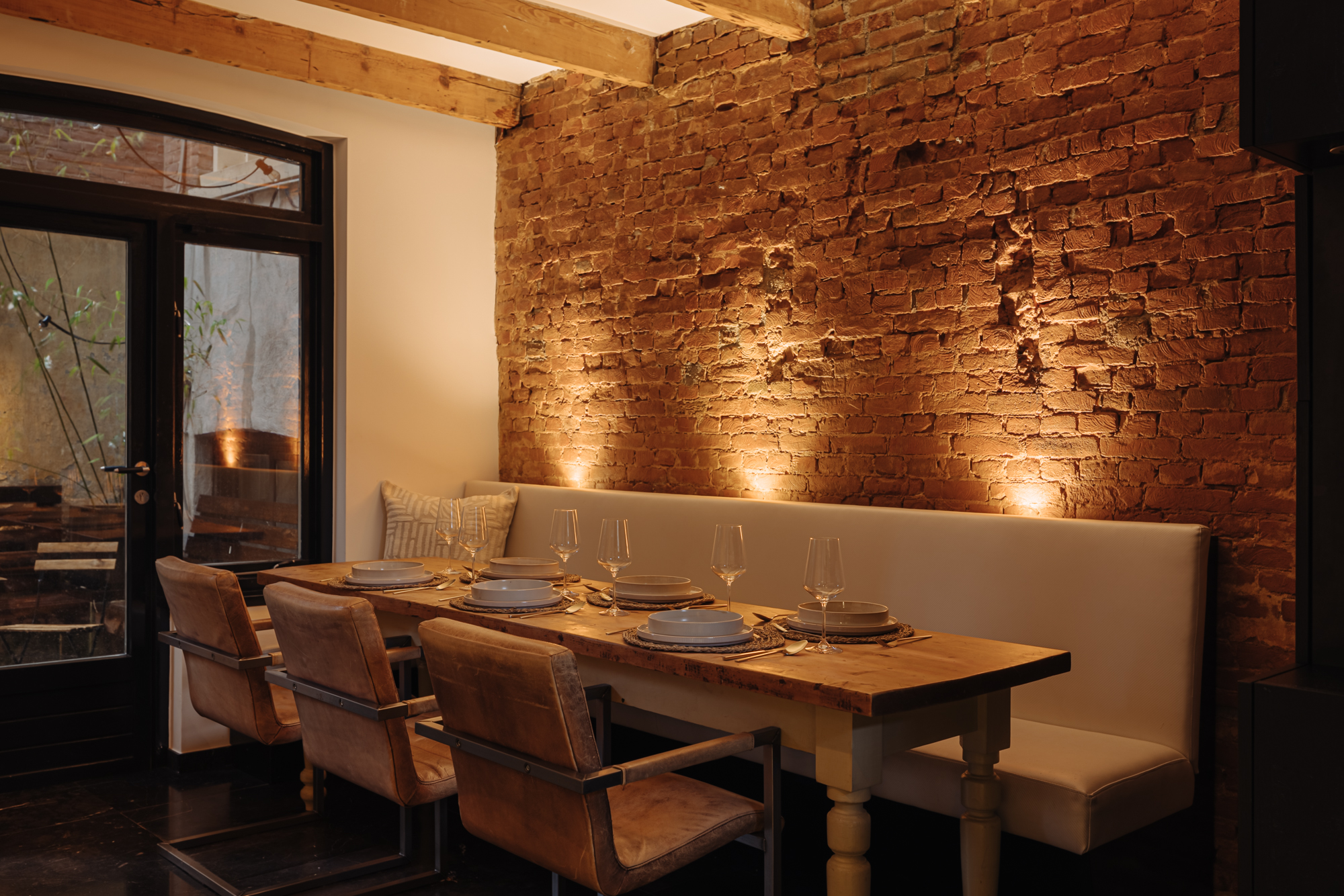 The dining area offers ample space for a large dining table. The exposed wooden beams give this level a warm, authentic atmosphere. Double doors open onto the patio, an ideal spot for a quiet breakfast or morning coffee in the sun.