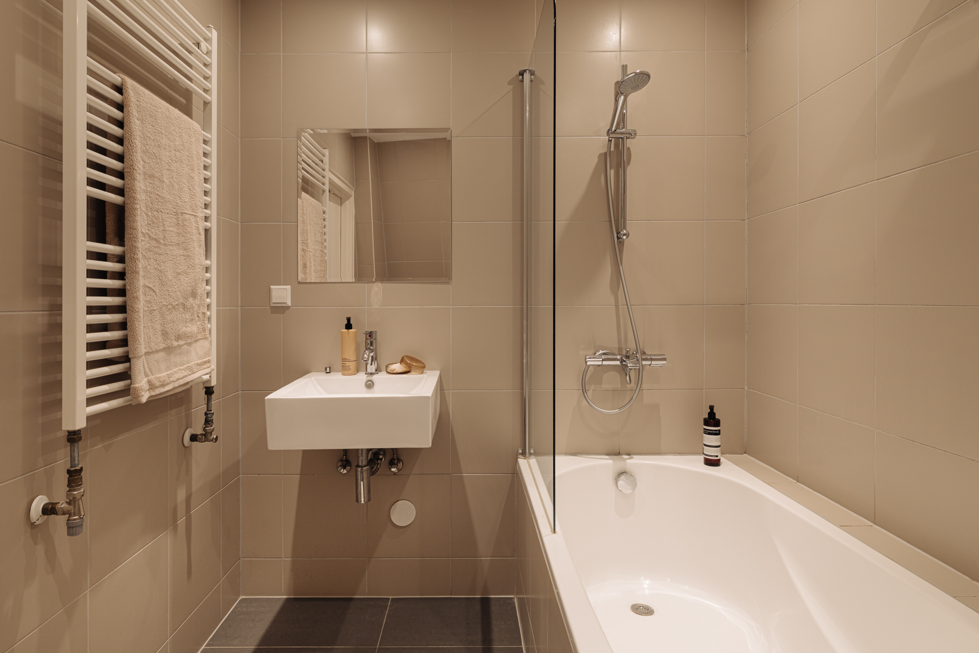 The bathroom on this level is dark and refined, fully equipped with a double vanity, bathtub, double shower and toilet. The combination of natural stone and mosaic tiles creates a warm and relaxing atmosphere.