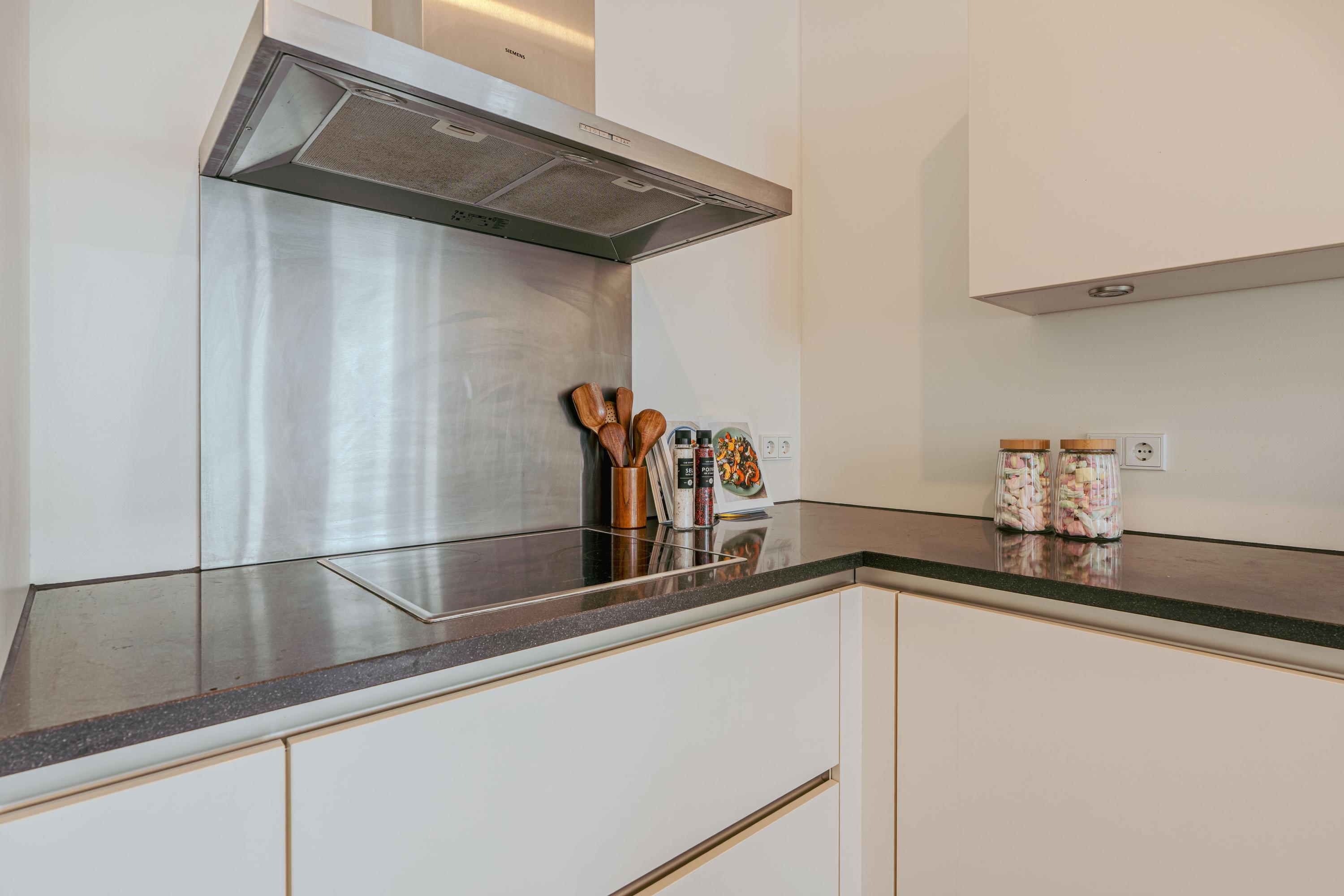 Upon entering the 8th floor, you step into a spacious hallway with a meter cupboard, separate toilet, and room for a wardrobe. From here, you enter the bright and airy living area, where the views immediately catch your eye, creating a sense of openness and calm. At the front, sliding glass doors give access to the generous balcony that spans the full width of the apartment — an ideal spot to relax, enjoy breakfast, or take in the view. The open-plan kitchen is situated at the rear and is equipped with modern built-in appliances, including a fridge, freezer, induction hob, Quooker, and dishwasher.