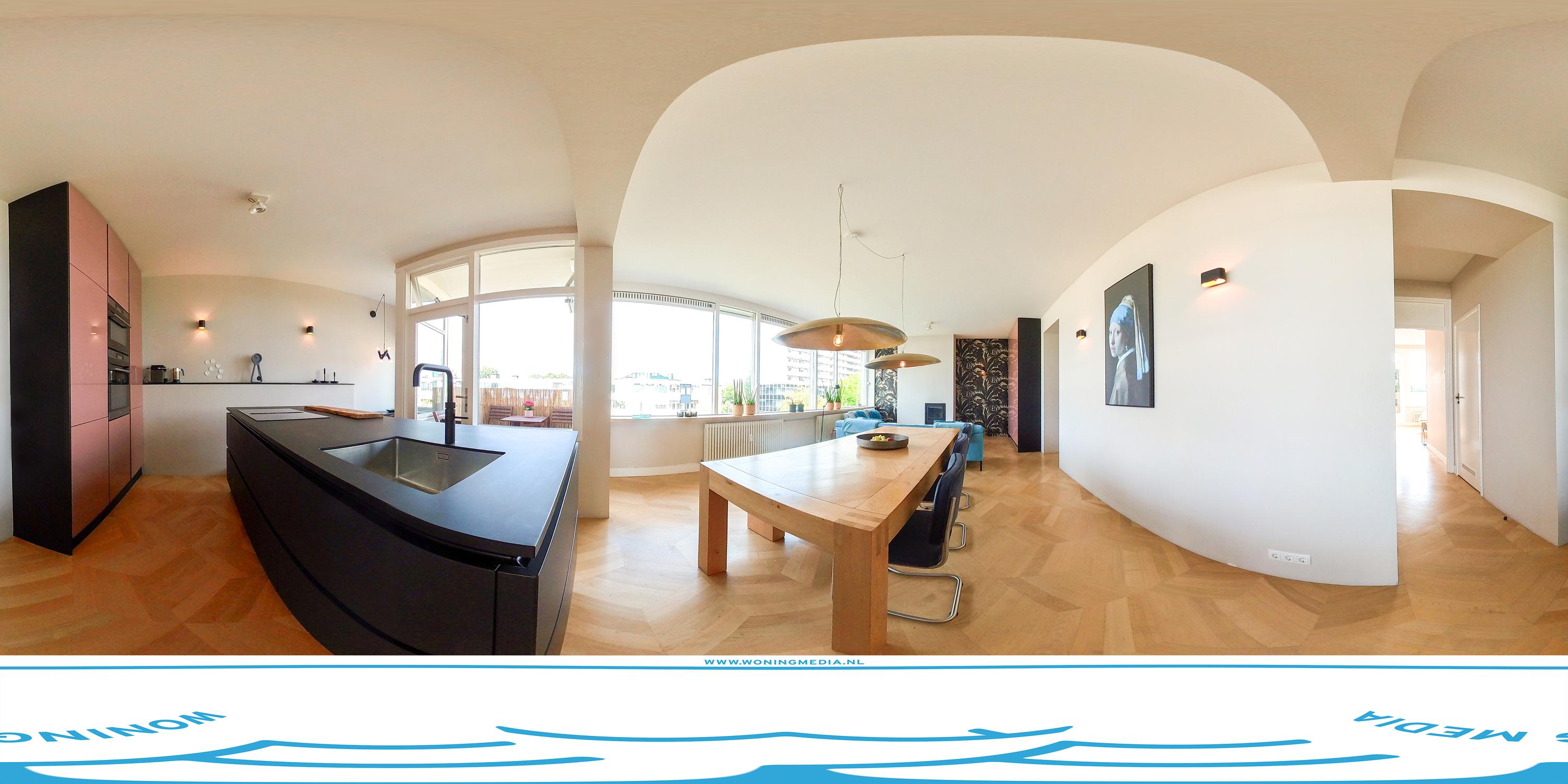 Upon entering, you are welcomed by a spacious hallway with an elegant parquet floor and practical built-in cupboards. The bright living area comprises a generous open-plan kitchen, dining space, and a comfortable lounge featuring a built-in wood-burning stove. The modern kitchen, finished in black Fenix, is equipped with a cooking island including an induction hob, oven, combi-oven, dishwasher, large refrigerator, and Quooker. Thanks to the glass façade and two French doors opening onto the west-facing balcony, the living room is bathed in natural light. The apartment offers three bedrooms. The master bedroom, located at the front of the apartment, features an entire wall of wardrobes, an original built-in cabinet with safe, and direct access to the balcony. The other bedrooms also enjoy access to the balcony. The luxurious bathroom is fitted with a rain shower, bathtub, double washbasin, and a second toilet. Additional built-in storage spaces are available throughout the apartment, including a spacious utility room with connections for a washing machine and dryer. The entire apartment is finished with a herringbone floor and atmospheric lighting by Zuiver. With large windows on both sides, the home enjoys abundant natural light throughout the day. Morning sun streams into the bedrooms, while in the afternoon and evening the kitchen and living area are filled with warm sunlight. This not only creates an exceptionally bright and airy atmosphere but also enhances the overall sense of space and comfort.