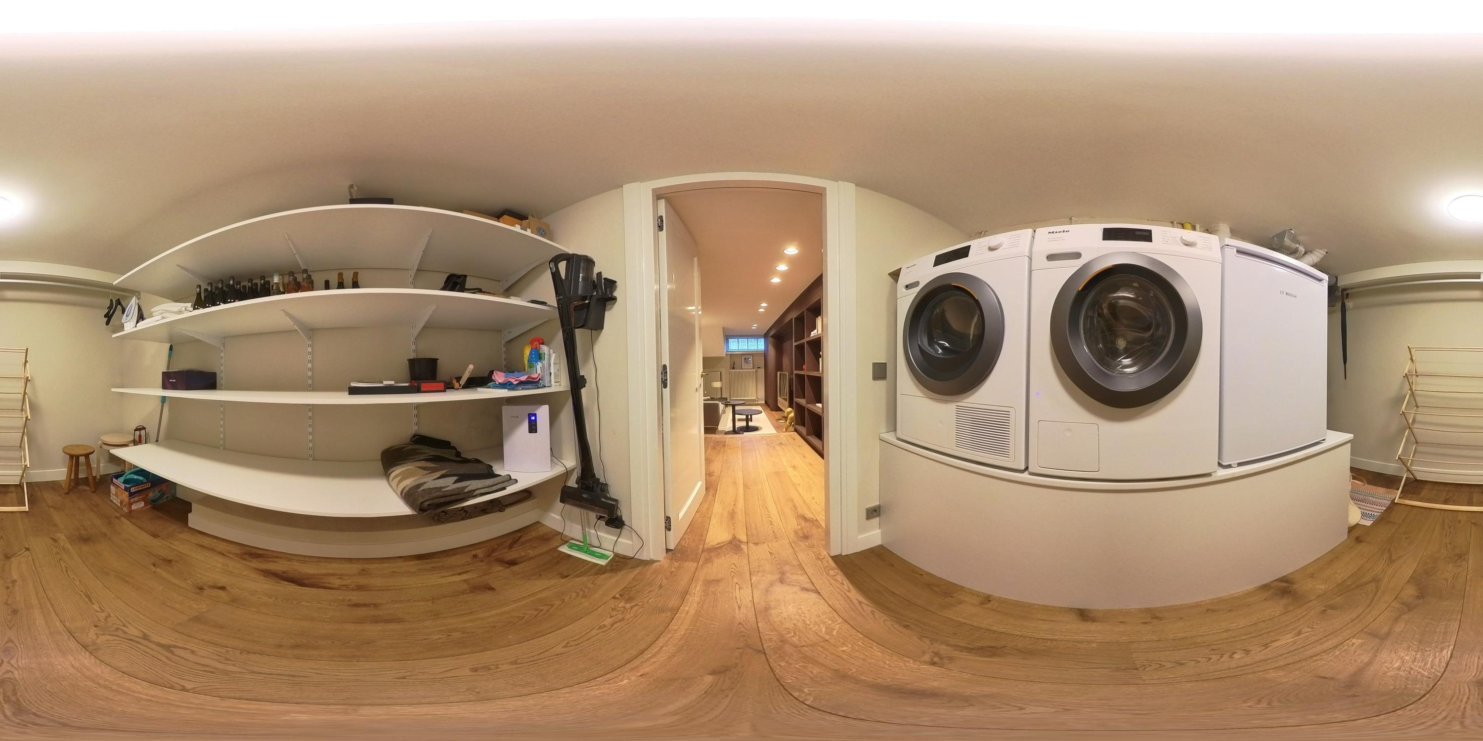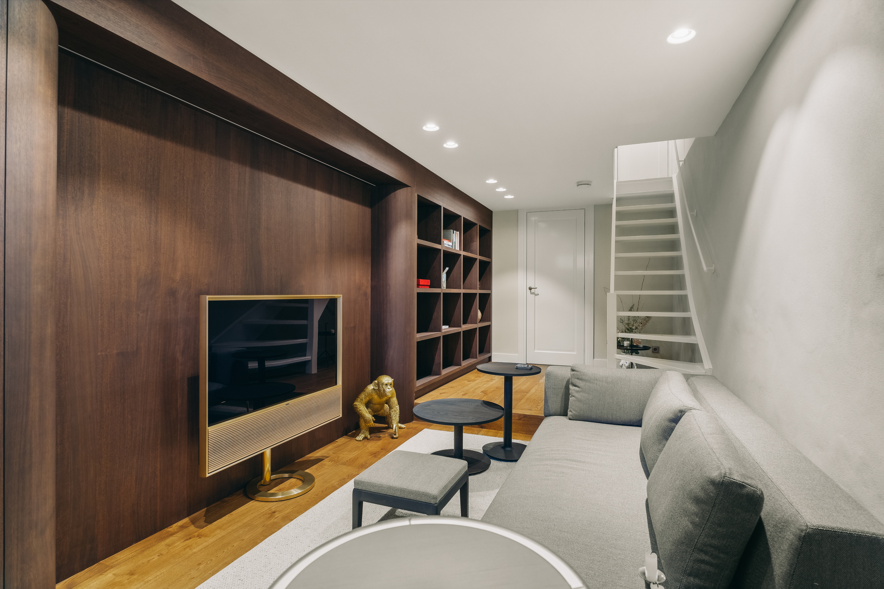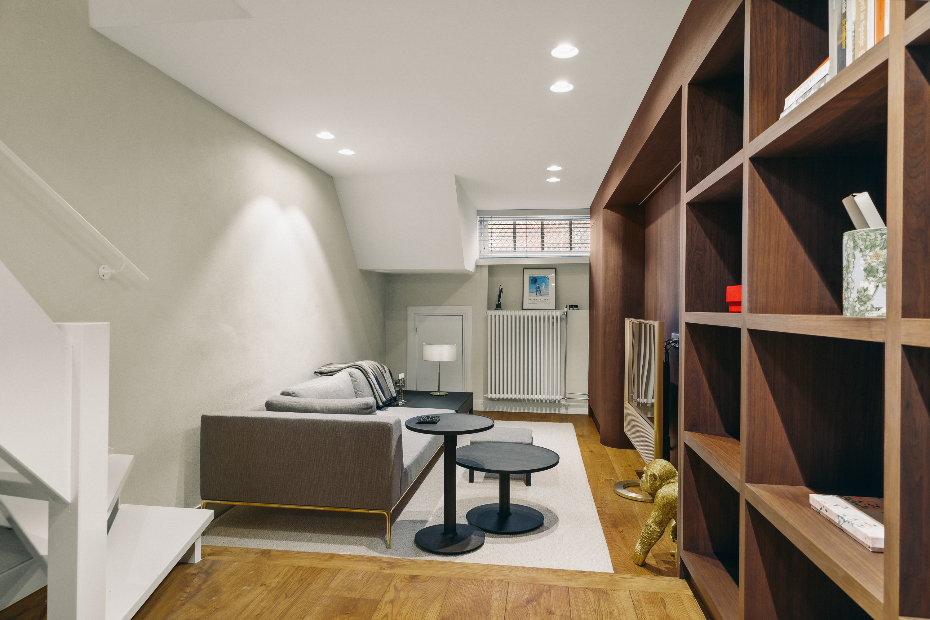 Below, the souterrain offers a tranquil living area with tailored storage in rich wood, alongside a spacious utility room equipped for practical daily needs. Ascending, the first floor presents an elegant salon marked by broad windows and a walnut-veneered wall for display or work. The top floors reveal a spacious bedroom, a bathroom finished in travertine with underfloor heating, and a dedicated dressing room lit by a skylight and cooled by air conditioning.