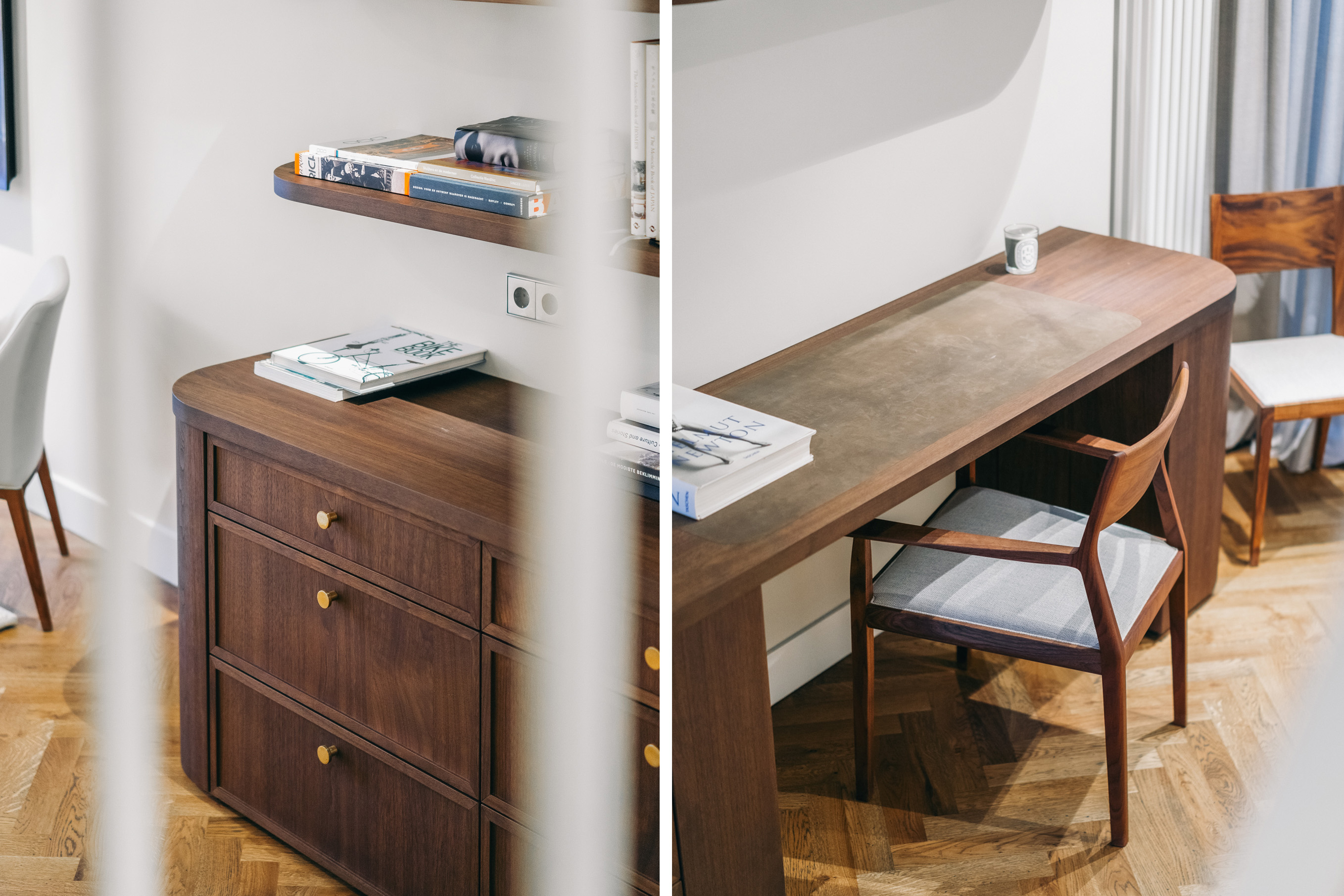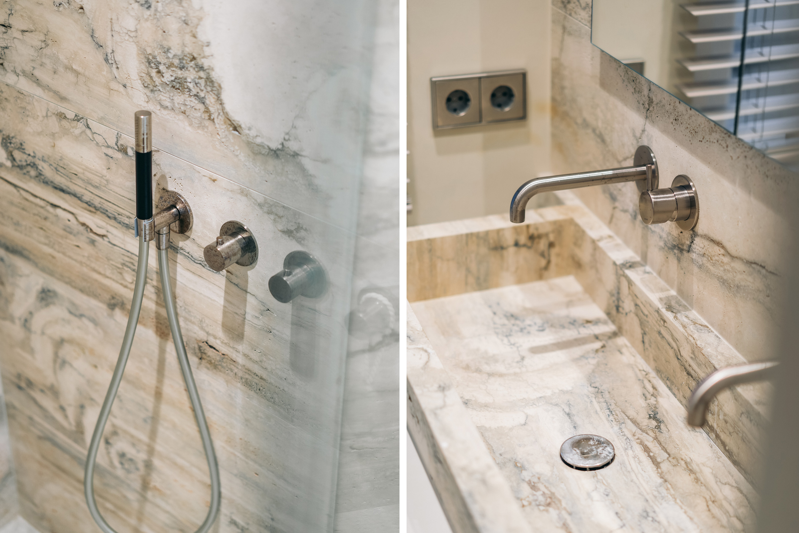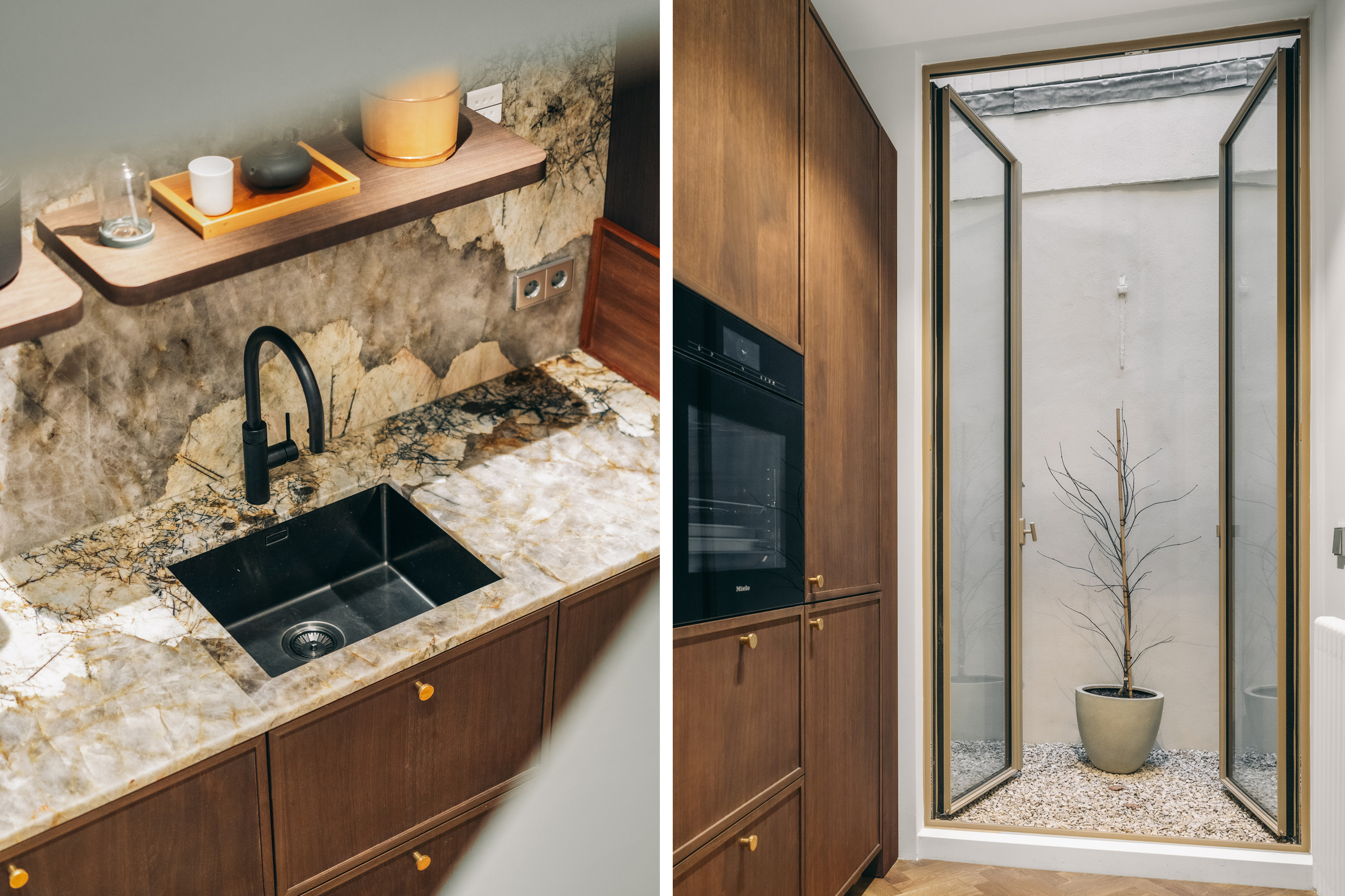 Below, the souterrain offers a tranquil living area with tailored storage in rich wood, alongside a spacious utility room equipped for practical daily needs. Ascending, the first floor presents an elegant salon marked by broad windows and a walnut-veneered wall for display or work. The top floors reveal a spacious bedroom, a bathroom finished in travertine with underfloor heating, and a dedicated dressing room lit by a skylight and cooled by air conditioning.