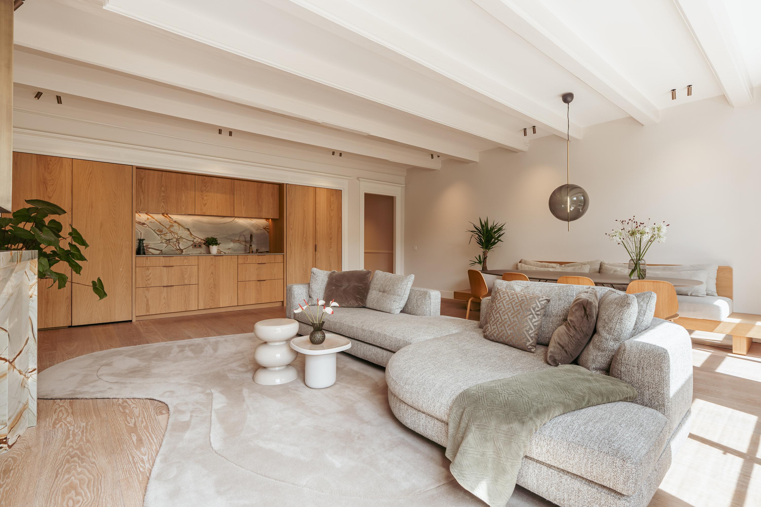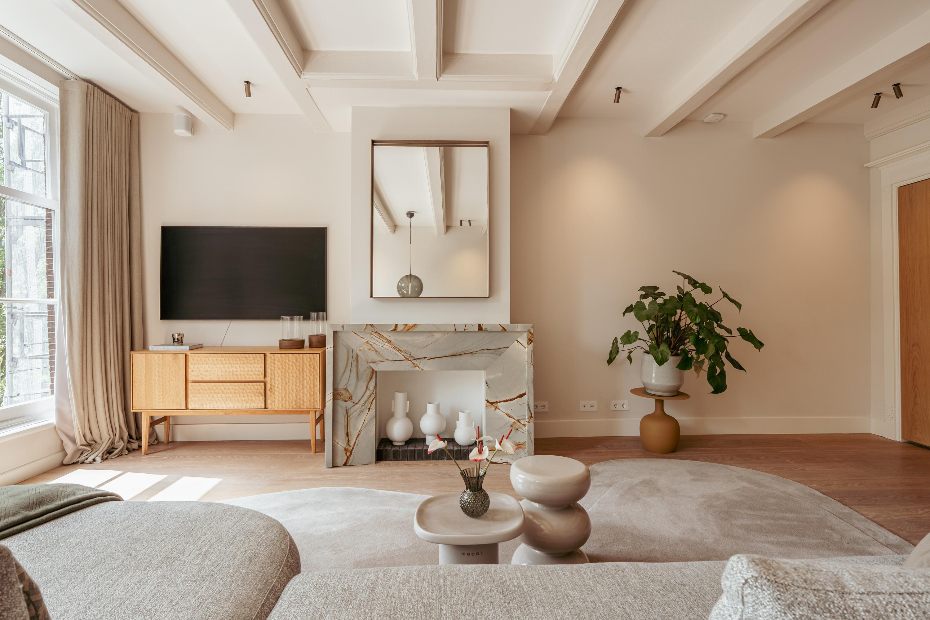 Aan de voorzijde bevindt zich de prachtige en breed opgezette woonkamer met grote raampartijen en fenomenaal uitzicht over de Herengracht. De ruimte wordt gekenmerkt door veel lichtinval en een bijzonder detail: de schouw en de achterwand in de keuken zijn uitgevoerd in hetzelfde kleurrijke marmer, wat zorgt voor een luxe en stijlvolle uitstraling.