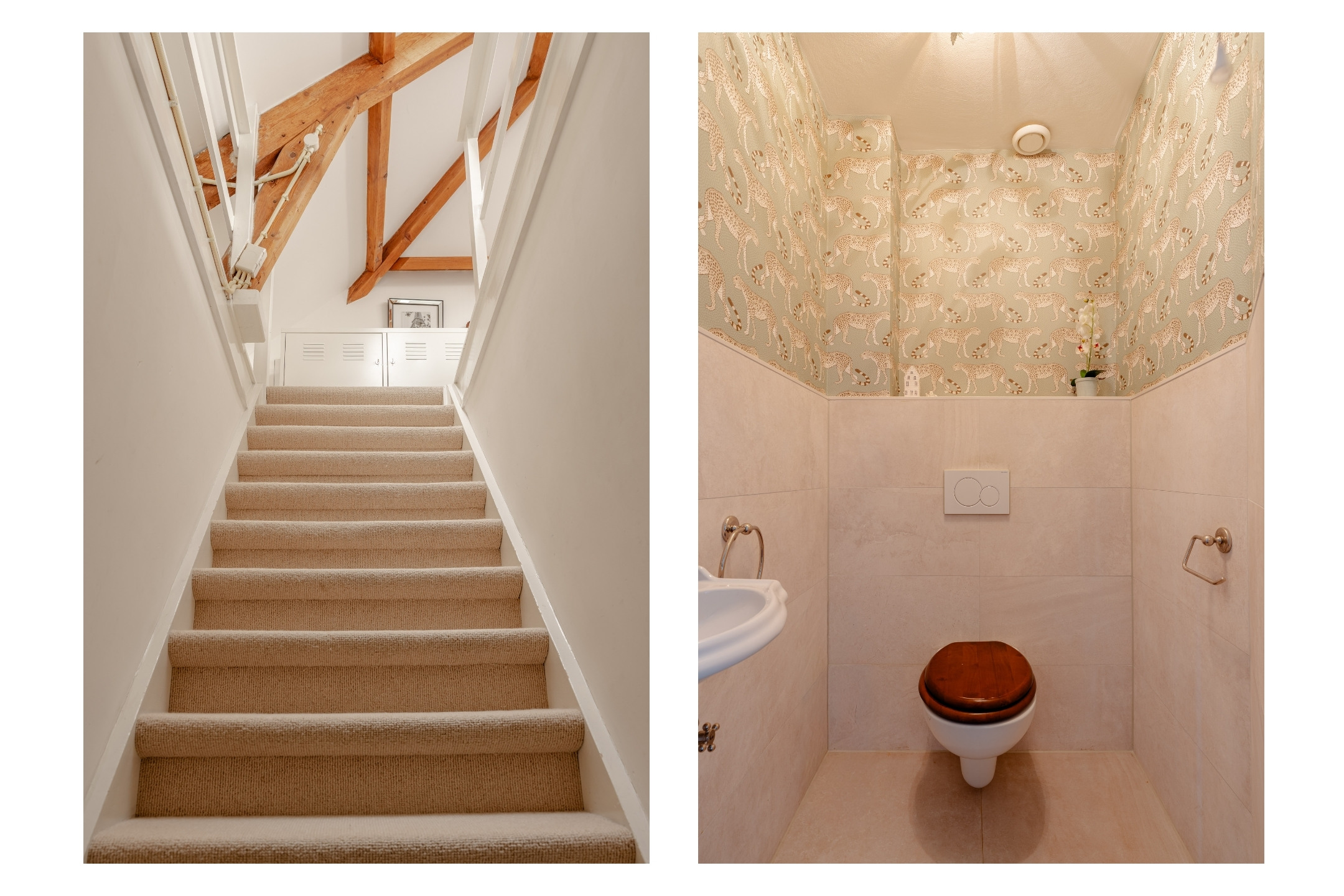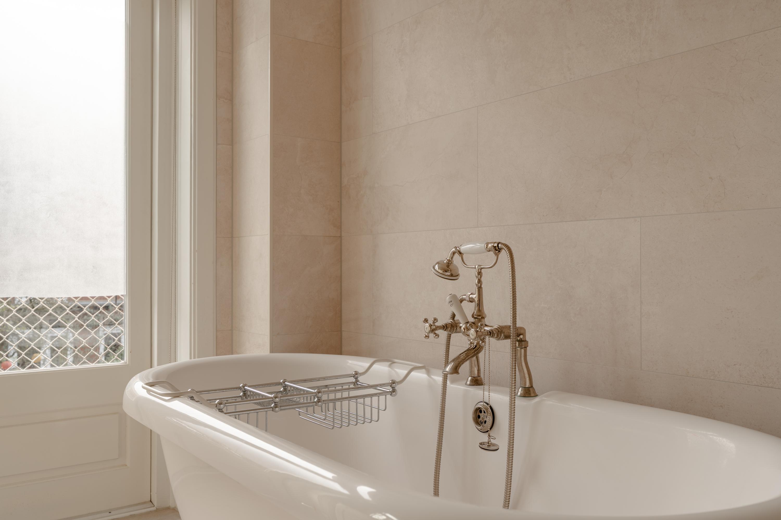 At the rear of the house is the spacious master bedroom with access to the balcony. The classic bathroom, finished in béton ciré, features a shower, double washbasin, towel radiator and a freestanding bathtub. The bathroom also provides access to the balcony through French doors.