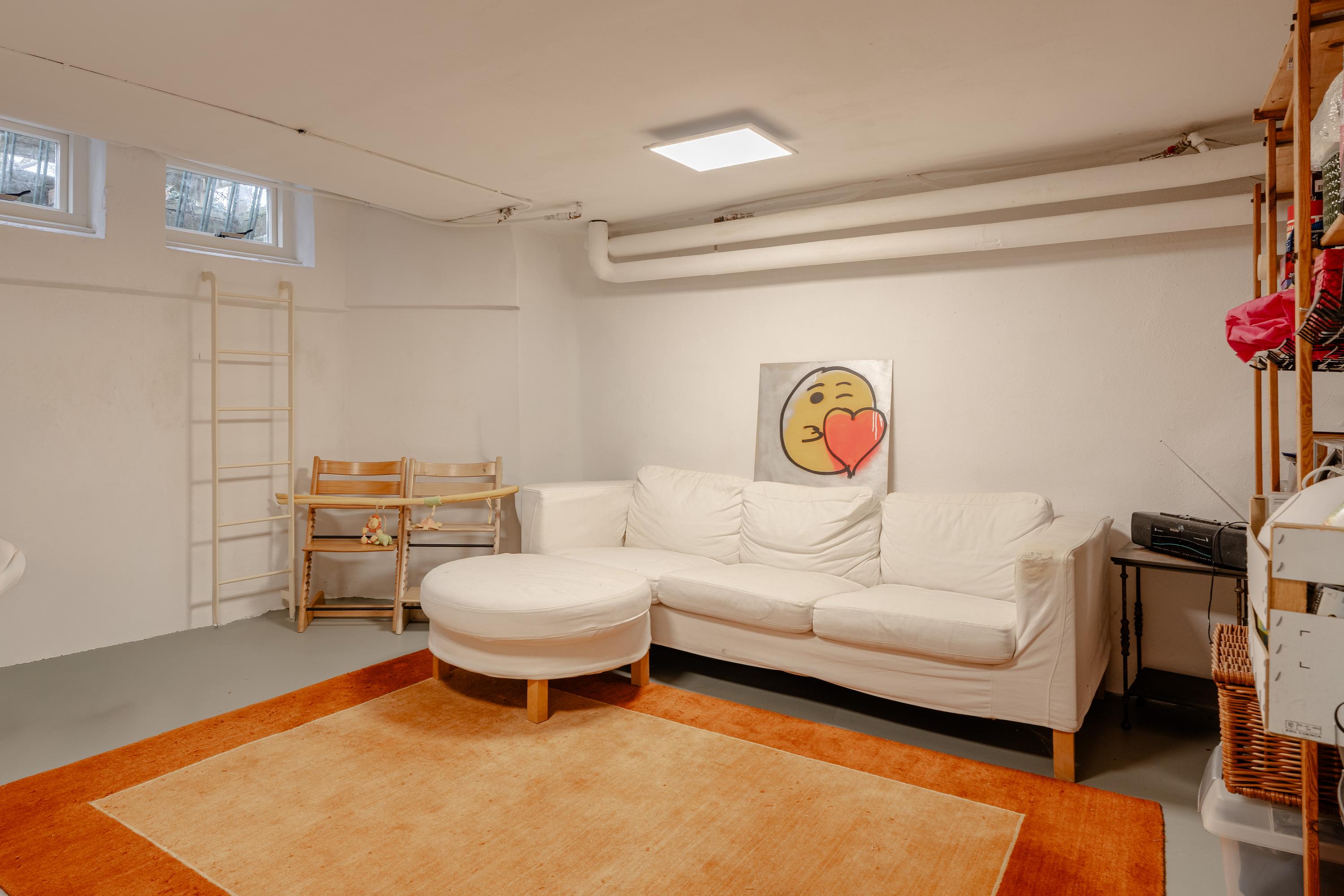 The connections for the washing machine and dryer are located here, and there is ample storage space. Due to its generous size and practical layout, the basement offers various possibilities such as a gym, playroom, workspace or studio.