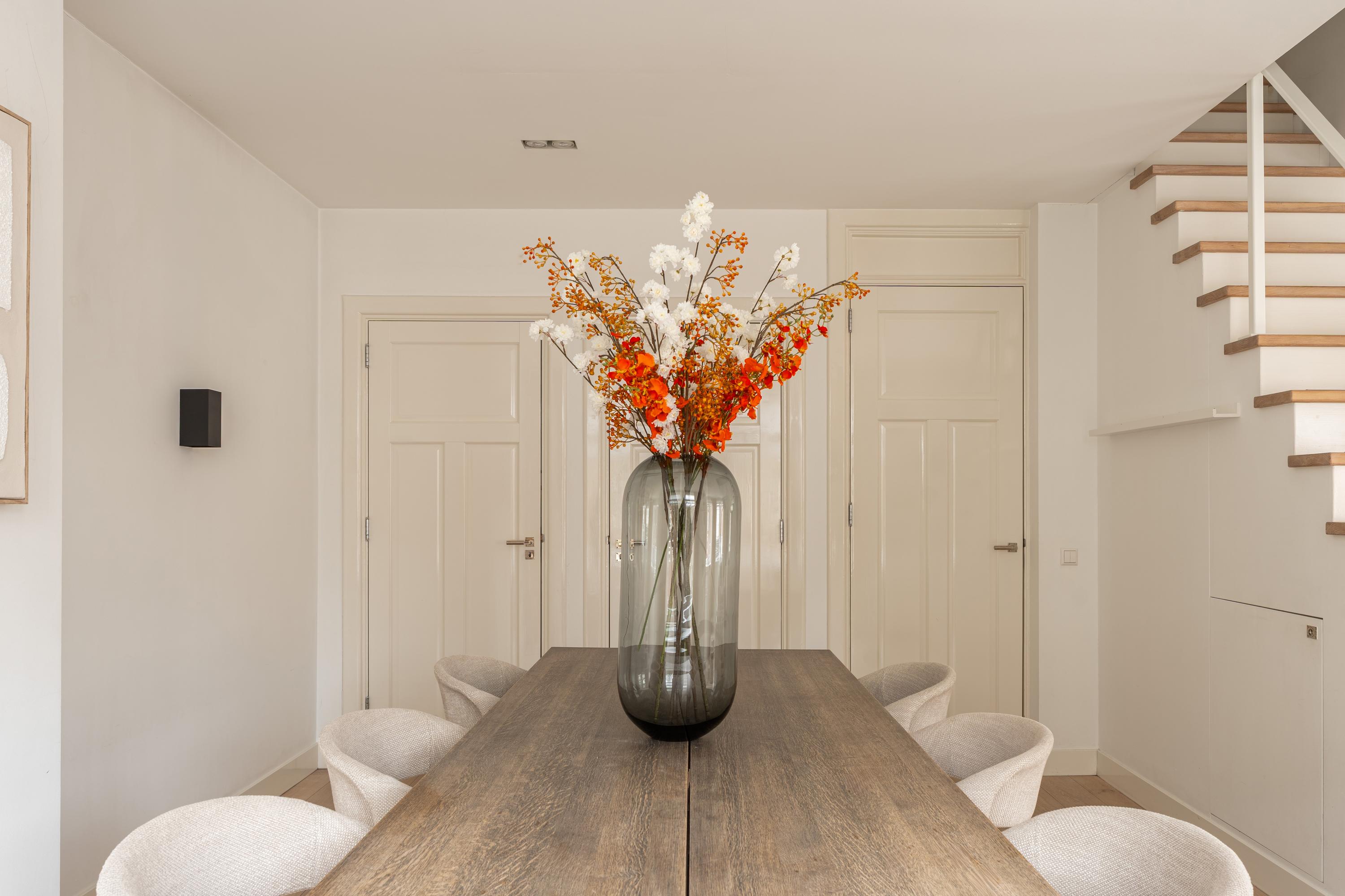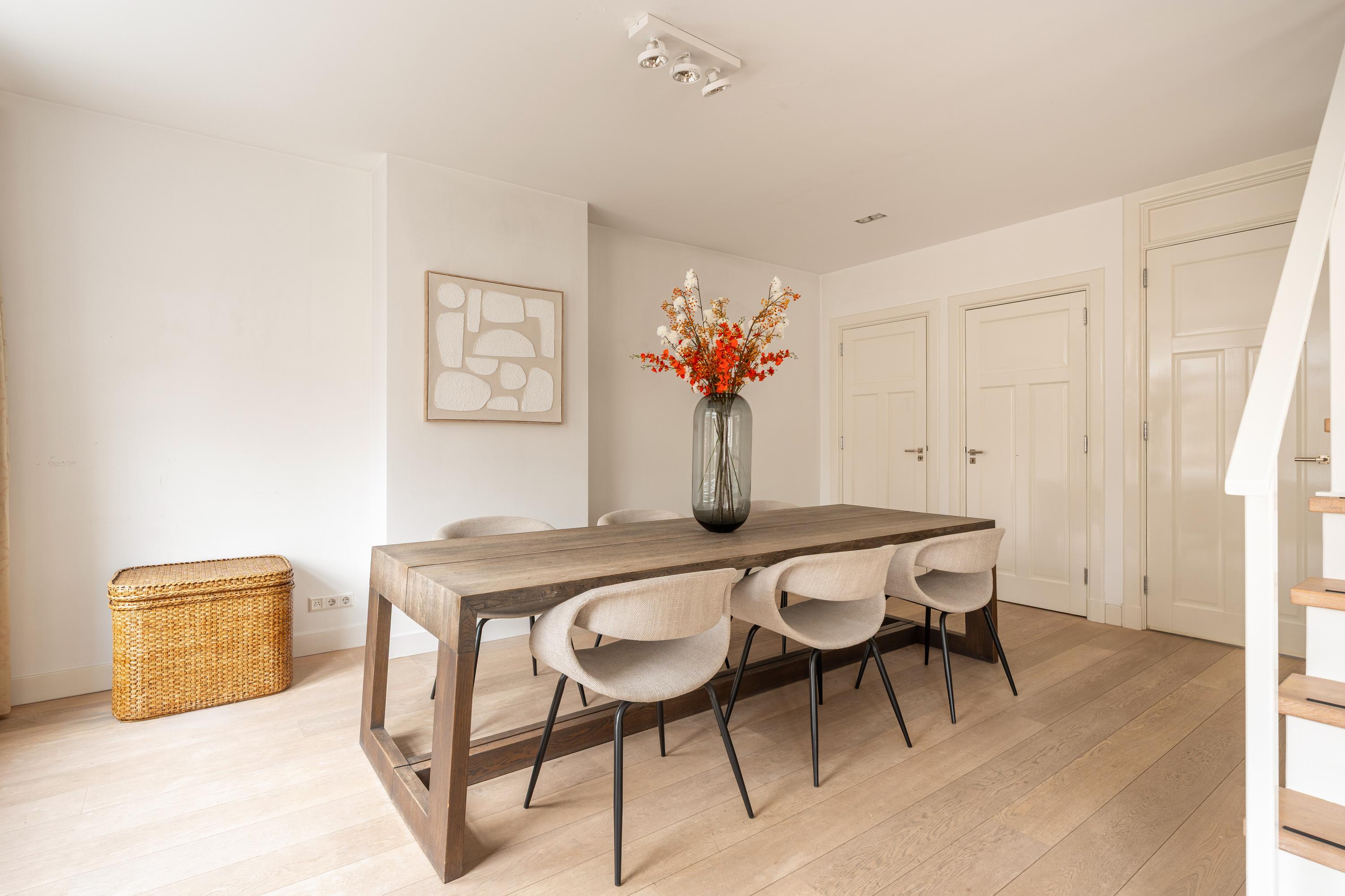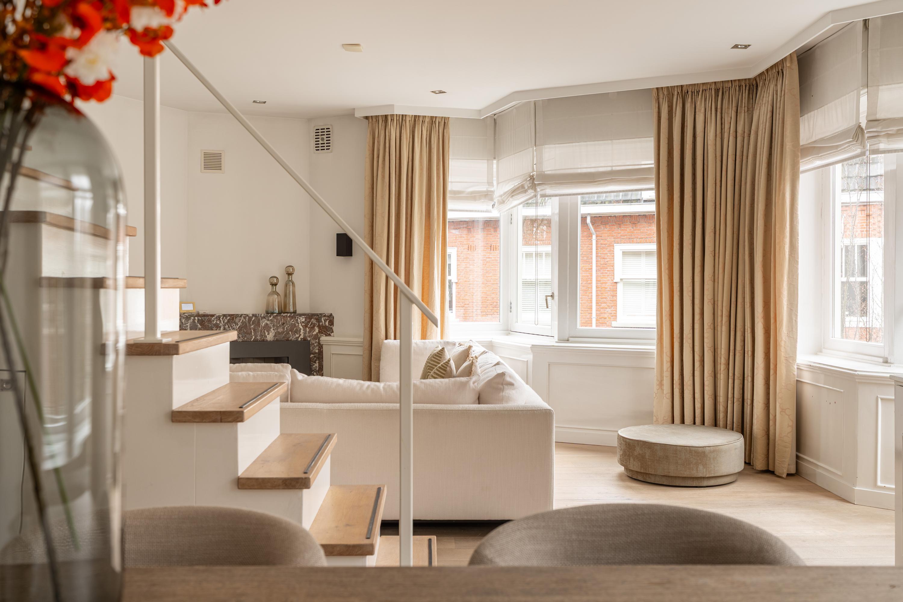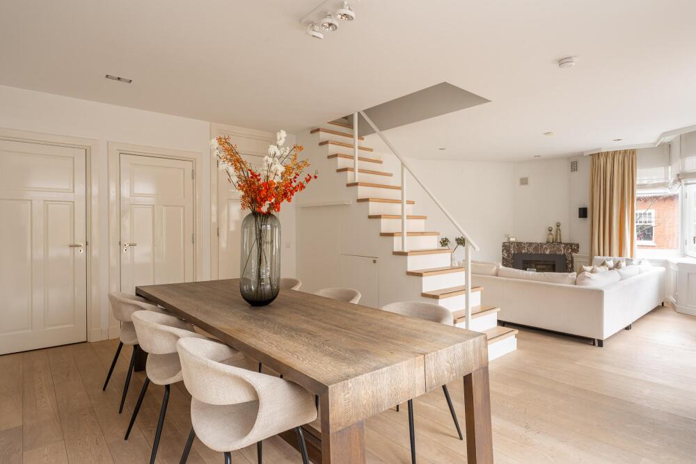 From the spacious landing you enter the exceptionally generous and light-filled living room, featuring a charming fireplace and a centrally positioned staircase that playfully divides the space into a sitting and dining area. Thanks to the many windows, the living room enjoys an abundance of natural light. There is also ample storage space in the form of bespoke, built-in cupboards.