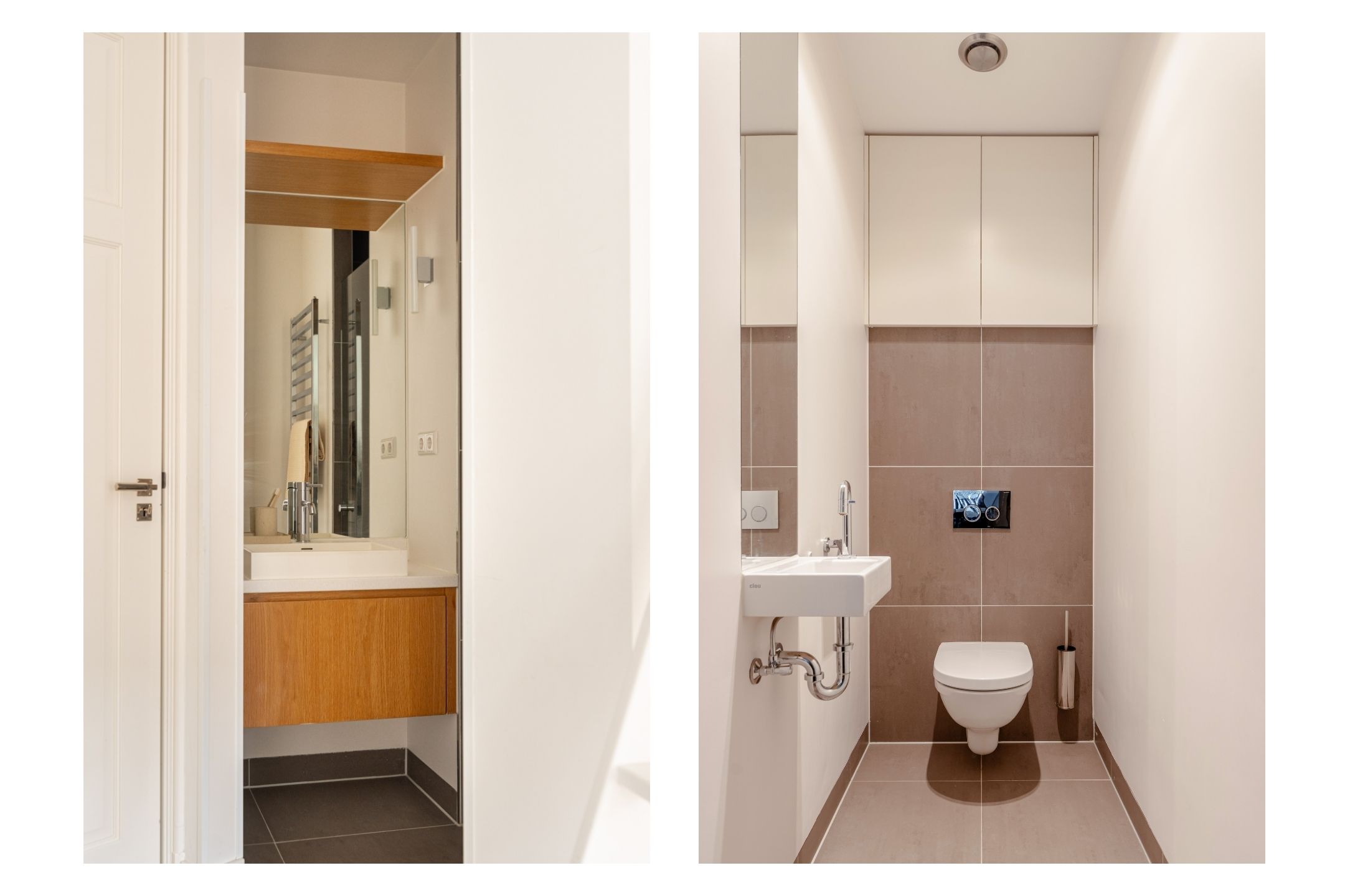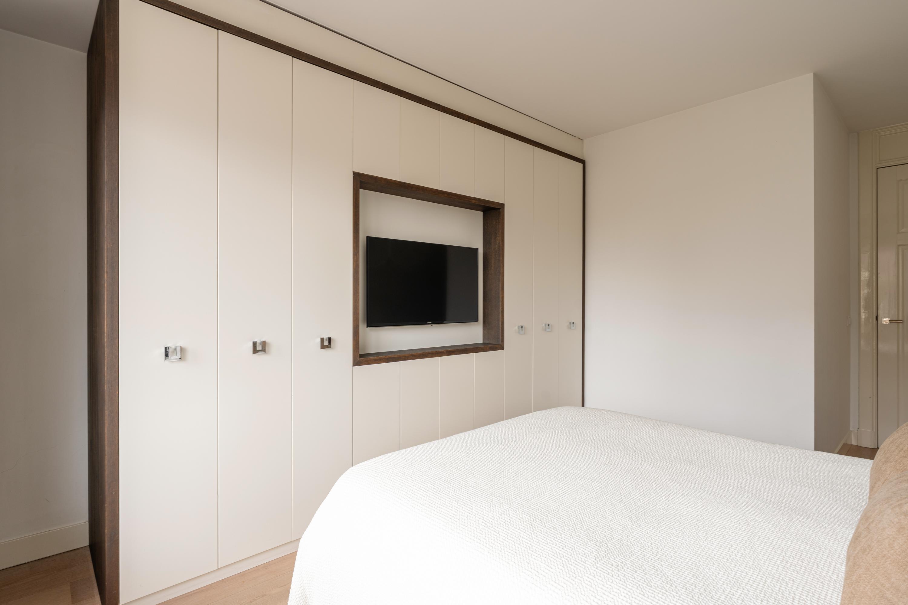 Via the staircase in the living room you reach the third and top floor of the apartment. Here you will find two well-proportioned bedrooms, both featuring large windows and bespoke built-in wardrobes. The master bedroom additionally boasts a stylishly integrated television within the fitted cabinetry.