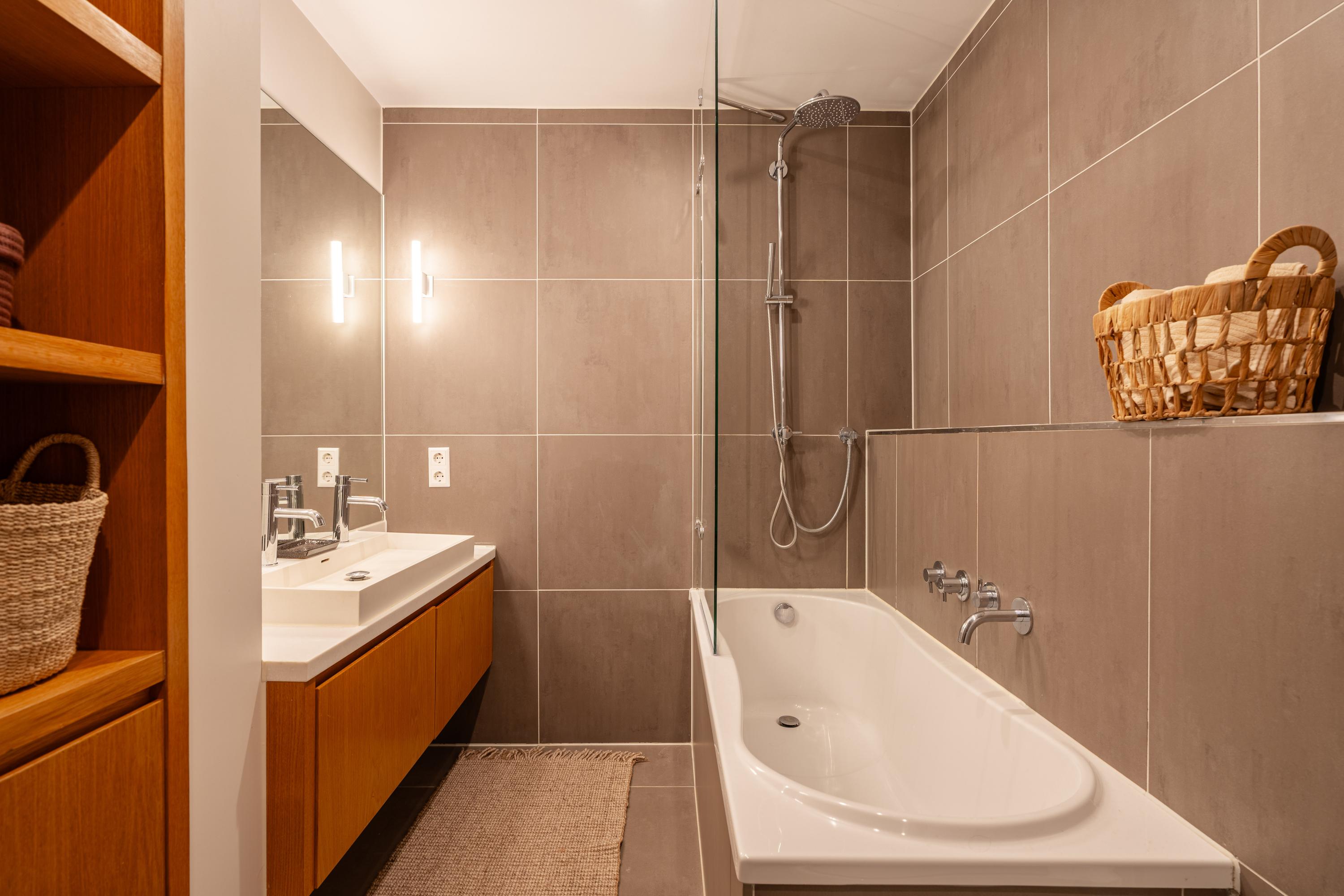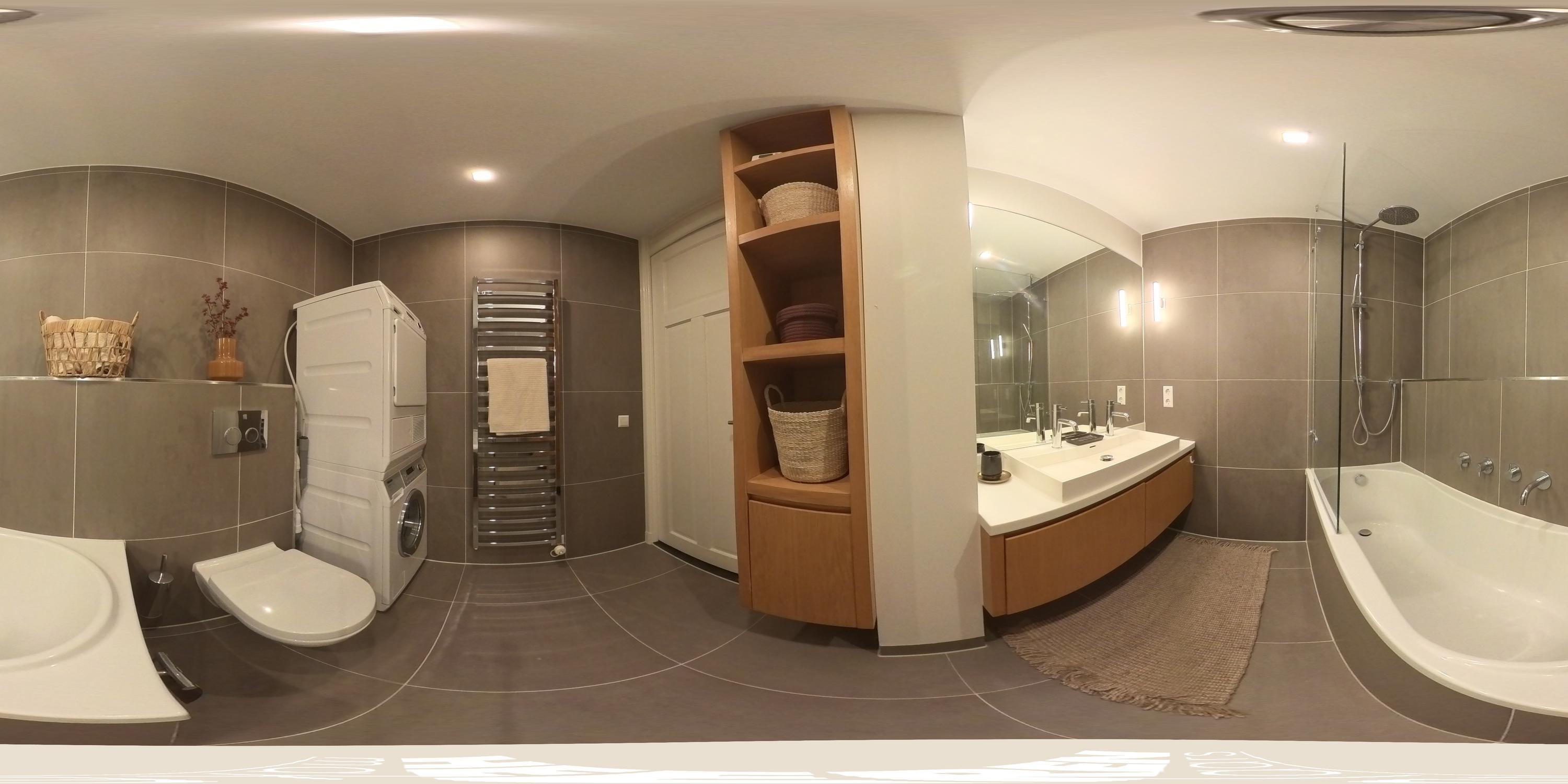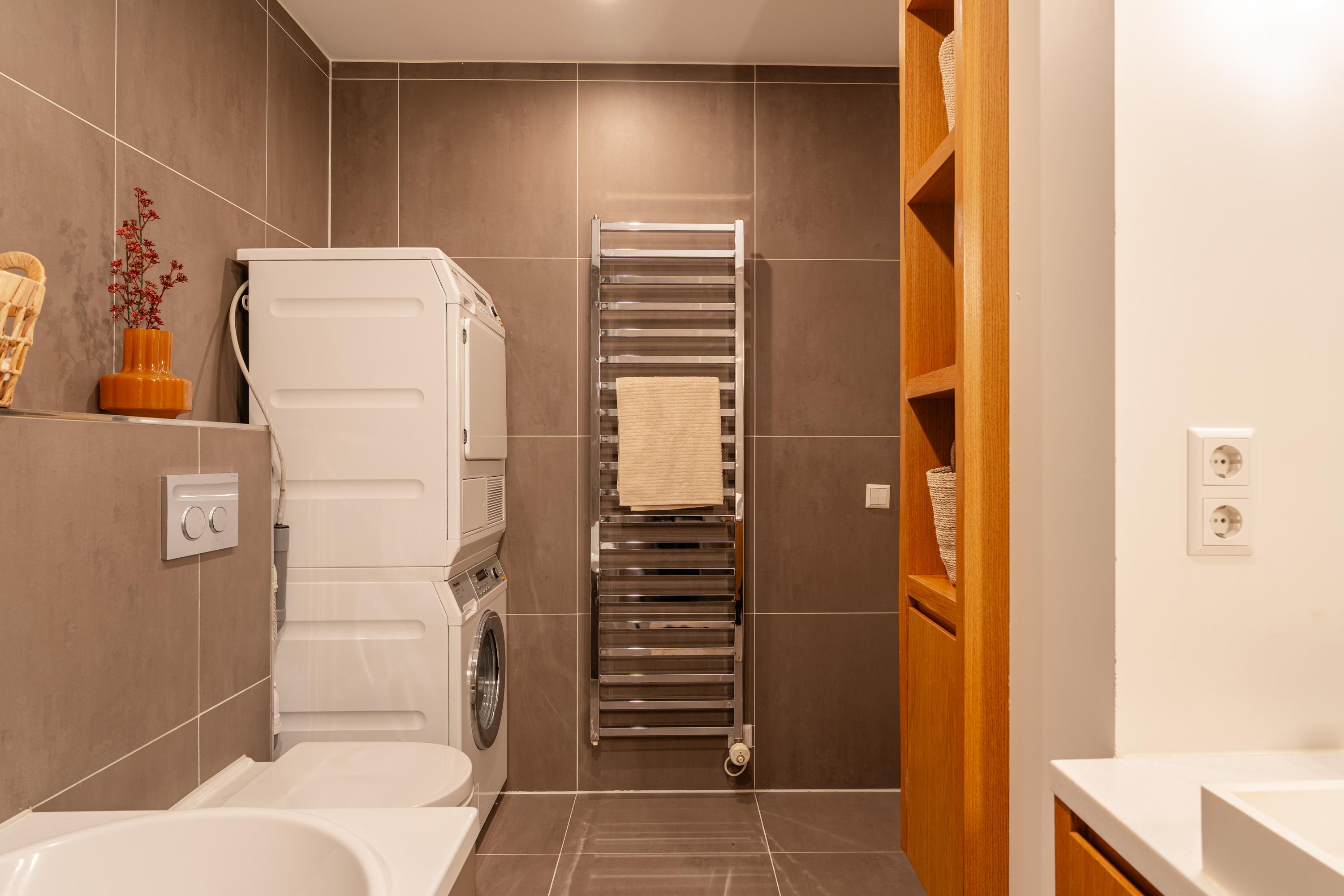 The modern bathroom is fitted with a spacious bathtub, a double washbasin with vanity unit and a toilet. This floor also houses the connections for a washing machine and dryer.