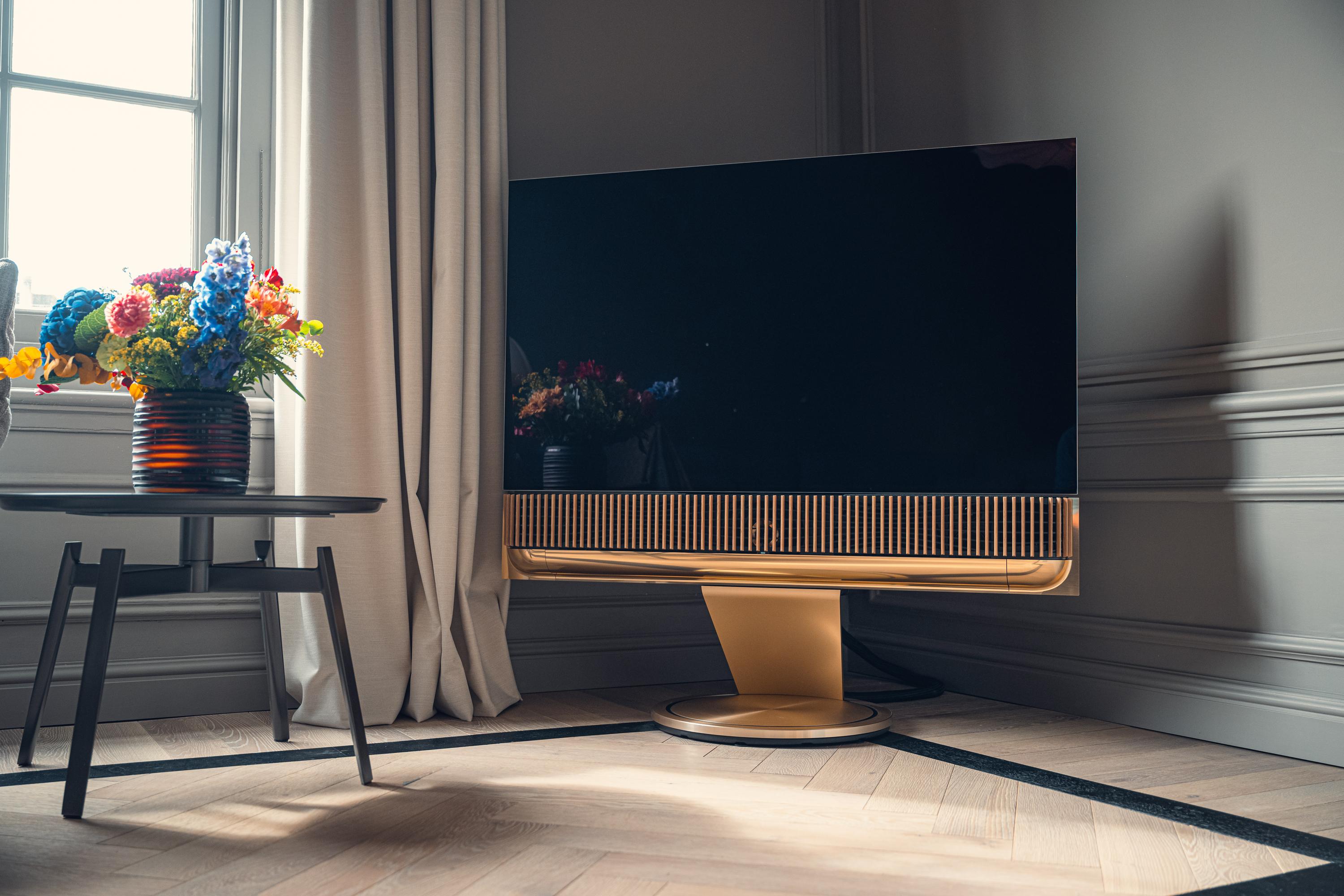 At the rear is the modern kitchen, finished in a gold-toned color that contrasts beautifully with the warm wooden flooring and neutral walls. The kitchen is equipped with high-quality Miele built-in appliances, Quooker, Bora induction cooktop, and offers ample cupboard space. With its open connection to the living room, the space remains light and inviting—perfect for those who enjoy cooking and entertaining.