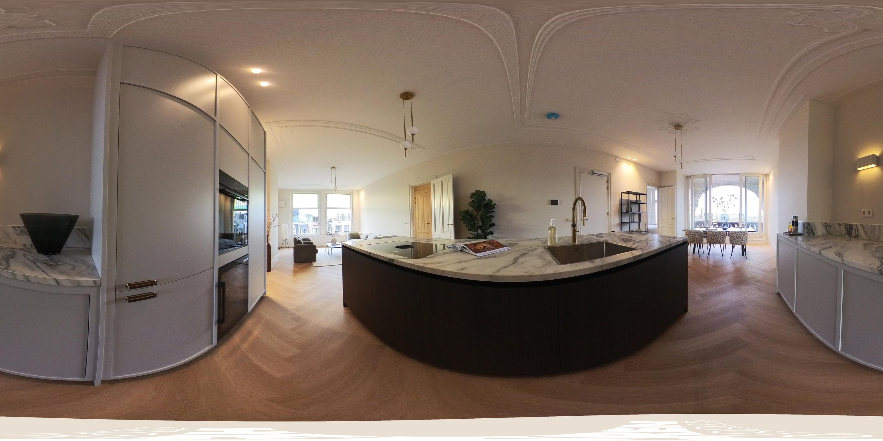 This luxurious apartment is located on the third floor and is characterised by a spacious and open layout, with large windows at both the front and rear providing pleasant natural light throughout the day. The apartment is finished to a high standard and offers a comfortable living environment with a calm and refined atmosphere. The living room is situated at the front of the apartment and features a ceiling height of approximately 3.07 metres. Together with the kitchen and dining area, it forms one generous open-plan living space. The luxurious kitchen is centrally positioned within the apartment and is designed around a spacious cooking and sink island, fitted with an induction hob, sink and Quooker. In addition, the kitchen is equipped with a refrigerator, freezer, combi oven, climate cabinet and ample cupboard space. The island also functions as a comfortable bar area. At the rear of the apartment is the covered balcony, offering attractive views over the green gardens at the back and providing a peaceful outdoor space to relax. At the front of the apartment, the hallway provides access to the first bedroom, the separate toilet, the laundry/storage room and the first bathroom. This bathroom is fitted with a walk-in shower and a double washbasin with vanity unit. The second bedroom is located at the rear of the apartment and features fixed wardrobe space and an en-suite bathroom, equipped with a walk-in shower and a washbasin with vanity unit.