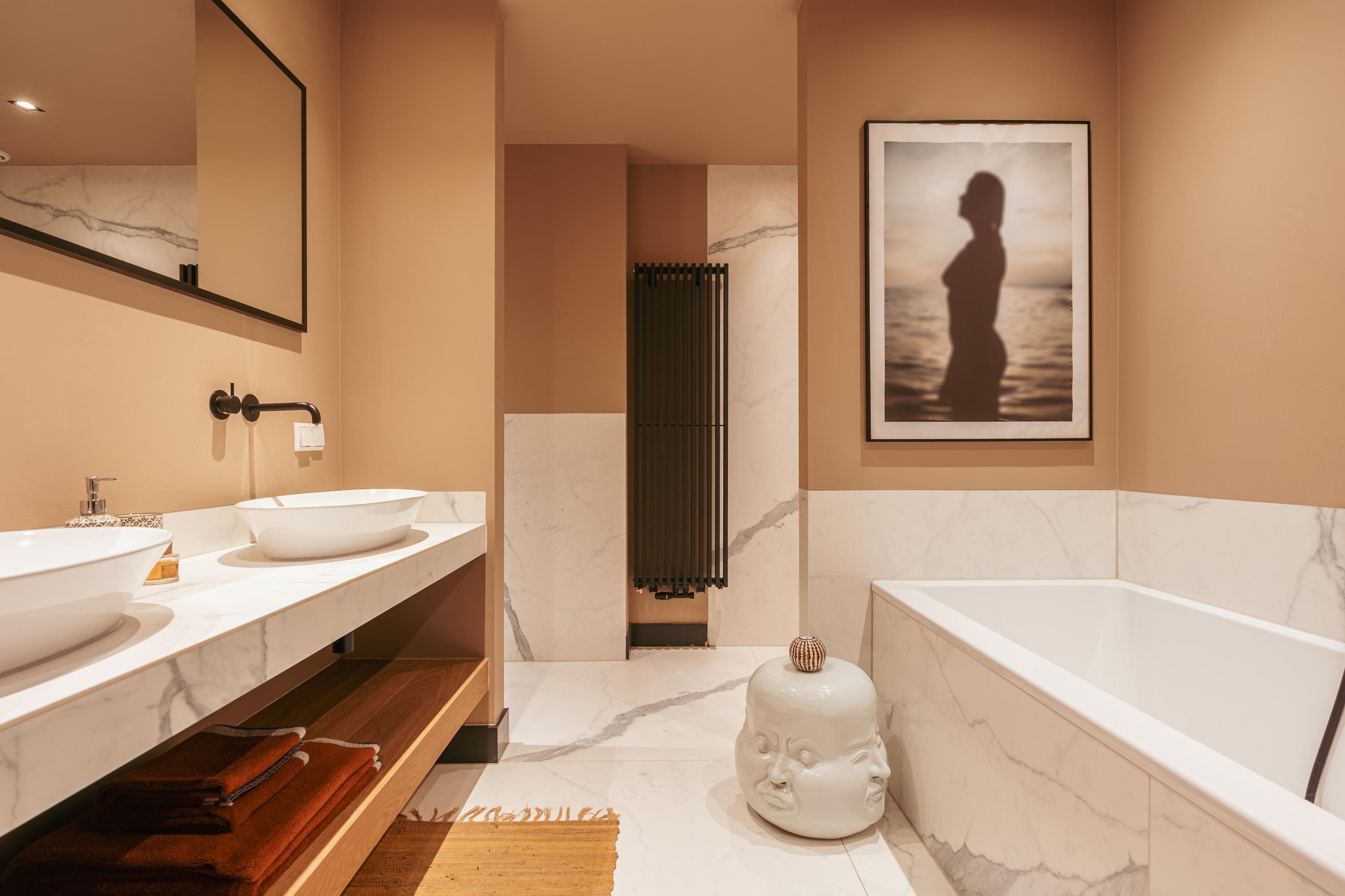The bathroom is centrally located and features a bathtub, walk-in shower, double washbasin with vanity unit, and a toilet. In addition, there is a separate toilet with a washbasin, accessible from the hallway. The hallway also provides access to a practical storage area with connections for a washing machine and dryer.