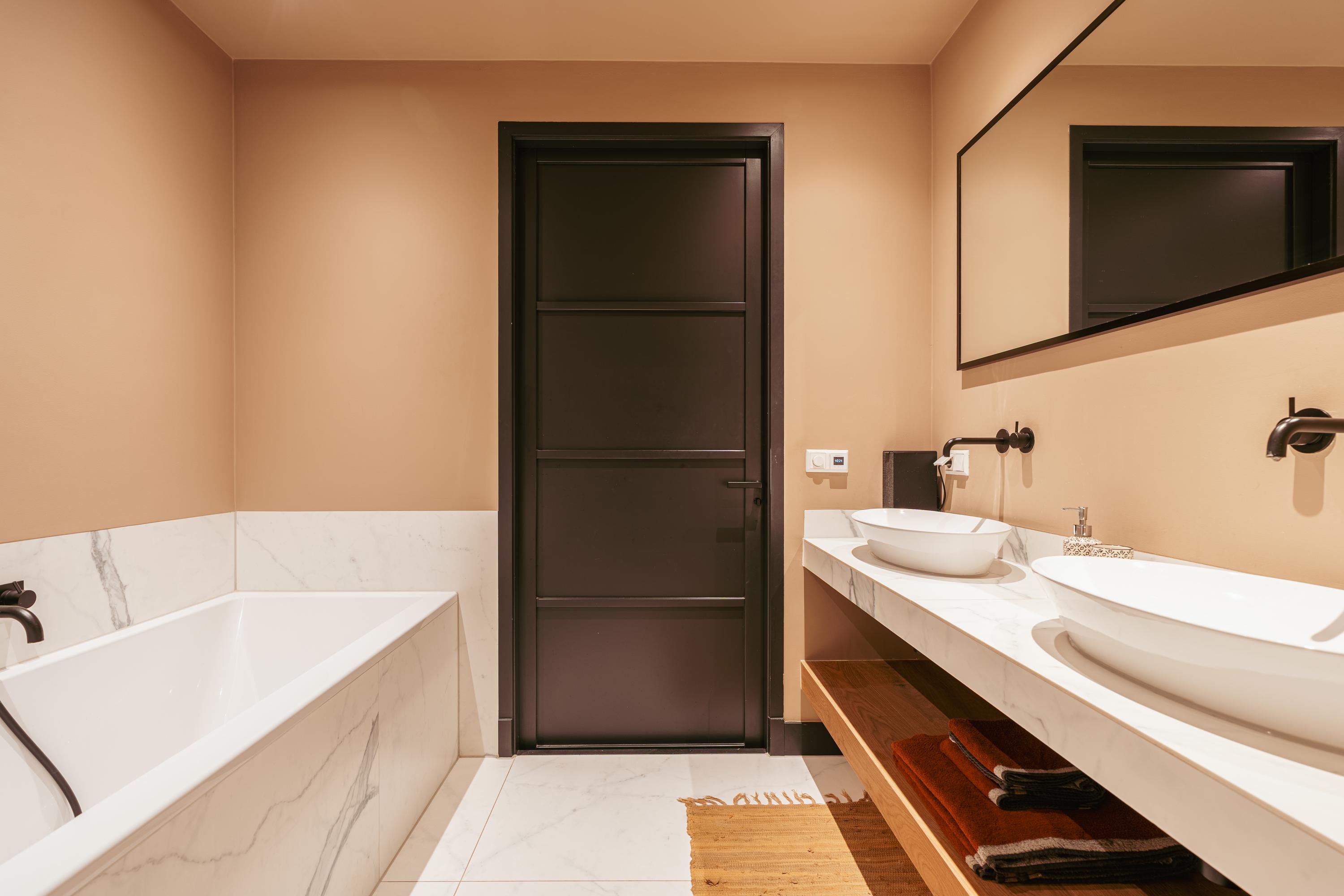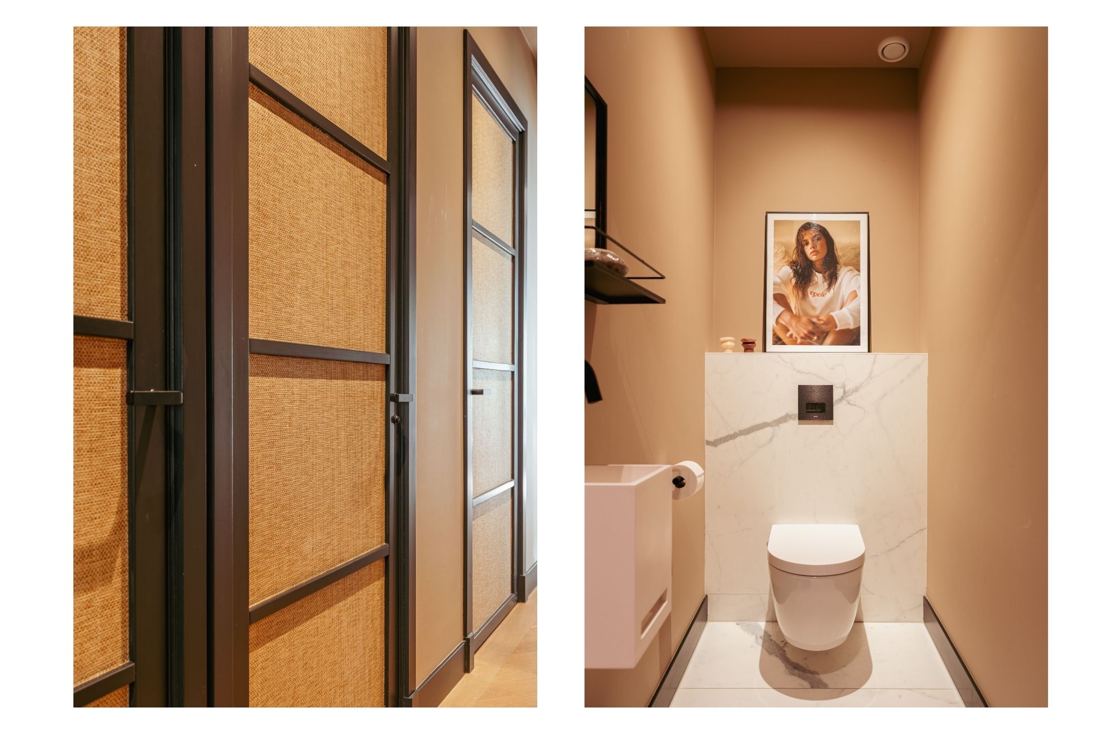 Via the private entrance at street level, you enter the apartment into a hallway that provides access to the various rooms. At the rear of the property is the spacious and bright living room, which flows seamlessly into the dining area. This generous living space easily accommodates both a comfortable seating area and a large dining table. Thanks to the large windows and French doors opening onto the garden, there is an abundance of natural light and a pleasant connection between indoor and outdoor living. The clean finishes and well-considered styling give the space a modern and tranquil feel.