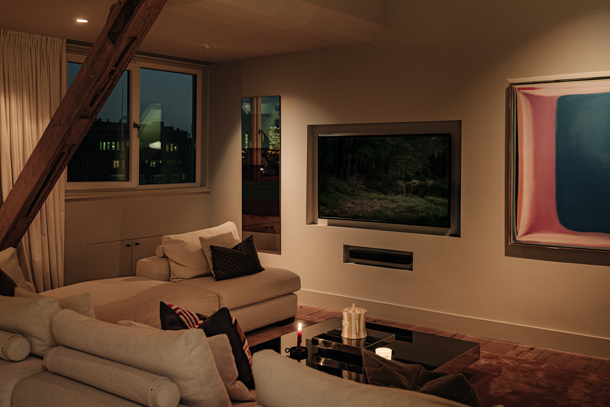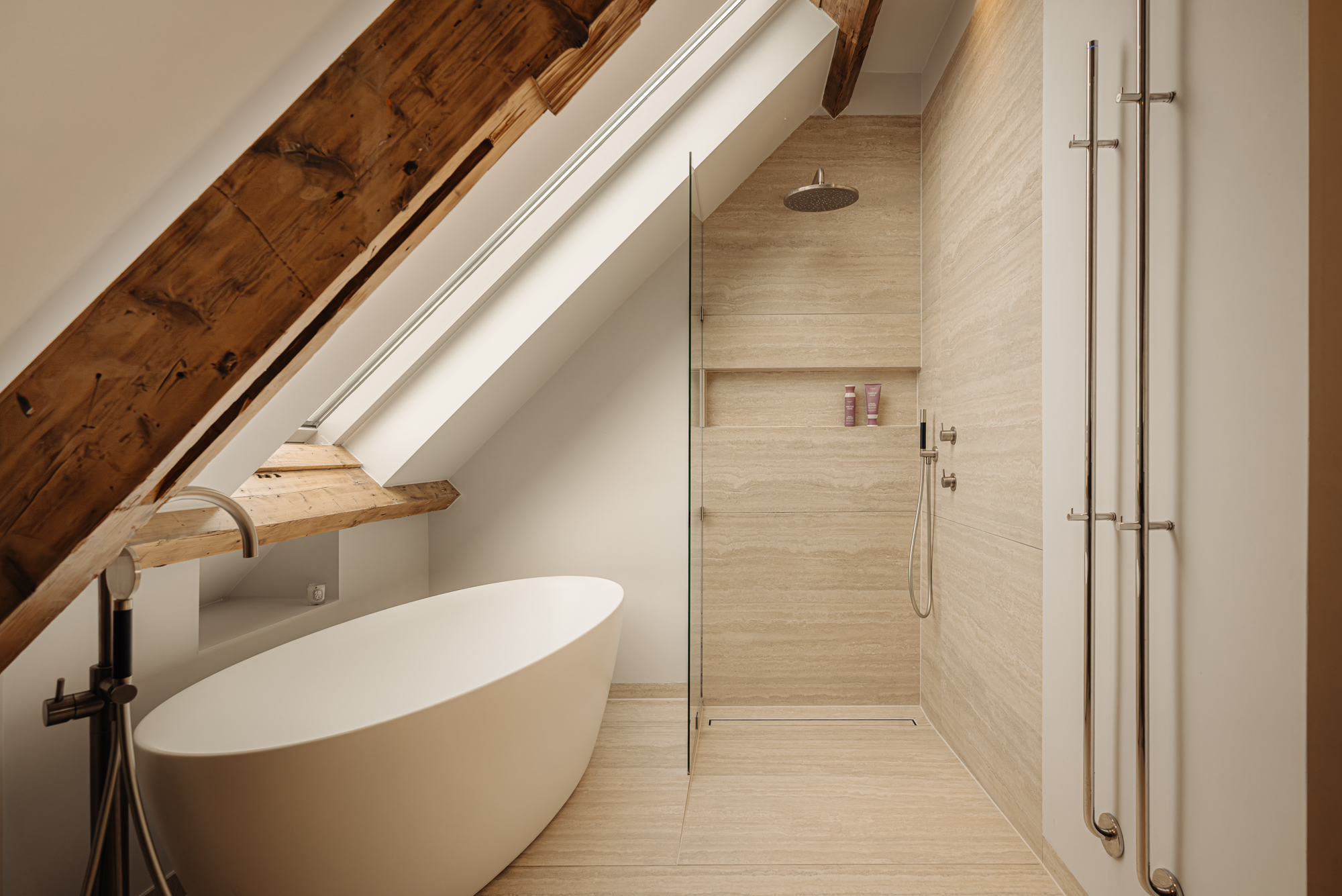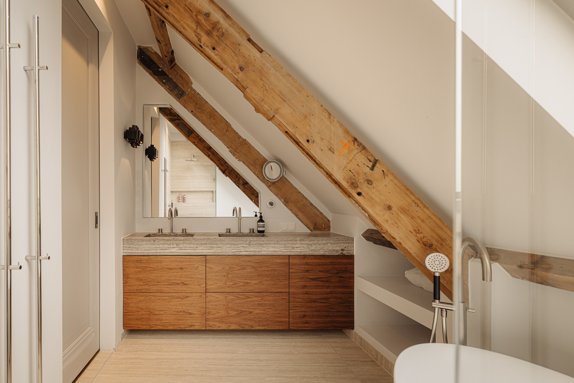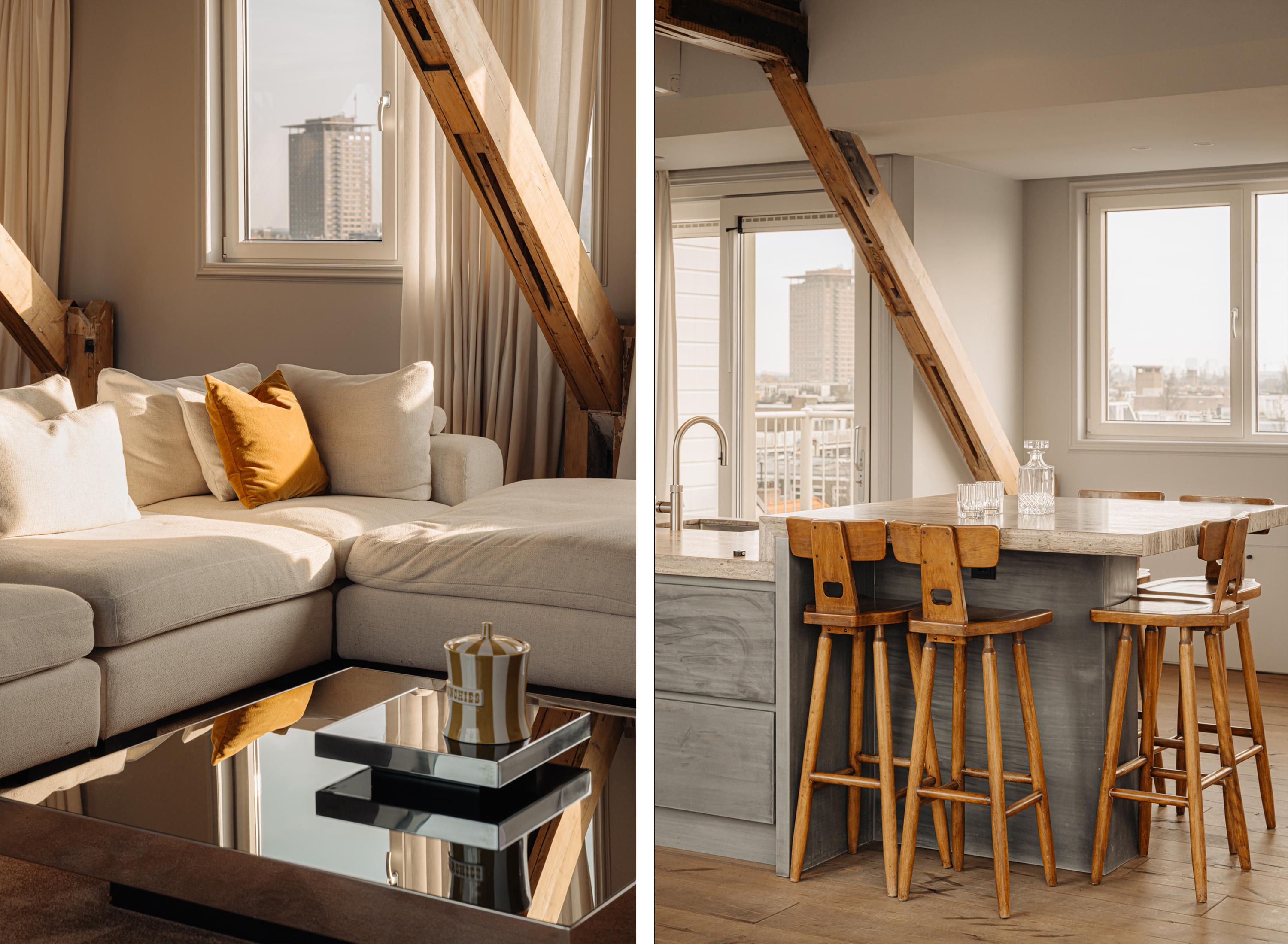 Upon entering, you immediately notice the spacious and light-filled design of the apartment. The living room features a charming south-facing balcony and large windows on both sides, allowing plenty of natural light and offering a panoramic view of the city. The visible wooden beams add character, while the elevated seating area creates a cosy space to relax. An air conditioning unit is installed above the kitchen, which boasts a large cooking island with a natural stone worktop and high-end built-in appliances, including a four-burner induction hob with extractor, a dishwasher, a fridge-freezer combination, a Quooker, and a built-in wine climate cabinet. A stylish raised bar area is integrated into the kitchen island. The dining area comfortably accommodates a large table, benefiting from ample natural daylight through the expansive windows.