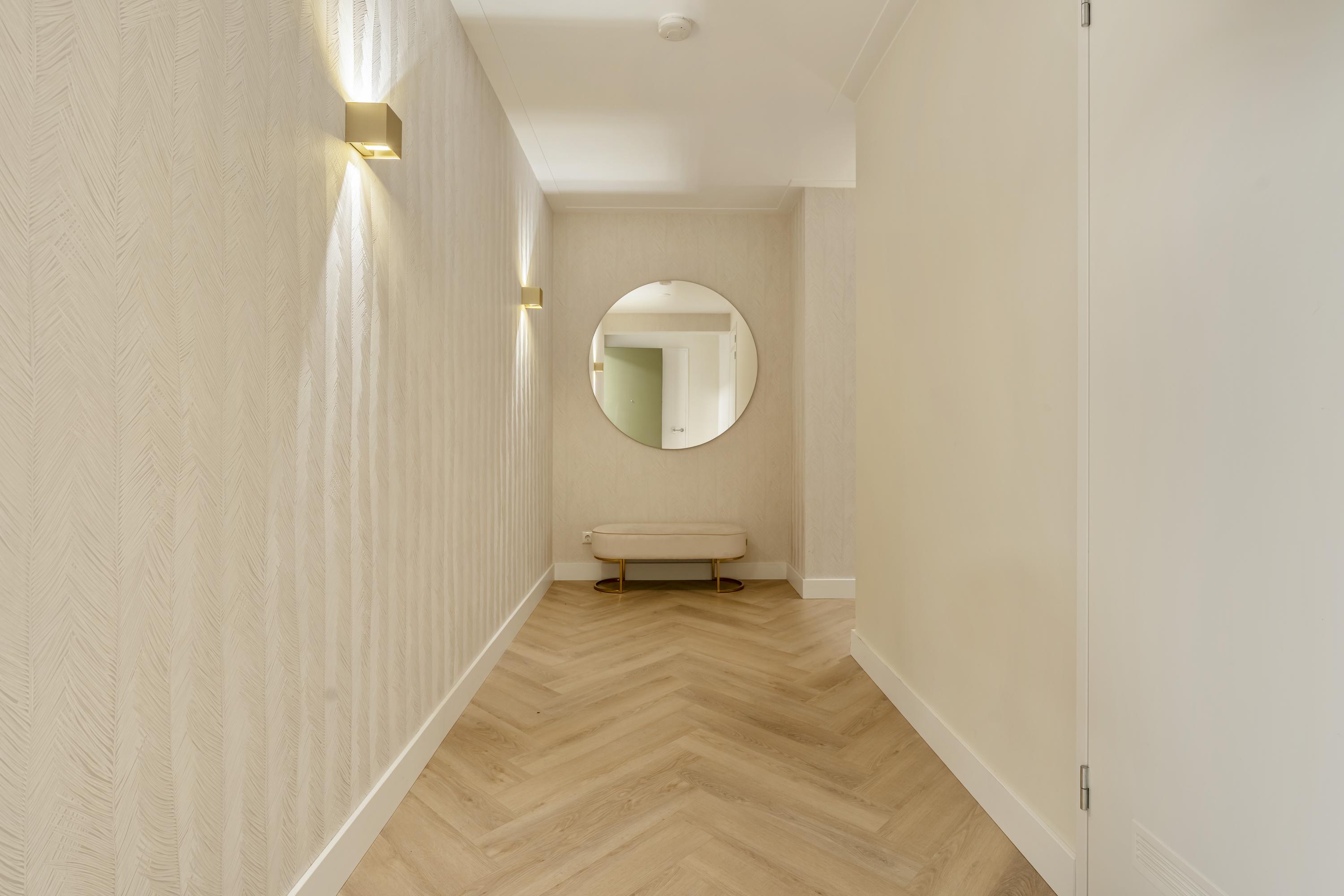 Bij binnenkomst in de ruime hal valt direct de verzorgde afwerking op: een lichte visgraatvloer, zachte tinten en subtiele wandverlichting geven het geheel een rustige, moderne uitstraling. De hal biedt toegang tot alle vertrekken en beschikt over een ruime berging, een aparte wasruimte met aansluitingen voor wasmachine en droger en een separaat toilet met fontein. De drie naast elkaar gelegen slaapkamers zijn licht en sfeervol dankzij de hoge ramen en warme kleurtonen. De kamers zijn goed bemeten en voorzien van imposante raampartijen.