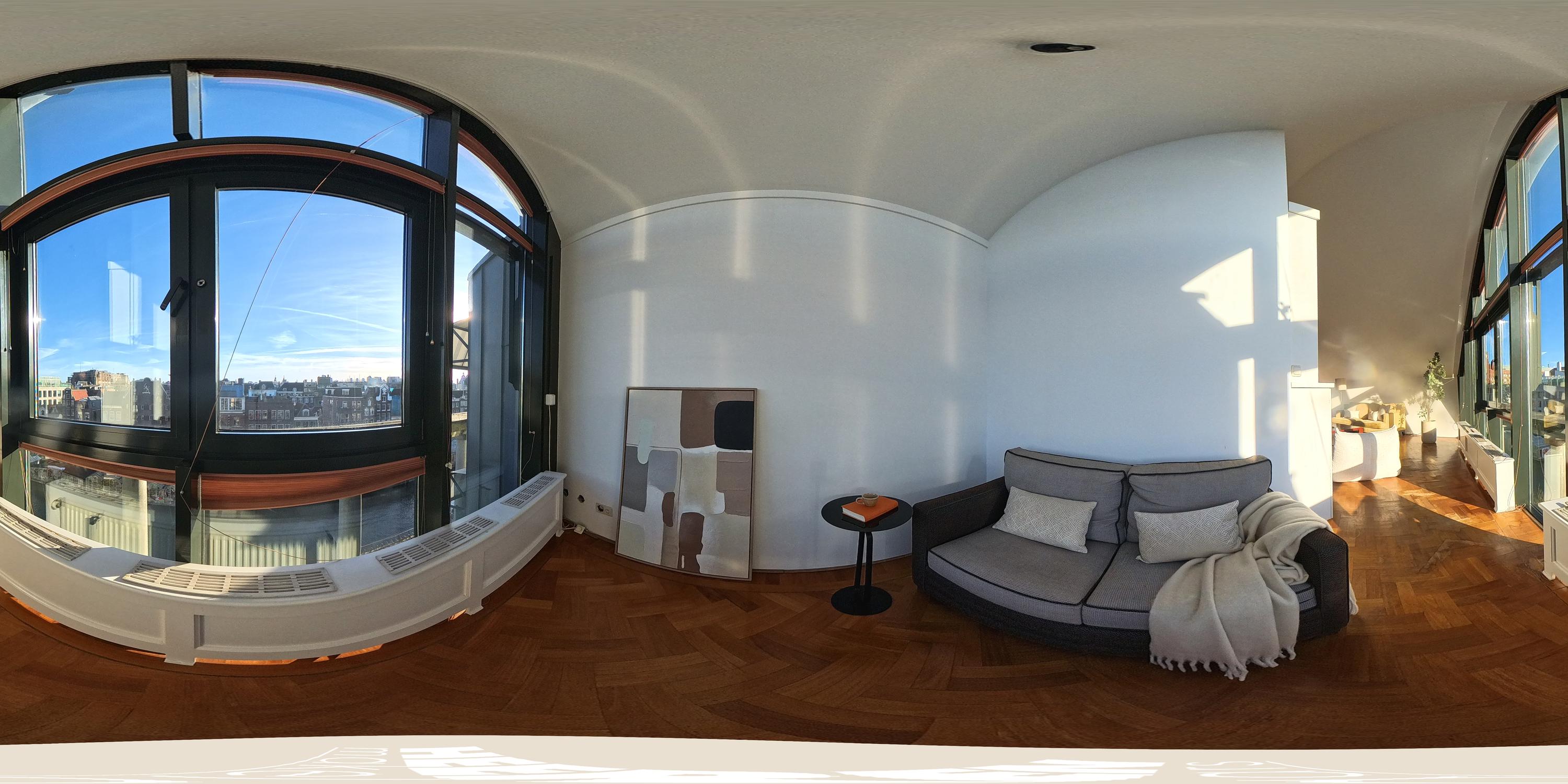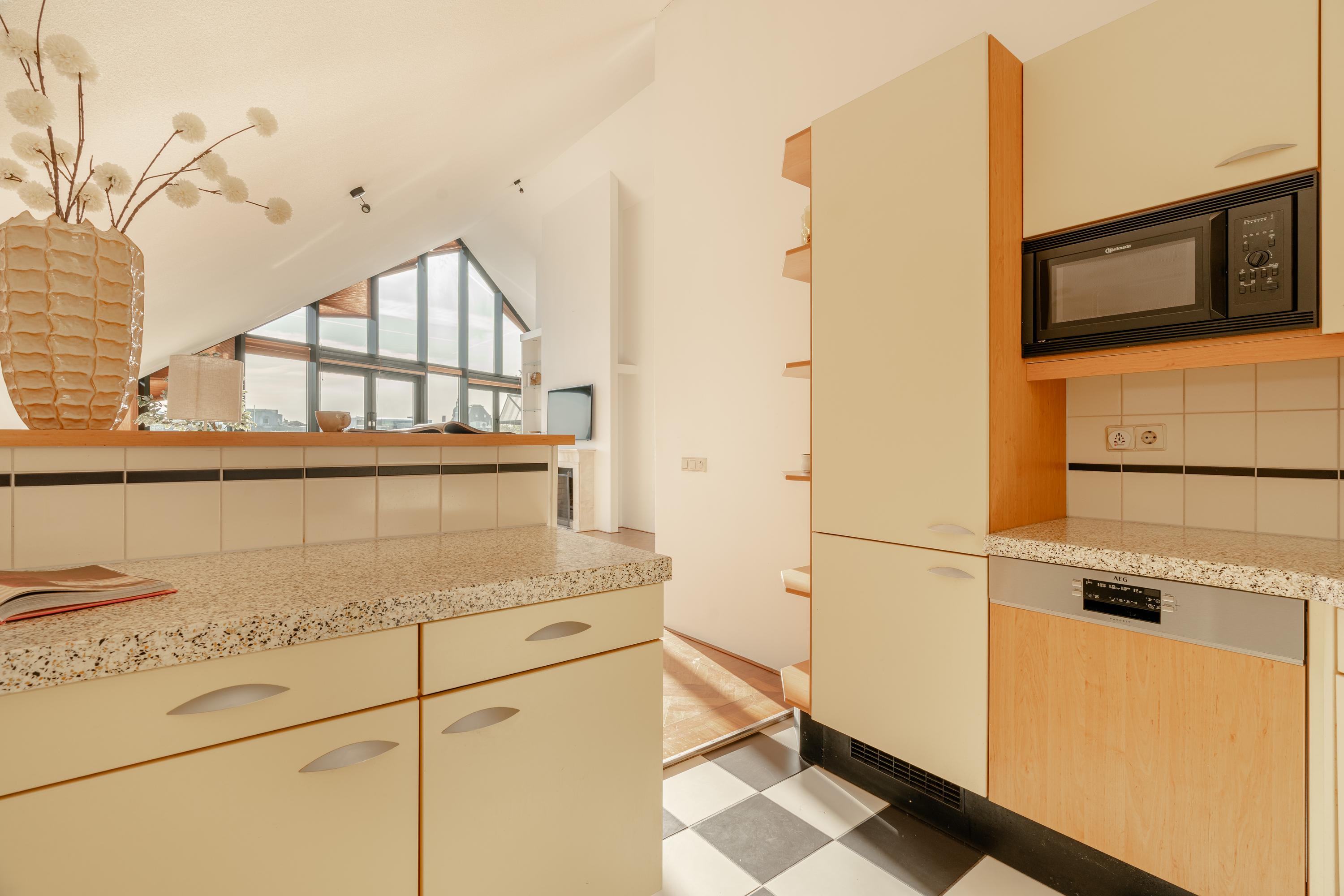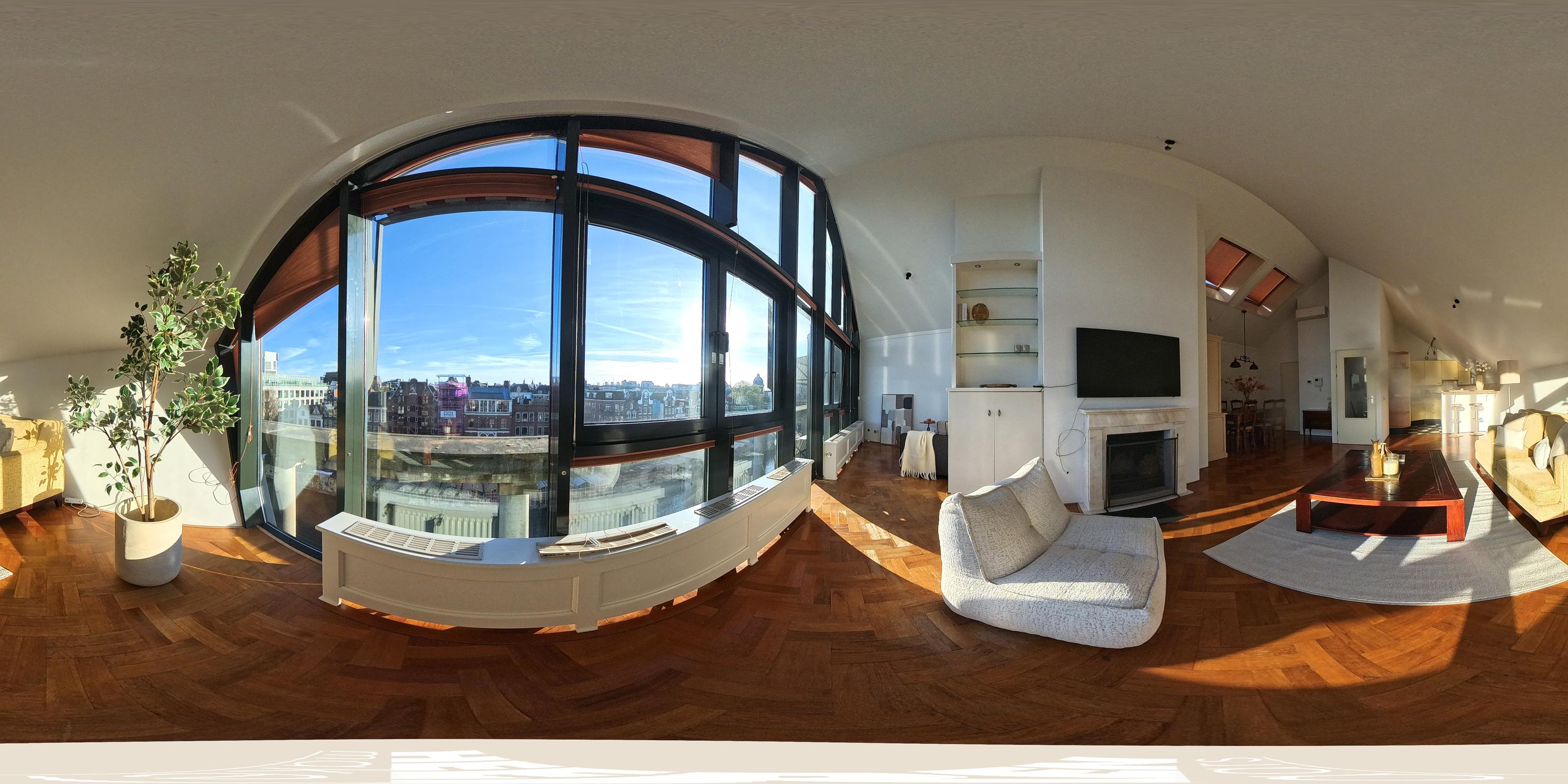 The apartment’s living level occupies the top floor, where large windows and generous ceiling heights invite daylight to animate the interiors. The living room opens to far-reaching views across the Singel and the city’s celebrated Flower Market, setting an atmosphere of refined urban calm. A half-open kitchen, complete with built-in appliances and an adjacent storage area, seamlessly connects to the dining space, ideal for gathering and entertaining.