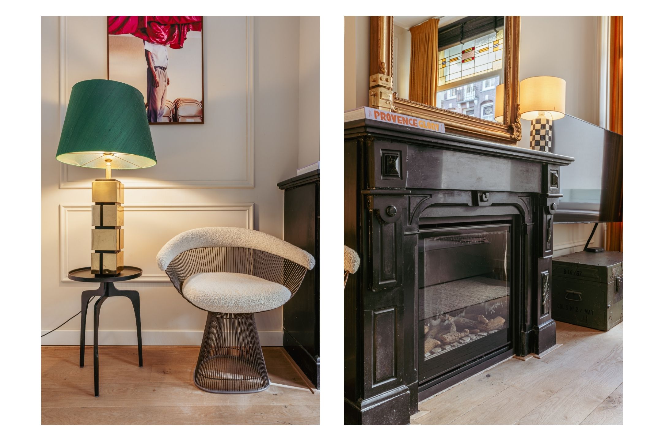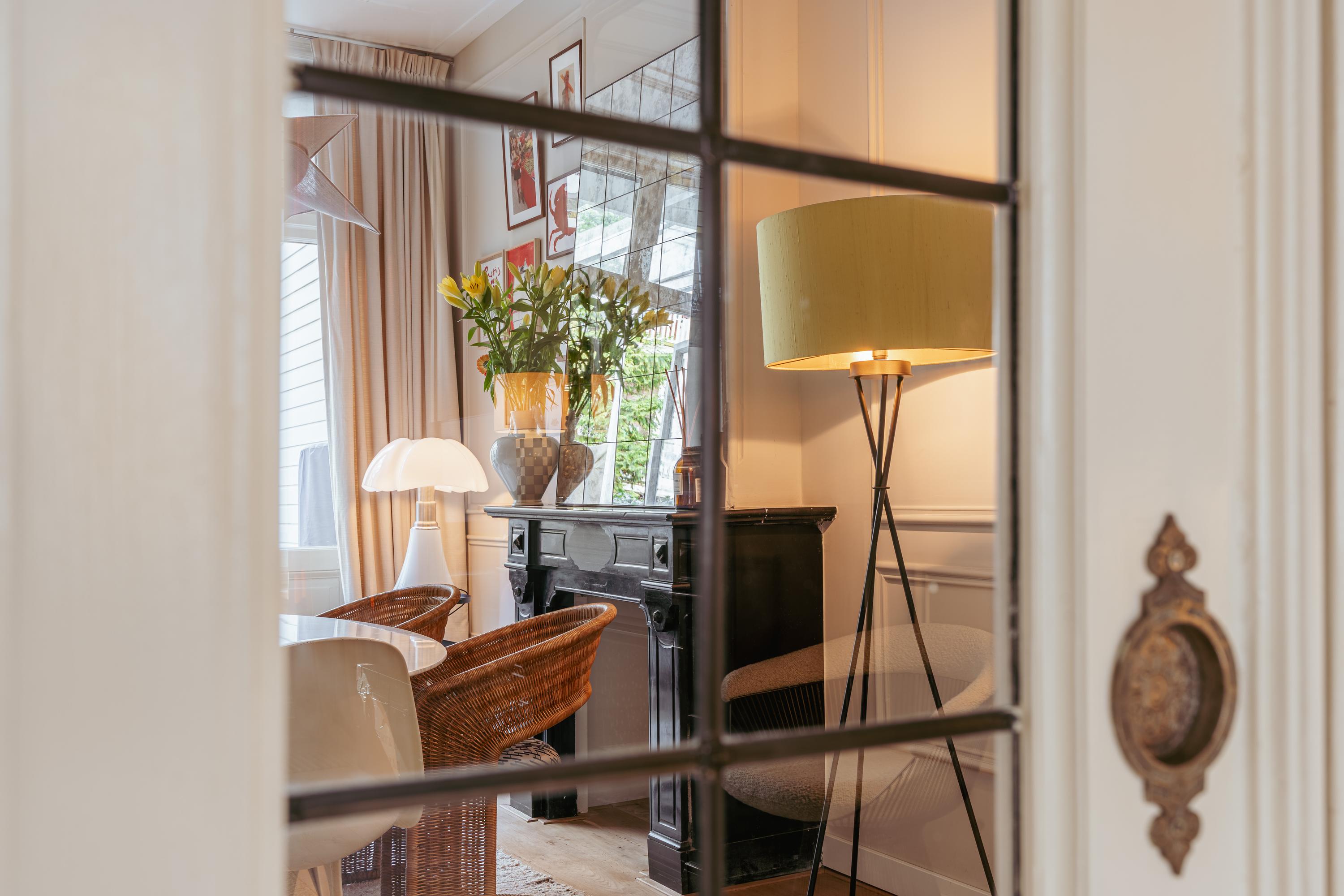 At the front is the living room, featuring beautiful built-in cabinets. Large windows with stained glass provide stunning natural light and enhance the authentic atmosphere. The original fireplace forms a stylish centerpiece of the room. Adjacent, separated by sliding doors, is the dining room. Here too, you will find a characteristic fireplace and built-in cabinets. Thanks to the French doors, there is plenty of daylight, and in summer a seamless connection between indoor and outdoor living is created. Both rooms are spacious and can be used either as an open or separate layout.